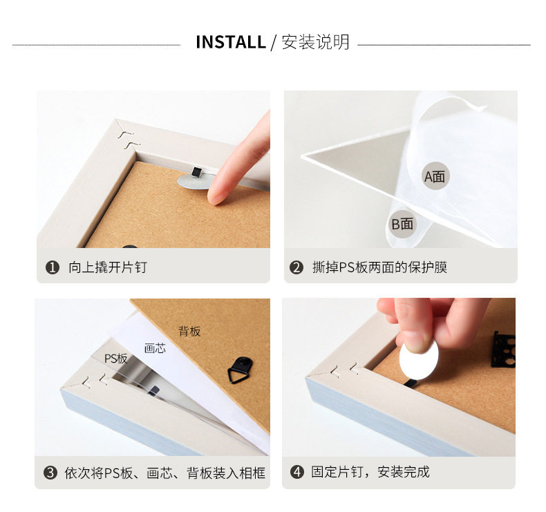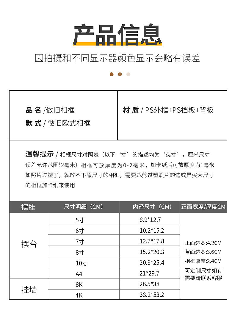 | Outer frame size | 5 inch table [can hold 8.9*12.7cm],6 inch table [can hold 10.2*15.2cm],7 inch table [can hold 12.7*17.8cm],8 inch table [can hold 15.2*20.3cm],10 inch table [can hold 20.3*25.4cm],A4 table [can hold 21*29.7cm],4 Open wall hanging [can put 38*53cm],8 Open wall hanging [can put 26.5*38cm] |