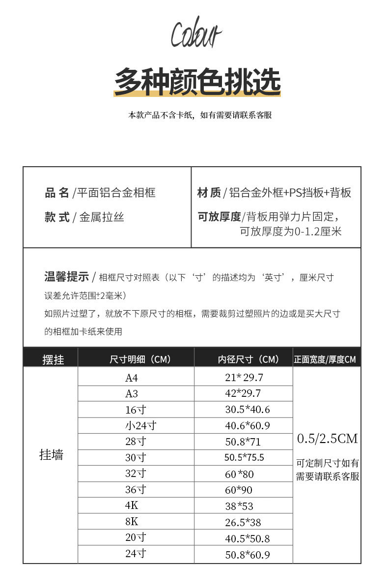 | Outer frame size | 7 inch table [12.7*17.8cm],8 inch table [15.2*20.2cm],A4 hanging type [can hold 29.7*21cm],12inch wall hanging [can hold 25.4* 30.2cm ],14 hanging type [can hold 27.9* 35.5cm ],A3 hanging type [can hold 29.7*42cm],16 inch hanging type [can put 30.5*40.6cm],20 inch hanging type [can put 40.5*50.8cm],24 inch hanging type [can put 50.8*60.9cm],Small 24-inch hanging type [can hold 40.6*60.9cm],28 inch hanging type [can hold 50.8*70.8cm],30 inch hanging type [can put 50.5*75.5cm],32 inch hanging type [can put 60*80cm],36 inch hanging type [can put 60*90cm],4 Open hanging type [can put 38*53cm],8 Open hanging type [can hold 26.5*38cm],A2 wall hanging [can put 59.4*42cm] |