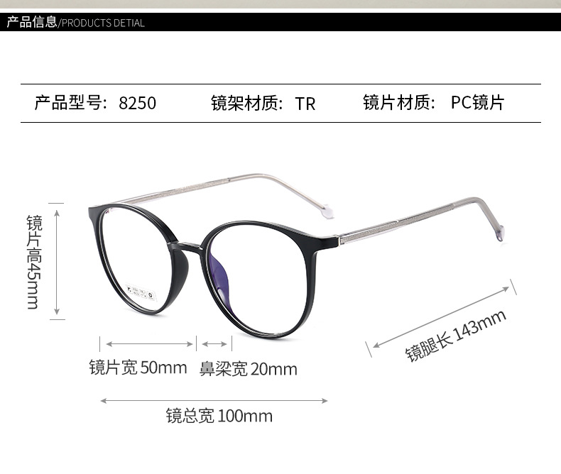 8250 light soft TR90 glasses frame men's and women's retro insert fashion leg anti-blue light glasses flat light non-power lenses