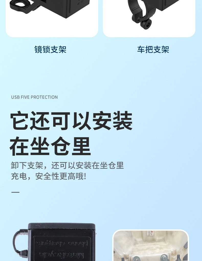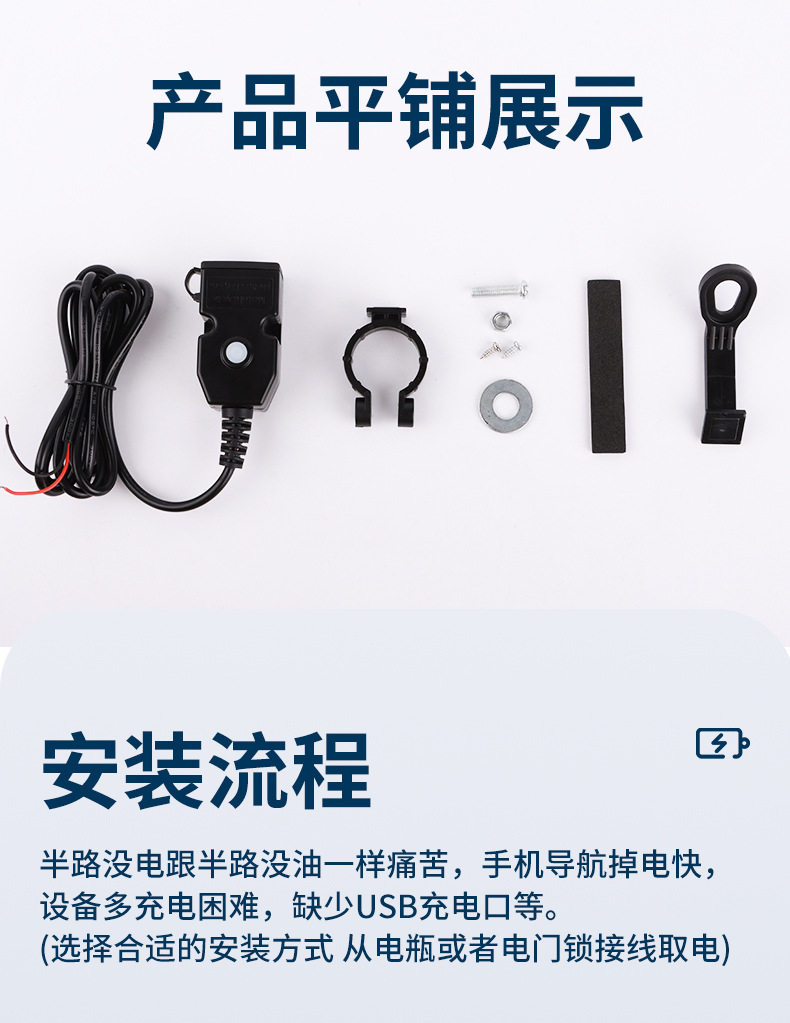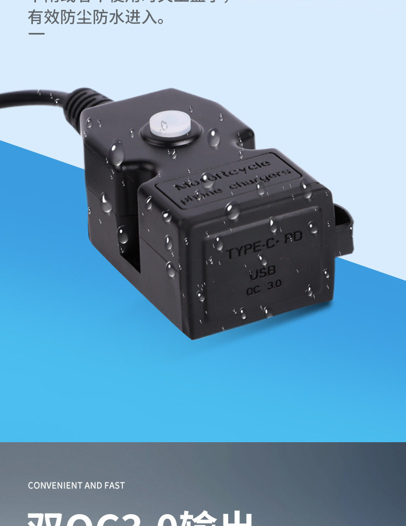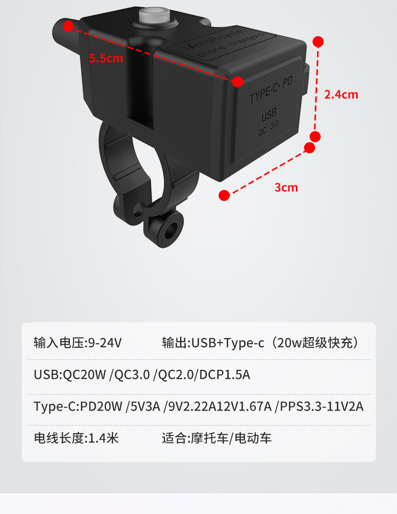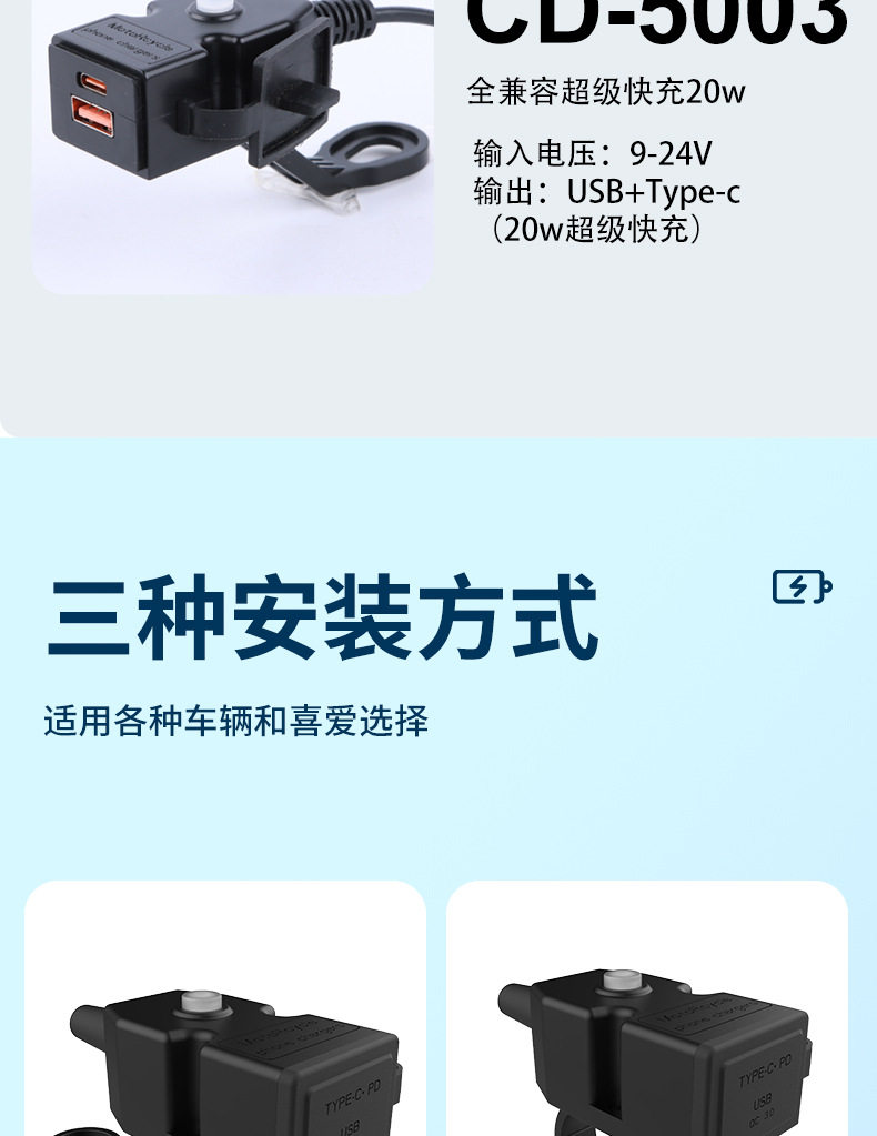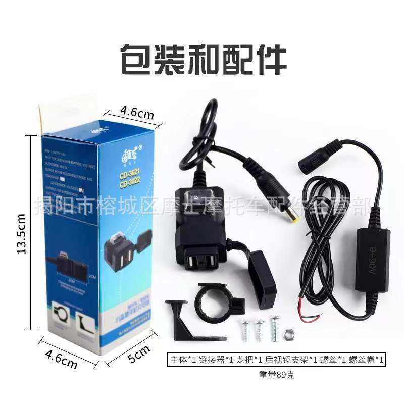 | Model | 3021 (9~24v) 2.1a slow charging (for motorcycles only),3022 (9~90v) 2.1a slow charge (motorcycle electric vehicle),5002(9-24)3.1a fast charging (for motorcycles only),5003 (9-24) 20w super fast charging (for motorcycles only) |