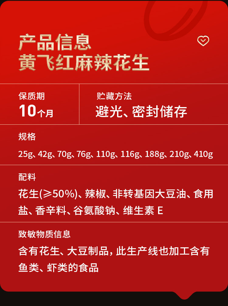 | Packaging specifications | [recommended] spicy peanuts 25g*5 packs,Spicy peanuts 42g [60 packs/box],Spicy peanuts 70g [36 bags/box],Spicy peanuts 76g [30 bags/box],Spicy peanuts 110g [30 bags/box],Spicy peanuts 116g [24 packs/box],Spicy peanuts 210g [16 packs/box],Spicy fish peanuts 98g [please take 24 packs for the whole box],Spicy shrimp peanuts 98g [please order 24 packs for the whole box],Crispy pepper 55g [please order 36 packs for the whole box],Crispy pepper 158g [please take 20 packs for the whole box],Crispy pepper 308g [please take 10 packs for the whole box],76g salt and pepper peanuts [non-spicy] |
