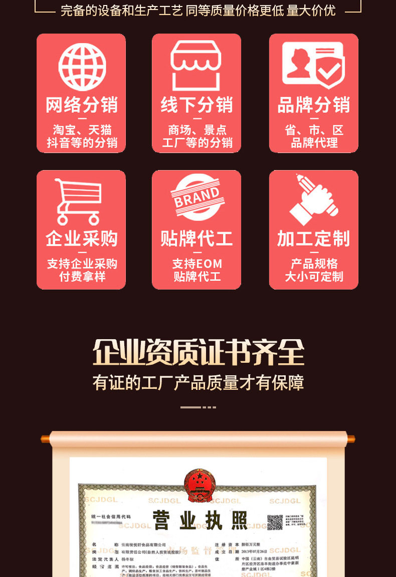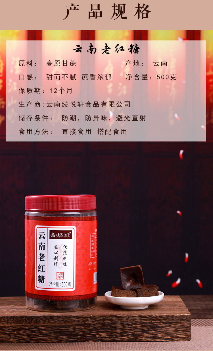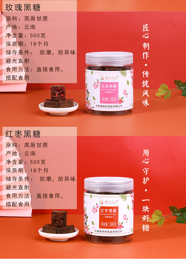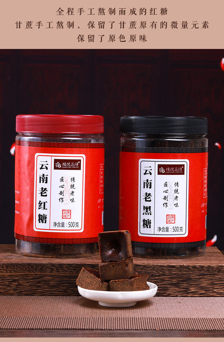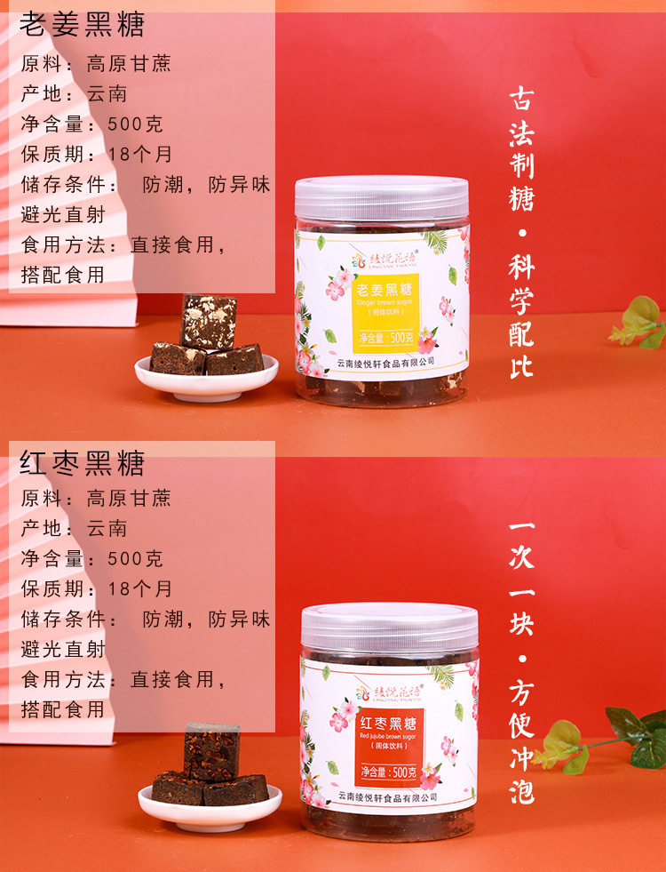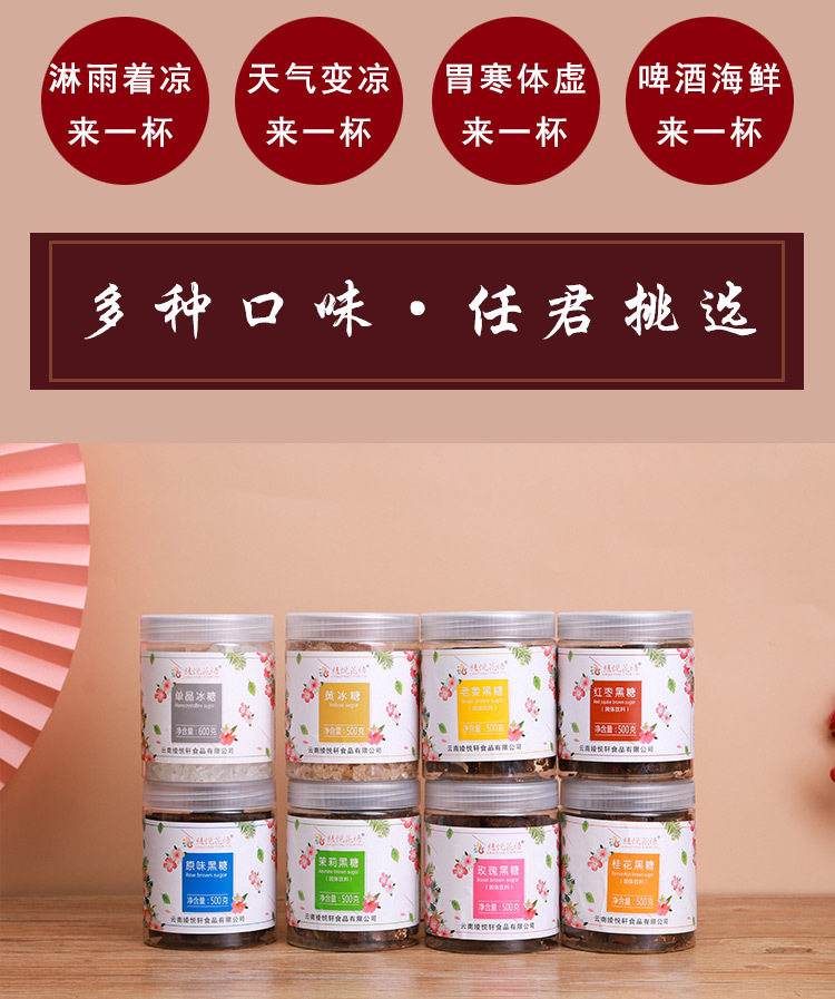 | Packaging specifications | 500g old brown sugar bottle,500g old brown sugar bottle,500g ginger brown sugar bottle,500g osmanthus brown sugar bottle,500g original brown sugar bottle,500g rose brown sugar bottle,500g jasmine brown sugar bottled,500g red date brown sugar bottle,500g yellow rock sugar bottle,600g single crystal rock sugar bottle |