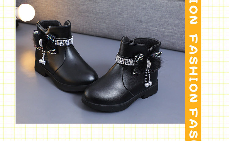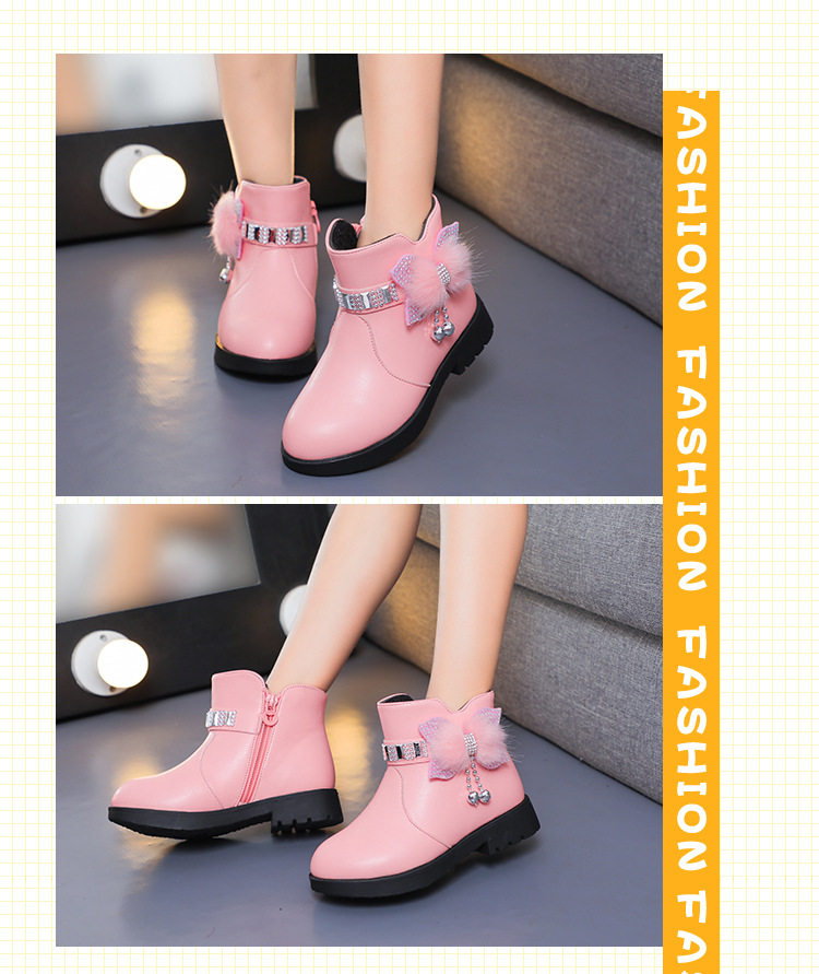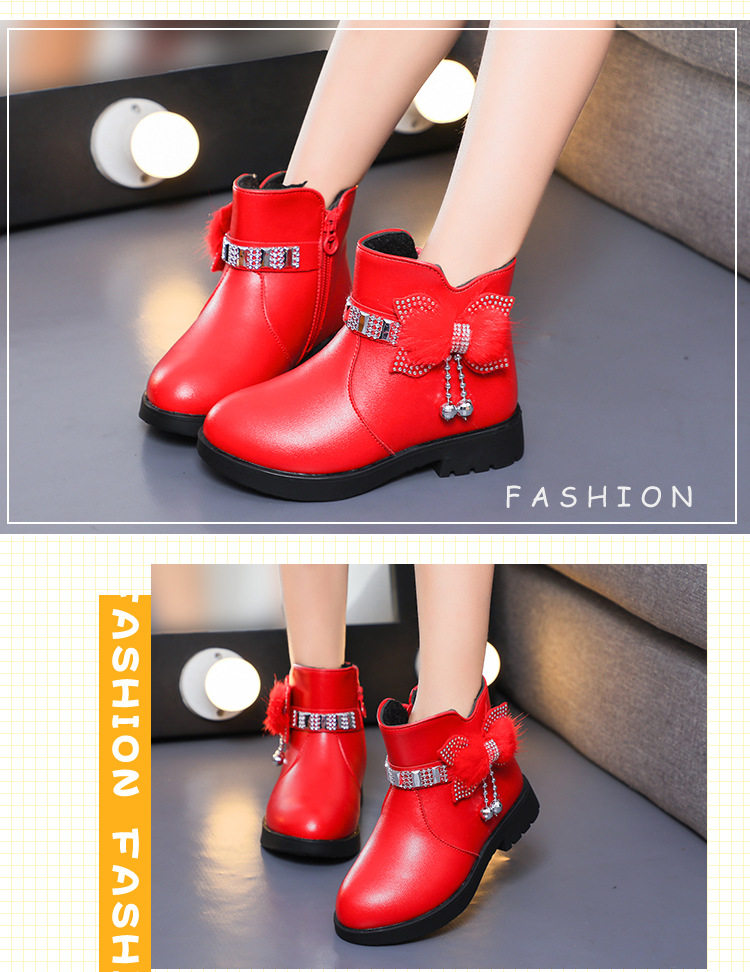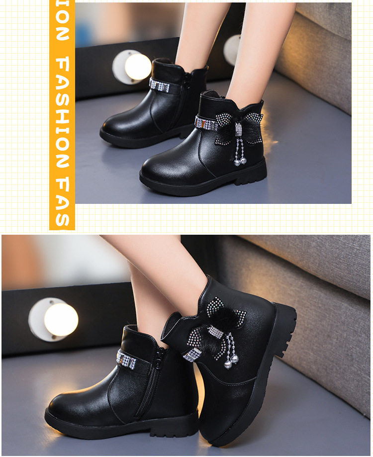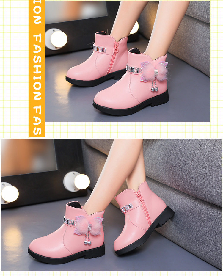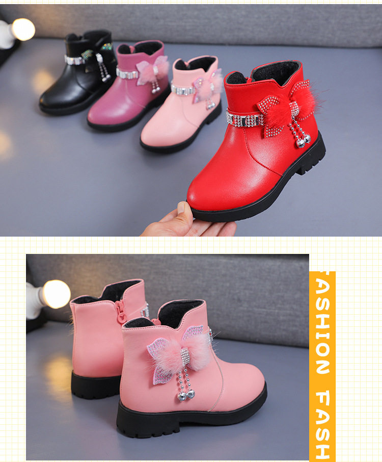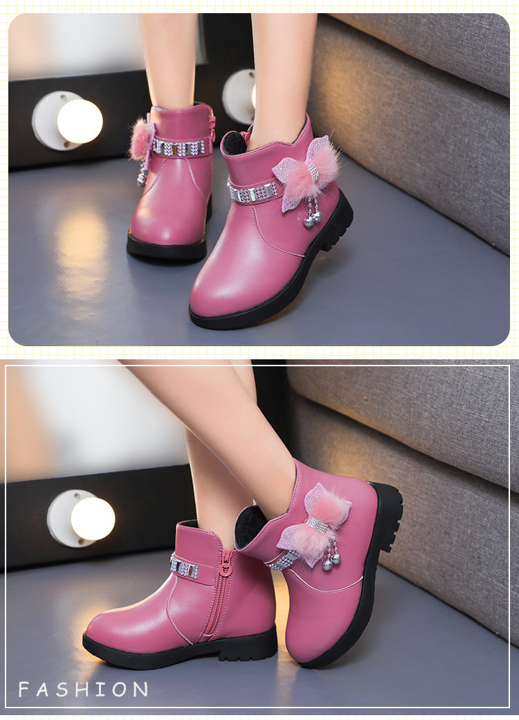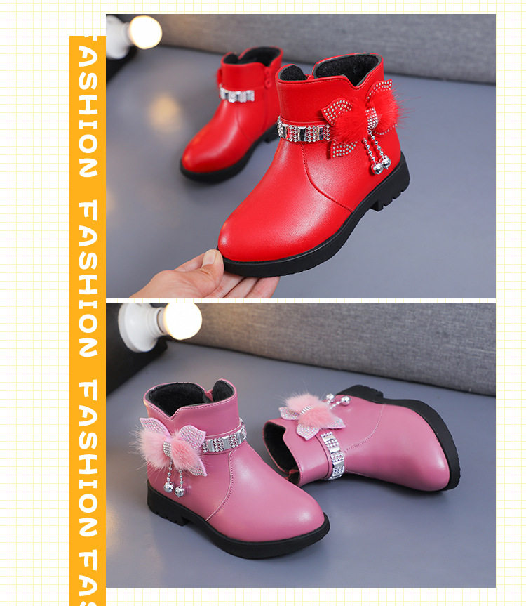 Children's Cotton Boots Princess Fashion Bow Baby Warm Leather Boots 2025 Winter Girls Rhinestone Mid-Calf Short Boots