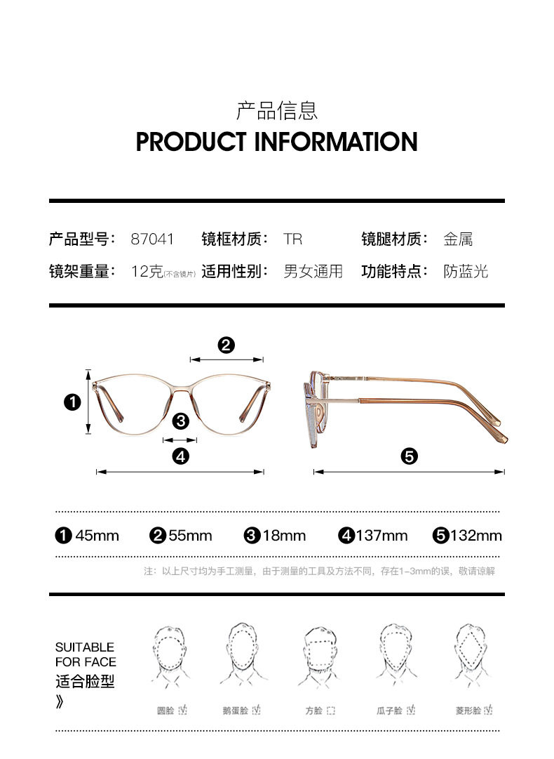 87041 TR90 flat lens optical glasses anti-blue light glasses frame cross-border fashion glasses anti-computer radiation