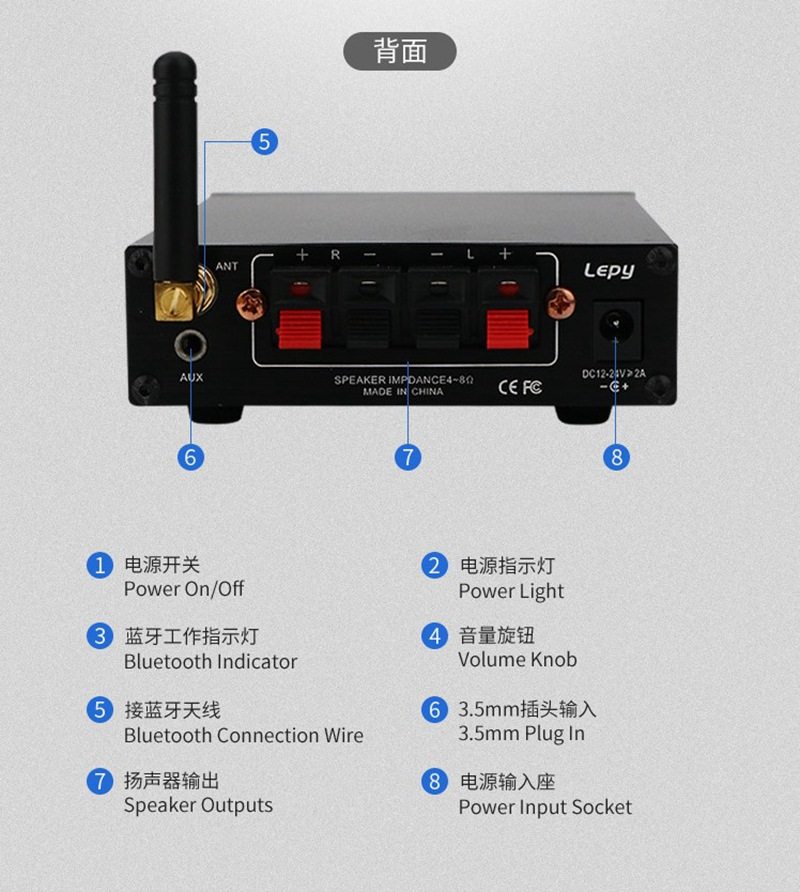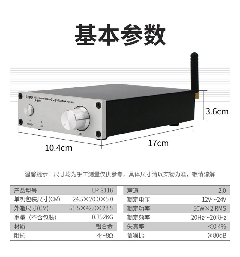 | Packing List | Power amplifier host + Power Adapter + audio cable + English manual |