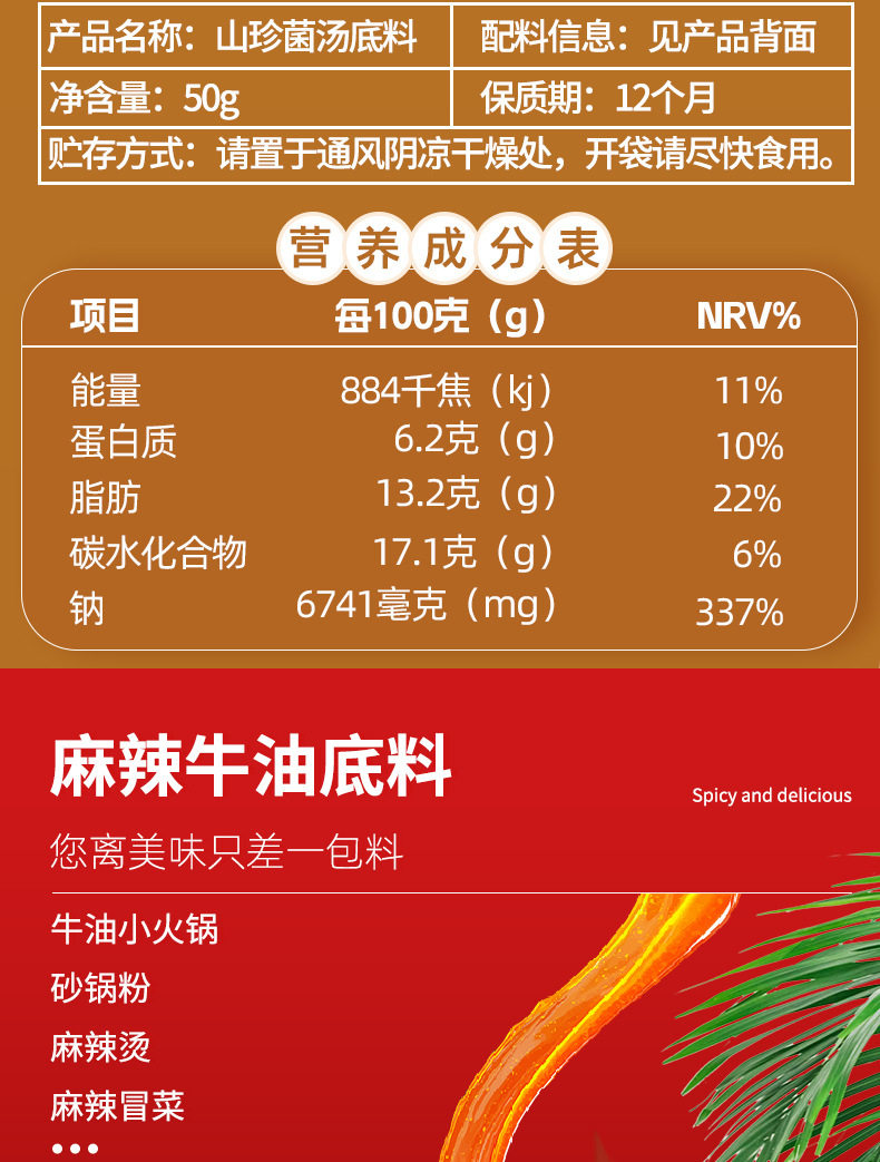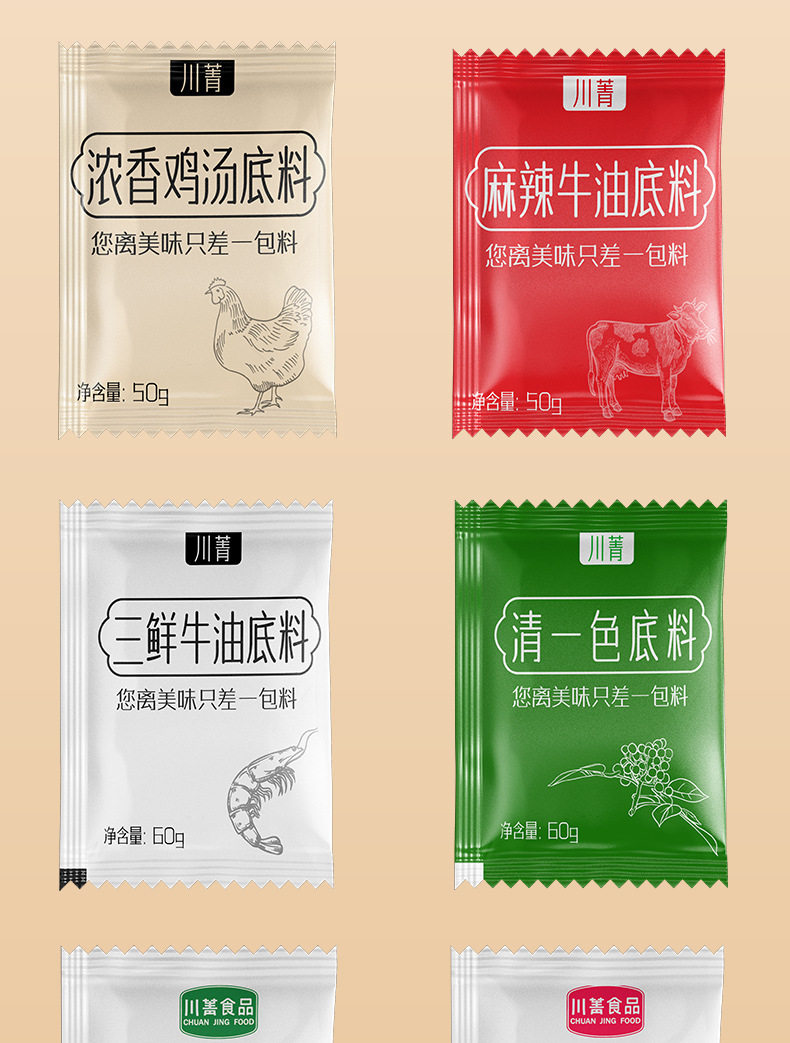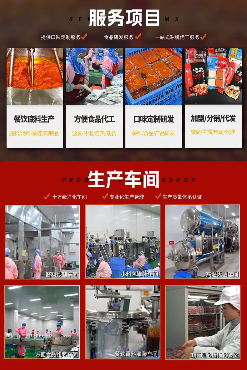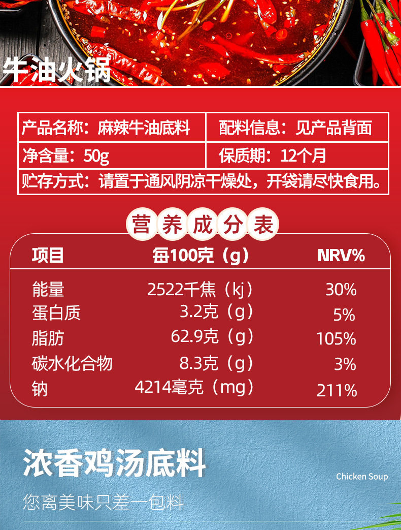 | Packaging specifications | Shanzhen mushroom soup hot pot base 50g,Spicy butter hot pot base 50g,Hot and sour golden soup hot pot base 50g,Strong aroma chicken soup hot pot base 50g,Spicy clear oil hot pot base 50g,Three fresh butter hot pot base 60g,Spicy vine pepper hot pot base 60g,Fresh sweet tomato hot pot base 70g,Spicy beef flavored sauce 50g,Angelica chicken soup sauce 50g,Hot and sour pepper hot pot base 60g,Laotan pickled sauce hot pot base 50g,Concentrated bone soup 30g |