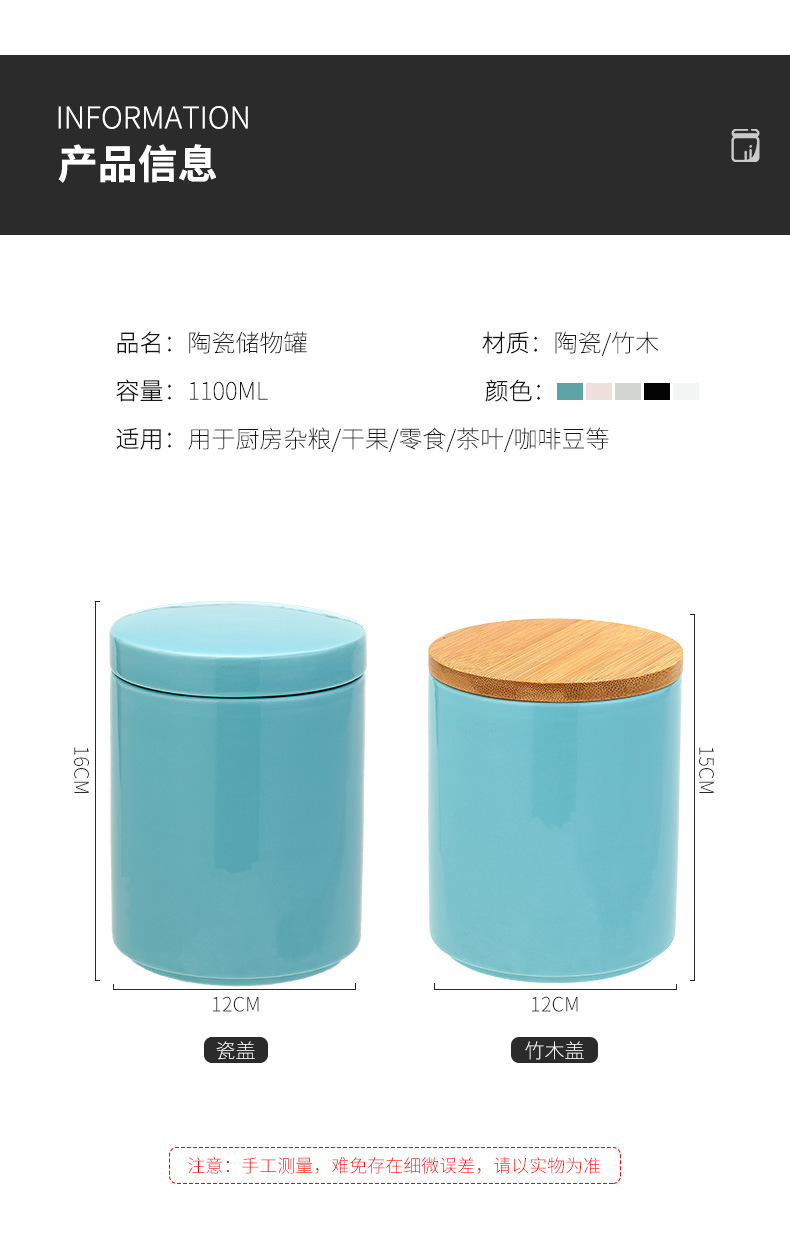 | Specifications | Large jar with bamboo cover (14*14*17.5cm),Medium jar with bamboo cover (12*12*15cm),Small jar with bamboo cover (11*11*12.5cm),Straight large tank with bamboo cover (10*10*14.8cm),Straight in the tank with bamboo cover (10*10*12.5cm),Straight low cans with bamboo cover (10*10*10cm),Large jar with porcelain lid (14*14*18.5cm),Medium jar with porcelain lid (12*12*16cm),Small jar with porcelain lid (11*11*13.5cm),Straight pot with porcelain lid (10*10*15.8cm),Straight in the pot with porcelain lid (10*10*13.5cm),Straight low pot with porcelain lid (10*10*11cm) |