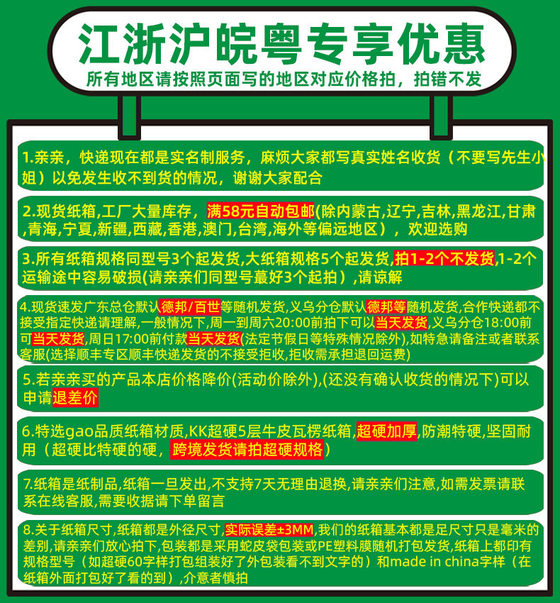 | Specification model | Super hard youniu 70*50*50 without hand buckle; fifth floor - shipped to guangdong, shanghai, jiangsu, zhejiang and anhui,Super hard youniu 70*50*50 without hand buckle; fifth floor - sent to chongqing sichuan,Super hard youniu 70*50*50 without hand buckle; five layers - sent to other provinces,Super hard 70*50*50 without hand buckle; fifth floor - shipped to guangdong, shanghai, jiangsu, zhejiang and anhui,Super hard 70*50*50 without hand buckle; five layers - shipped to chongqing, sichuan,Super hard 70*50*50 without hand buckle; five layers - sent to other provinces,Super hard 70*50*50 with hand buckle; fifth floor - shipped to guangdong, shanghai, jiangsu, zhejiang and anhui,Super hard 70*50*50 with hand buckle; five layers - sent to chongqing, sichuan,Super hard 70*50*50 with hand buckle; five layers - sent to other provinces,Super hard 70*50*50 plastic buckle; fifth floor - shipped to guangdong, shanghai, jiangsu, zhejiang anhui,Super hard 70*50*50 plastic buckle; five layers - shipped to chongqing, sichuan,Super hard 70*50*50 plastic buckle; five layers - shipped to other provinces,Super hard youniu 60*50*50 without hand buckle; fifth floor - shipped to guangdong, shanghai, jiangsu, zhejiang and anhui,Super hard youniu 60*50*50 without hand buckle; fifth floor - sent to chongqing sichuan,Super hard youniu 60*50*50 without hand buckle; five layers - sent to other provinces,Super hard 60*50*50 without hand buckle; fifth floor - shipped to guangdong, shanghai, jiangsu, zhejiang and anhui,Super hard 60*50*50 without hand buckle; five layers - shipped to chongqing, sichuan,Super hard 60*50*50 without hand buckle; five layers - shipped to other provinces,Super hard youniu 60*50*40 without hand buckle; fifth floor - shipped to guangdong, shanghai, jiangsu, zhejiang and anhui,Super hard youniu 60*50*40 without hand buckle; fifth floor - sent to chongqing sichuan,Super hard youniu 60*50*40 without hand buckle; five layers - sent to other provinces,Super hard 60*50*40 without hand buckle; fifth floor - shipped to guangdong, shanghai, jiangsu, zhejiang and anhui,Super hard 60*50*40 without hand buckle; five layers - shipped to chongqing, sichuan,Super hard 60*50*40 without hand buckle; five layers - shipped to other provinces,Extra hard 60*50*40 without hand buckle; fifth floor - shipped to guangdong, shanghai, jiangsu, zhejiang and anhui,Extra hard 60*50*40 without hand buckle; five layers - shipped to chongqing, sichuan,Extra hard 60*50*40 without hand buckle; five layers - shipped to other provinces,Super hard youniu 60*40*40 without hand buckle; fifth floor - shipped to guangdong, shanghai, jiangsu, zhejiang and anhui,Super hard youniu 60*40*40 without hand buckle; fifth floor - sent to chongqing sichuan,Super hard youniu 60*40*40 without hand buckle; five layers - sent to other provinces,Super hard 60*40*40 without hand buckle; fifth floor - shipped to guangdong, shanghai, jiangsu, zhejiang and anhui,Super hard 60*40*40 without hand buckle; five layers - shipped to chongqing sichuan,Super hard 60*40*40 without hand buckle; five layers - shipped to other provinces,Extra hard 60*40*40 without hand buckle; fifth floor - shipped to guangdong, shanghai, jiangsu, zhejiang and anhui,Extra hard 60*40*40 without hand buckle; five layers - shipped to chongqing, sichuan,Extra hard 60*40*40 without hand buckle; five layers - shipped to other provinces,Super hard youniu 60*40*30 without hand buckle; fifth floor - shipped to guangdong, shanghai, jiangsu, zhejiang and anhui,Super hard youniu 60*40*30 without hand buckle; fifth floor - sent to chongqing sichuan,Super hard youniu 60*40*30 without hand buckle; five layers - sent to other provinces,Super hard 60*40*30 without hand buckle; fifth floor - shipped to guangdong, shanghai, jiangsu, zhejiang and anhui,Super hard 60*40*30 without hand buckle; five layers - shipped to chongqing, sichuan,Super hard 60*40*30 without hand buckle; five layers - shipped to other provinces,Extra hard 60*40*30 without hand buckle; fifth floor - shipped to guangdong, shanghai, jiangsu, zhejiang and anhui,Extra hard 60*40*30 without hand buckle; five layers - shipped to chongqing, sichuan,Extra hard 60*40*30 without hand buckle; five layers - shipped to other provinces,Super hard youniu 55*40*42 without hand buckle; fifth floor - shipped to guangdong, shanghai, jiangsu, zhejiang and anhui,Super hard youniu 55*40*42 without hand buckle; fifth floor - sent to chongqing sichuan,Super hard youniu 55*40*42 without hand buckle; five layers - sent to other provinces,Super hard 55*40*42 without hand buckle; fifth floor - shipped to guangdong, shanghai, jiangsu, zhejiang and anhui,Super hard 55*40*42 without hand buckle; five layers - shipped to chongqing sichuan,Super hard 55*40*42 without hand buckle; five layers - sent to other provinces,Super hard youniu 50*40*40 without hand buckle; fifth floor - shipped to guangdong, shanghai, jiangsu, zhejiang and anhui,Super hard youniu 50*40*40 without hand buckle; fifth floor - sent to chongqing sichuan,Super hard youniu 50*40*40 without hand buckle; five layers - sent to other provinces,Super hard 50*40*40 without hand buckle; fifth floor - shipped to guangdong, shanghai, jiangsu, zhejiang and anhui,Super hard 50*40*40 without hand buckle; five layers - shipped to chongqing sichuan,Super hard 50*40*40 without hand buckle; five layers - shipped to other provinces,Super hard 50*40*40 with hand buckle; fifth floor - shipped to guangdong, shanghai, jiangsu, zhejiang and anhui,Super hard 50*40*40 with hand buckle; five layers - shipped to chongqing sichuan,Super hard 50*40*40 with hand buckle; five layers - sent to other provinces,Super hard 50*40*40 plastic buckle; fifth floor - shipped to guangdong, shanghai, jiangsu, zhejiang anhui,Super hard 50*40*40 plastic buckle; five layers - shipped to chongqing, sichuan,Super hard 50*40*40 plastic buckle; five layers - shipped to other provinces,Extra hard 50*40*40 without han