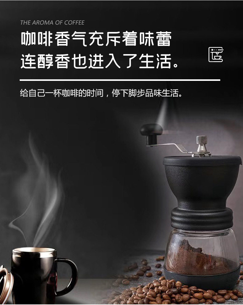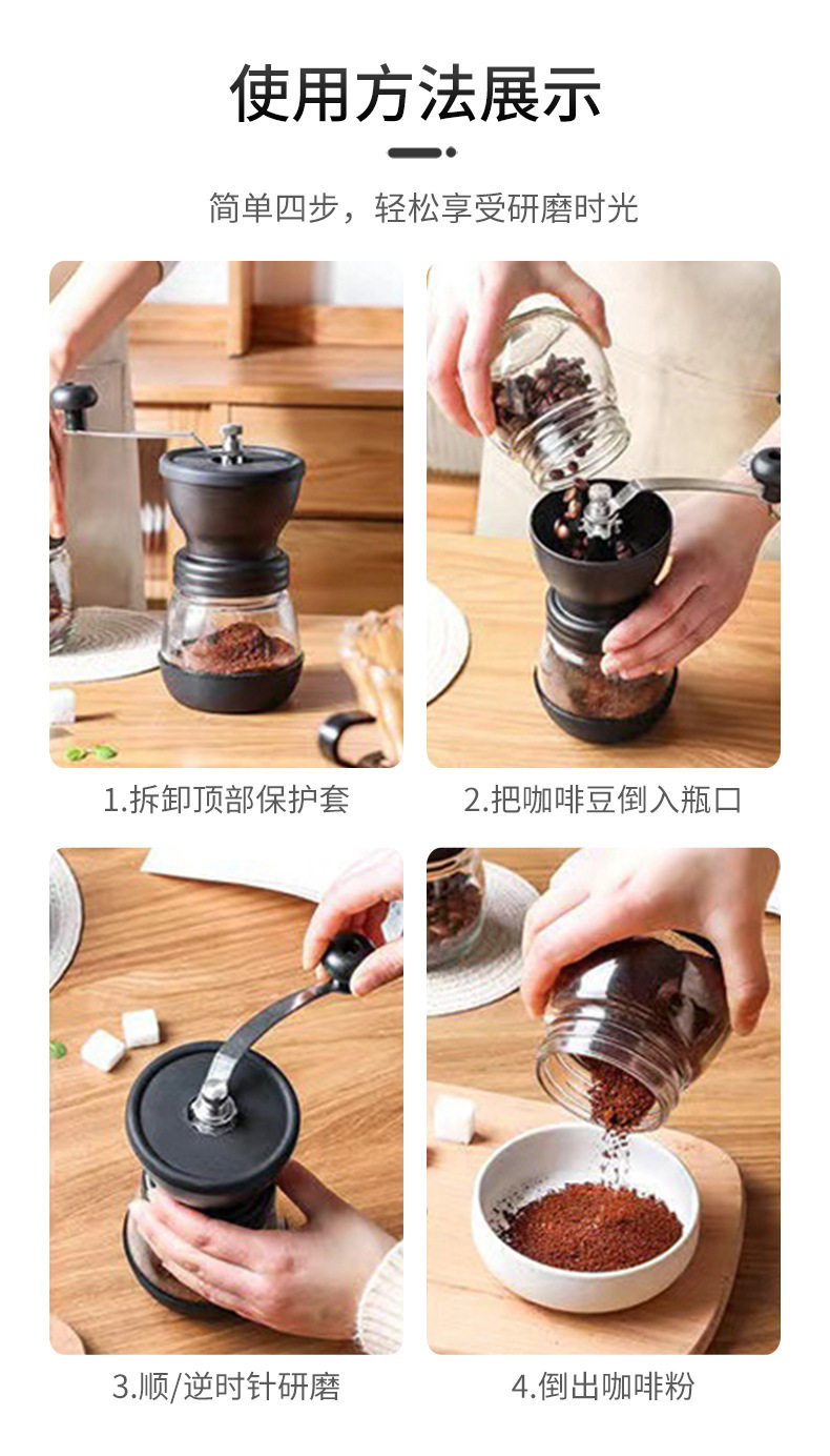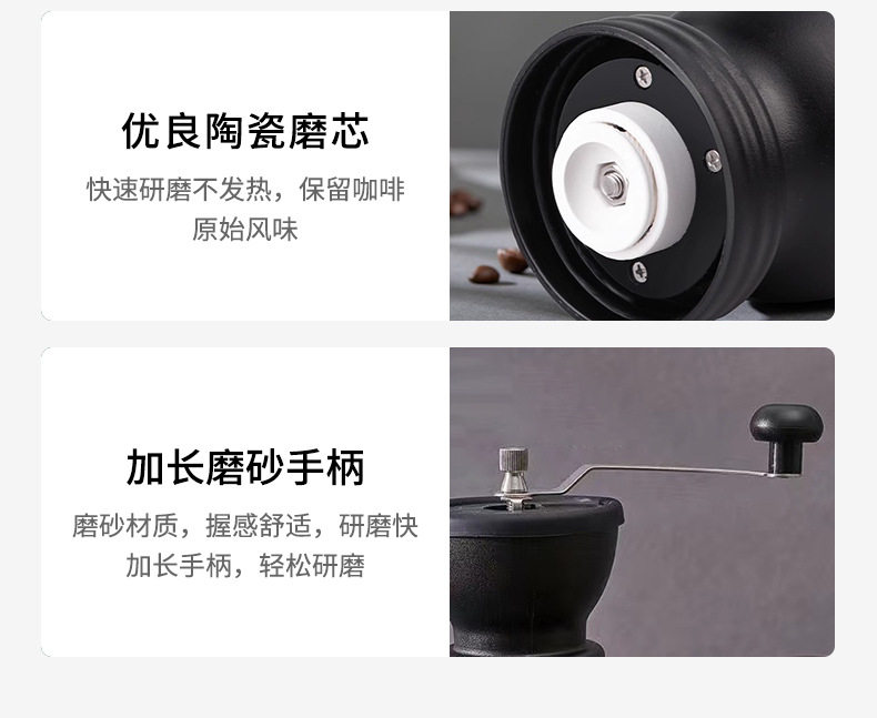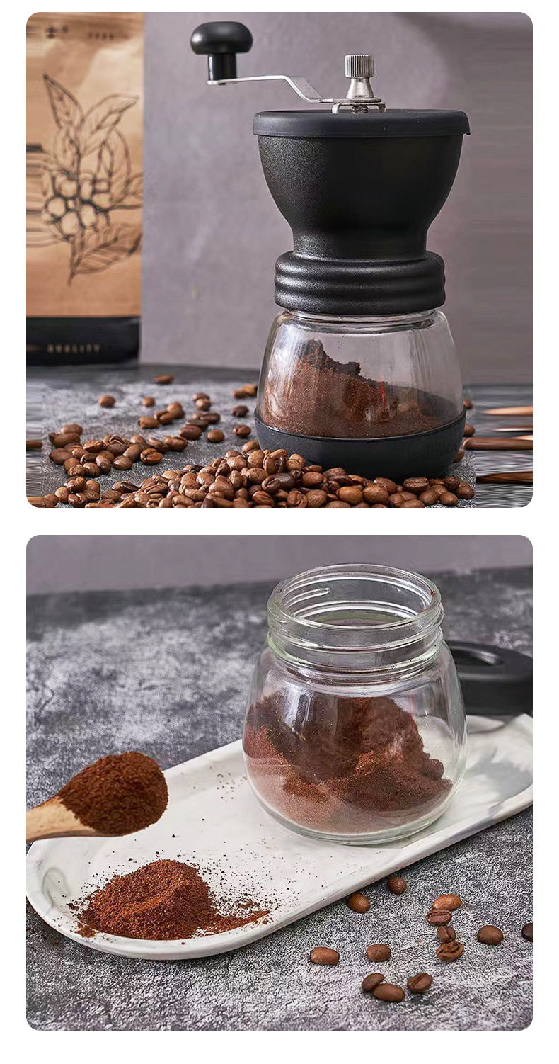 | Specifications | Black Coffee Mill,Black Coffee Mill (with coffee spoon),Black Coffee Mill (with cleaning brush),Black Coffee Mill (with coffee can),Black Coffee Mill (coffee can + coffee spoon + cleaning brush) |