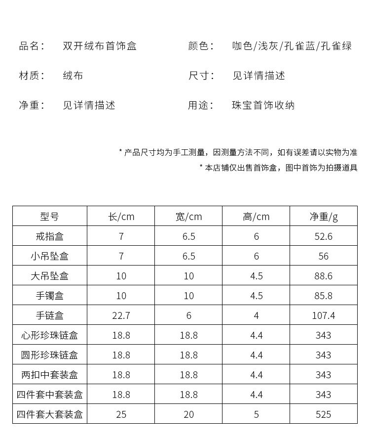 Specifications and models Malachite green; ring box,Malachite green; small pendant box,Malachite green; large pendant box,Malachite green; bracelet box,Malachite green; bracelet box,Malachite green; two-button box (medium size),Malachite green; round pearl box (medium size),Malachite green; heart-shaped pearl box (medium size),Malachite green; necklace box (medium size),Malachite green; necklace box (large size),Peacock red; ring box,Peacock red; ring box,Peacock red; small pendant box,Peacock red; large pendant box,Peacock red; bracelet box,Peacock red; bracelet box,Peacock red; two-button box (medium size),Peacock red; round pearl box (medium),Peacock red; heart-shaped pearl box (medium),Peacock red; necklace box (medium size),Peacock red; necklace box (large size),Peacock blue; ring box,Peacock blue; small pendant box,Peacock blue; large pendant box,Peacock blue; bracelet box,Peacock blue; bracelet box,Peacock blue; two button box (medium),Peacock blue; round pearl box (medium),Peacock blue; heart-shaped pearl box (medium),Peacock blue; necklace box (medium),Peacock blue; necklace box (large),Dark blue; ring box,Dark blue; ring box,Dark blue; small pendant box,Dark blue; large pendant box,Dark blue; bracelet box,Dark blue; bracelet box,Dark blue; two-button box (medium size),Dark blue; round pearl box (medium size),Dark blue; heart-shaped pearl box (medium size),Dark blue; necklace box (medium size),Dark blue; necklace box (large size),Peacock gray; ring box,Peacock gray; ring box,Peacock gray; small pendant box,Peacock gray; large pendant box,Peacock gray; bracelet box,Peacock gray; bracelet box,Peacock gray; two-button box (medium),Peacock gray; round pearl box (medium),Peacock gray; heart-shaped pearl box (medium),Peacock gray; necklace box (medium),Peacock gray; necklace box (large size),Brown; ring box,Brown; ring box,Brown; small pendant box,Brown; large pendant box,Brown; bracelet box,Brown; bracelet box,Brown; two-button box (medium size),Brown; round pearl box (medium size),Brown; heart-shaped pearl box (medium size),Brown; necklace box (medium size),Brown; necklace box (large size),Burgundy; ring box,Burgundy; ring box,Burgundy; small pendant box,Burgundy; large pendant box,Burgundy; bracelet box,Burgundy; bracelet box,Burgundy; two-button box (medium size),Burgundy; round pearl box (medium size),Burgundy; heart-shaped pearl box (medium size),Burgundy; necklace box (medium size),Burgundy; necklace box (large size),Light gray; ring box,Light gray; ring box,Light gray; small pendant box,Light gray; large pendant box,Light gray; bracelet box,Light gray; bracelet box,Light gray; two-button box (medium size),Light gray; round pearl box (medium size),Light gray; heart-shaped pearl box (medium size),Light gray; necklace box (medium size),Light gray; necklace box (large size),Tiffany blue; ring box,Tiffany blue; ring box,Tiffany blue; small pendant box,Tiffany blue; large pendant box,Tiffany blue; bracelet box,Tiffany blue; bracelet box,Tiffany blue; two-button box (medium size),Tiffany blue; round pearl box (medium size),Tiffany blue; heart-shaped pearl box (medium size),Tiffany blue; necklace box (medium size),Tiffany blue; necklace box (large size),Pink; ring box,Pink; ring box,Pink; small pendant box,Pink; large pendant box,Pink; bracelet box,Pink; bracelet box,Pink; two-button box (medium size),Pink; round pearl box (medium size),Pink; heart-shaped pearl box (medium size),Pink; necklace box (medium size),Pink; necklace box (large size)