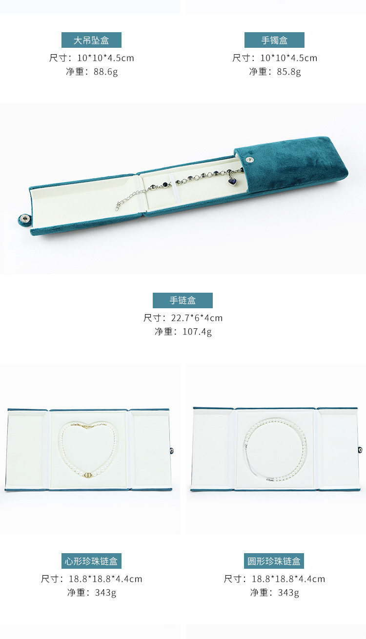 Specification Ring box,Large pendant box,Small pendant box,Bracelet box,Bracelet box,Ring box,Necklace box (large size),Two-button box (medium size),Round pearl box (medium size),Heart-shaped pearl box (medium size),Necklace box (medium size)