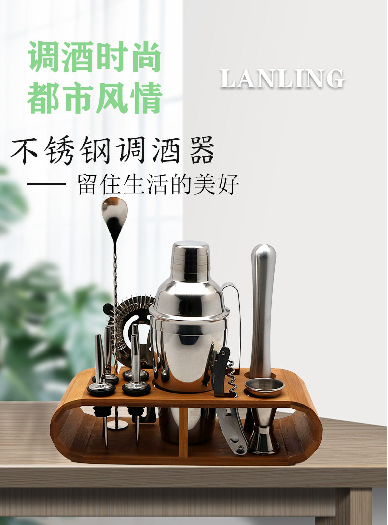 Popular High-End Stainless Steel Cocktail Shaker Oval Wooden Stand Set Red Wine Glasses Bar Tools Shaker Set