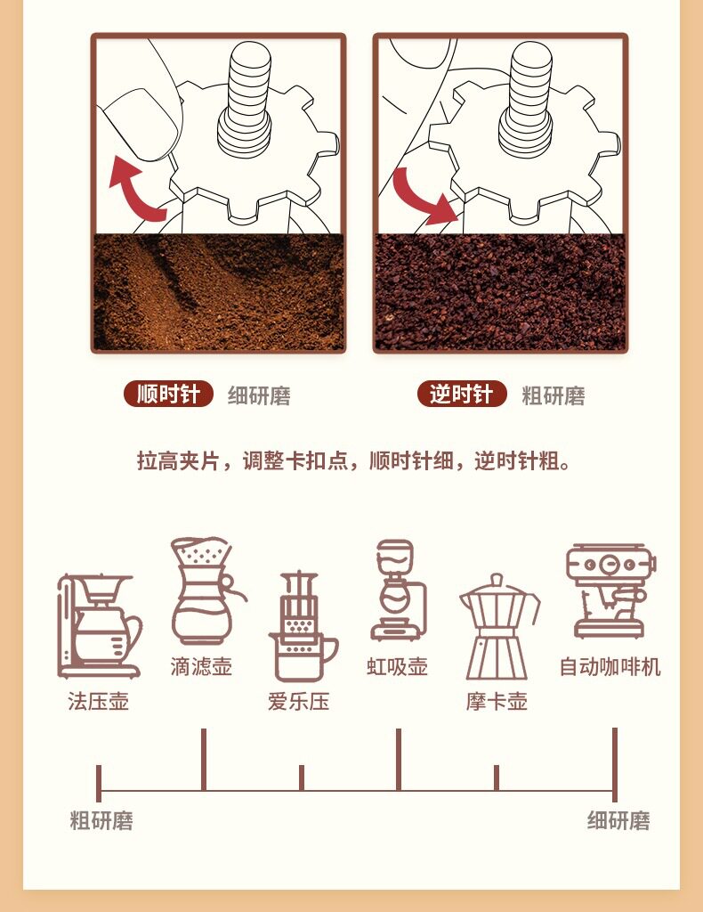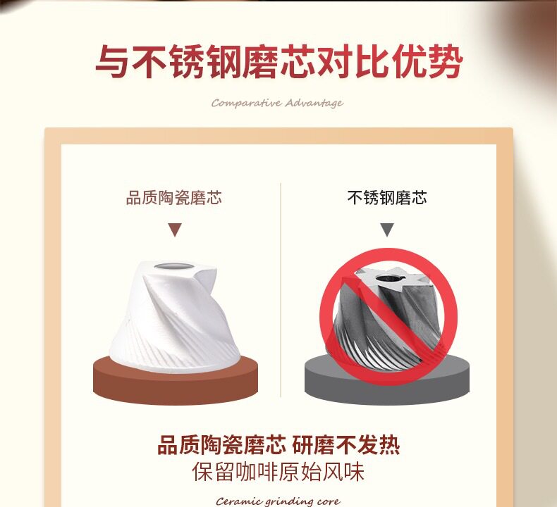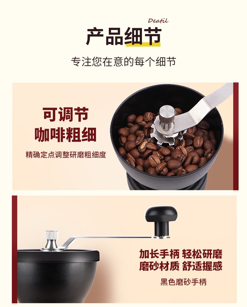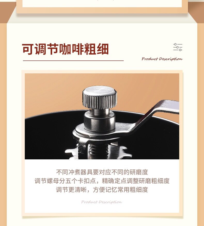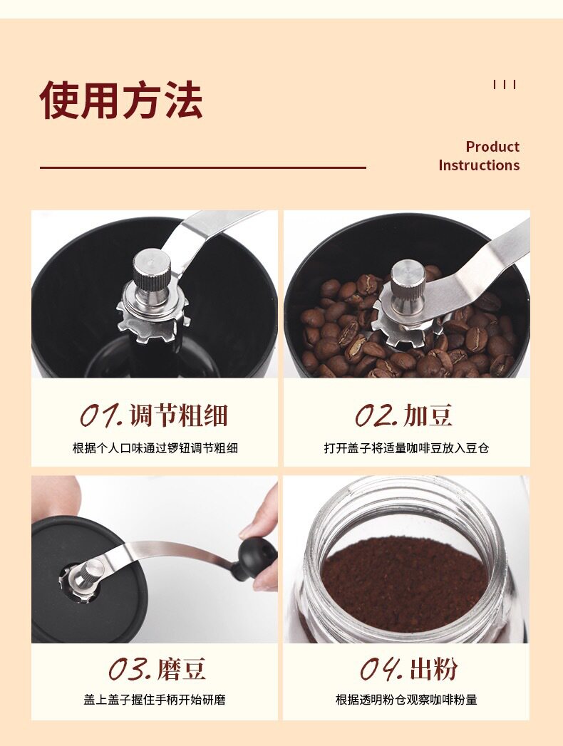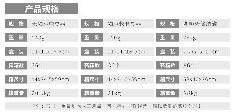 | Specifications | Bearingless model,Bearingless coffee can,Bearingless Cleaning Brush,Single bearing model (labor saving),Single bearing coffee cans,Single bearing cleaning brush,Double bearing (labor-saving grinding more uniform),Double bearing coffee can,Double-bearing cleaning brush |