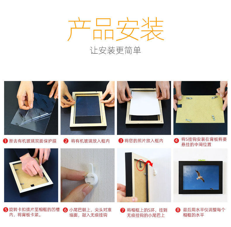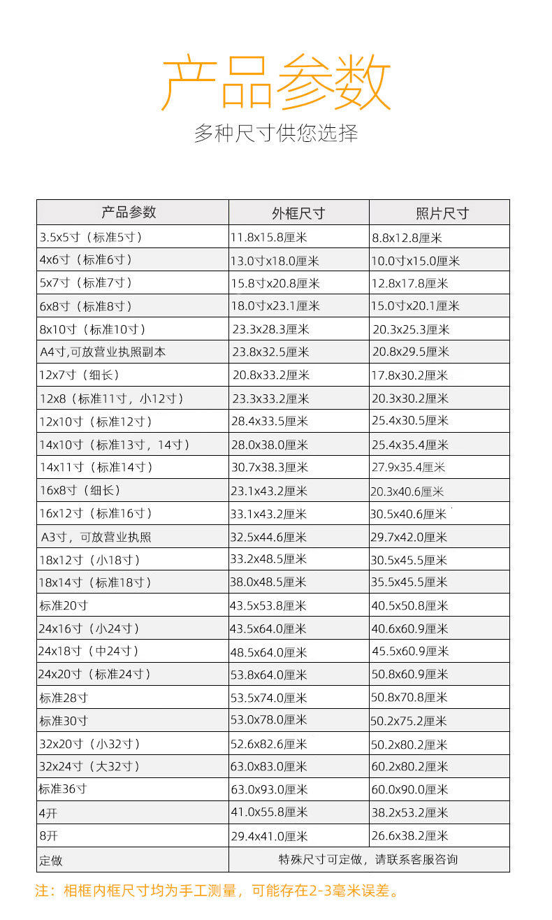| Inner frame size | A4 wall hanging [can hold 29.7* 21cm ],A3 wall hanging [can hold 29.7* 42cm ],4 open wall hanging [can hold 38* 53cm ],8 open wall hanging [can hold 26.6* 38cm ],12inch wall-mounted [can hold 30.5* 25.4cm ],14inch wall-mounted [can hold 28* 35.4cm ],16inch wall-mounted [can hold 30.5* 40.6cm ],18inch wall-mounted [can hold 35.5*45.5cm],20inch wall-mounted [can hold 40.6* 50.8cm ],24inch wall-mounted [can hold 50.8* 60.9cm ],28inch wall-mounted [can hold 50.8* 70.8cm ],30inch wall-mounted [can hold 50.2* 75.2cm ],32inch wall-mounted [can hold 60* 80cm ],36inch wall-mounted [can hold 90* 60cm ],6inch wall-mounted [can hold 10.2* 15.2cm ],7inch wall-mounted [can hold 12.7* 17.8cm ],8inch wall-mounted [can hold 15.2* 20.3cm ],10inch wall-mounted [can hold 20.3* 25.4cm ],5inch wall-mounted [can hold 8.9* 12.7cm ],5inch it can be placed or hung [can hold 8.9* 12.7cm ],6inch can be placed or hung [can hold 10.2* 15.2cm ],7inch it can be placed or hung [can hold 12.7* 17.8cm ],8inch it can be placed or hung [can hold 15.2* 20.3cm ],10inch it can be placed or hung [can hold 20.3* 25.4cm ],12inch table setting [can hold 30.5* 25.4cm ],Small 14inch wall-mounted [can hold 25.4* 35.6cm ],Small 18inch wall-mounted [can hold 30.5* 45.7cm ],Small 24inch wall-mounted [can hold 40.6* 60.9cm ],A4 can be placed or hung [can hold 29.7* 21cm ],11inch it can be placed or hung [can hold 20.3* 30.5cm ],2 open wall hanging [can hold 53.2* 76.2cm ],Medium 24inch wall-mounted [can hold size 45.5* 60.9cm ],A2 wall hanging [can hold size 59.6* 42cm ] |