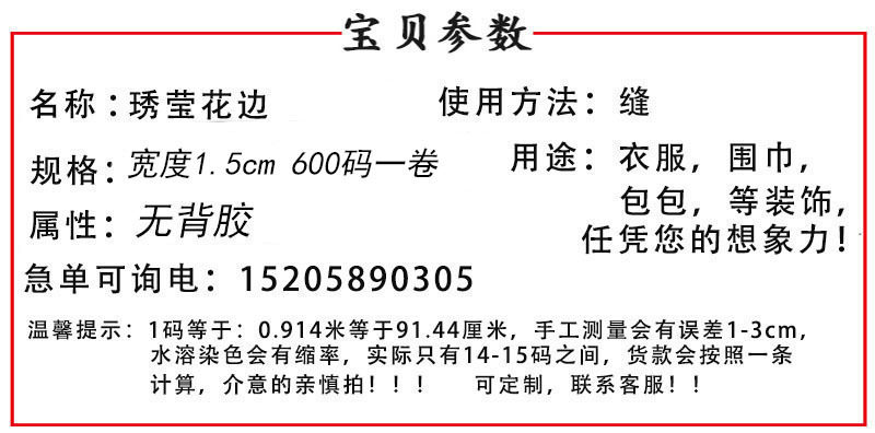 | Specification model | Orange*width: 1.5cm (600 yards per roll),Yellow*width: 1.5cm (600 yards per roll),Gray*width: 1.5cm (600 yards per roll),Beige*width: 1.5cm (600 yards per roll),Black*width: 1.5cm (600 yards per roll),Sapphire blue*width: 1.5cm (600 yards per roll),Navy blue*width: 1.5cm (600 yards per roll),Grass green*width: 1.5cm (600 yards per roll),Big red*width: 1.5cm (600 yards per roll),Pink*width: 1.5cm (600 yards per roll),Fruit green*width: 1.5cm (600 yards per roll),Lake blue*width: 1.5cm (600 yards per roll),Rose red*width: 1.5cm (600 yards per roll),Bleached*width: 1.5cm (600 yards per roll),Light blue*width: 1.5cm (600 yards per roll),Light green*width: 1.5cm (600 yards per roll),Light green*width: 1.5cm (600 yards per roll),Light purple*width: 1.5cm (600 yards per roll),Watermelon red* width: 1.5cm (600 yards per roll),Blood tooth color*width: 1.5cm (600 yards per roll),Maroon*width: 1.5cm (600 yards per roll),Purple red*width: 1.5cm (600 yards per roll),Minimum bid of 600 yards for a single color * width: 1.5cm (600 yards per roll) |