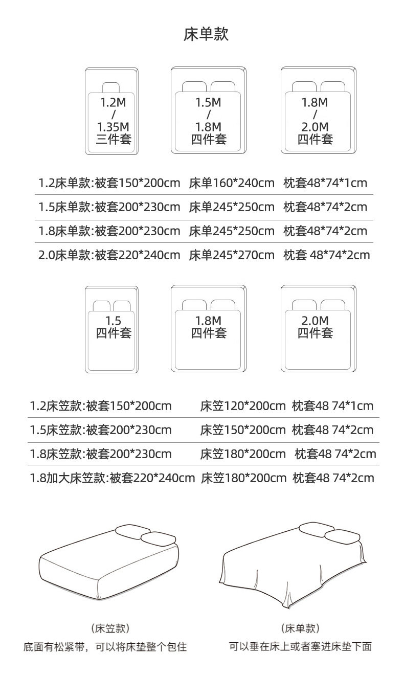 | Dimensions | 1.2m bed sheet three-piece set [suitable for quilt core 150*200cm],1.5m bed [sheet set of four] [applicable to 200*230cm quilt core],1.8m bed [sheet set of four] [applicable to 200*230cm quilt core],2.0m bed [sheet set of four] [applicable to 220*240cm quilt core],1.2* 2m three-piece fitted sheet set (suitable for quilt core 150*200cm),1.5* 2m four-piece set of fitted sheets [suitable for quilt core 200*230cm],1.8* 2m four-piece fitted sheet set [suitable for quilt core 200*230cm],1.8* 2m four-piece set of oversized fitted sheets (suitable for quilt core 220*240cm),150*200cm single quilt cover,160*210 single quilt cover,180*200cm single quilt cover,180*220 single quilt cover,200*230cm single quilt cover,220*240cm single quilt cover,120*230cm single bed sheet,160*240cm single bed sheet,200*245cm single bed sheet,240*250cm single bed sheet,240*270cm single bed sheet,90*200cm single fitted sheet,120*200cm single fitted sheet,150*200cm single fitted sheet,180*200cm single fitted sheet,200*220 single fitted sheet,A pair of 48*74cm pillowcases |