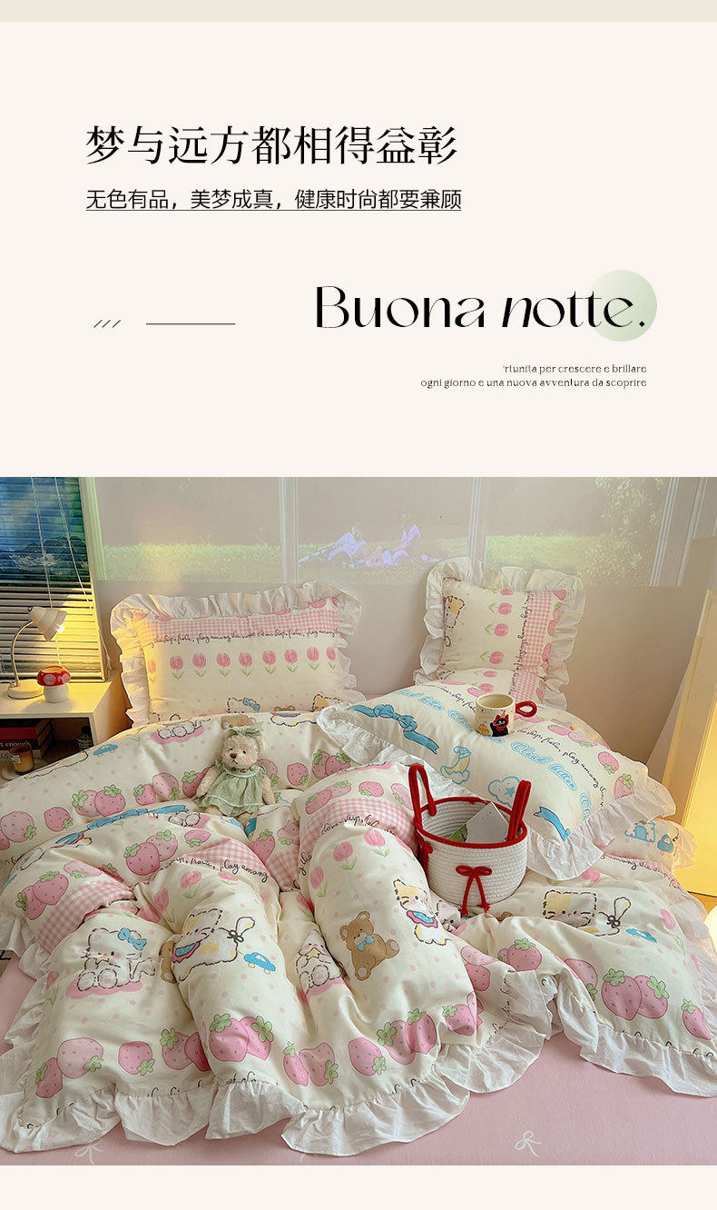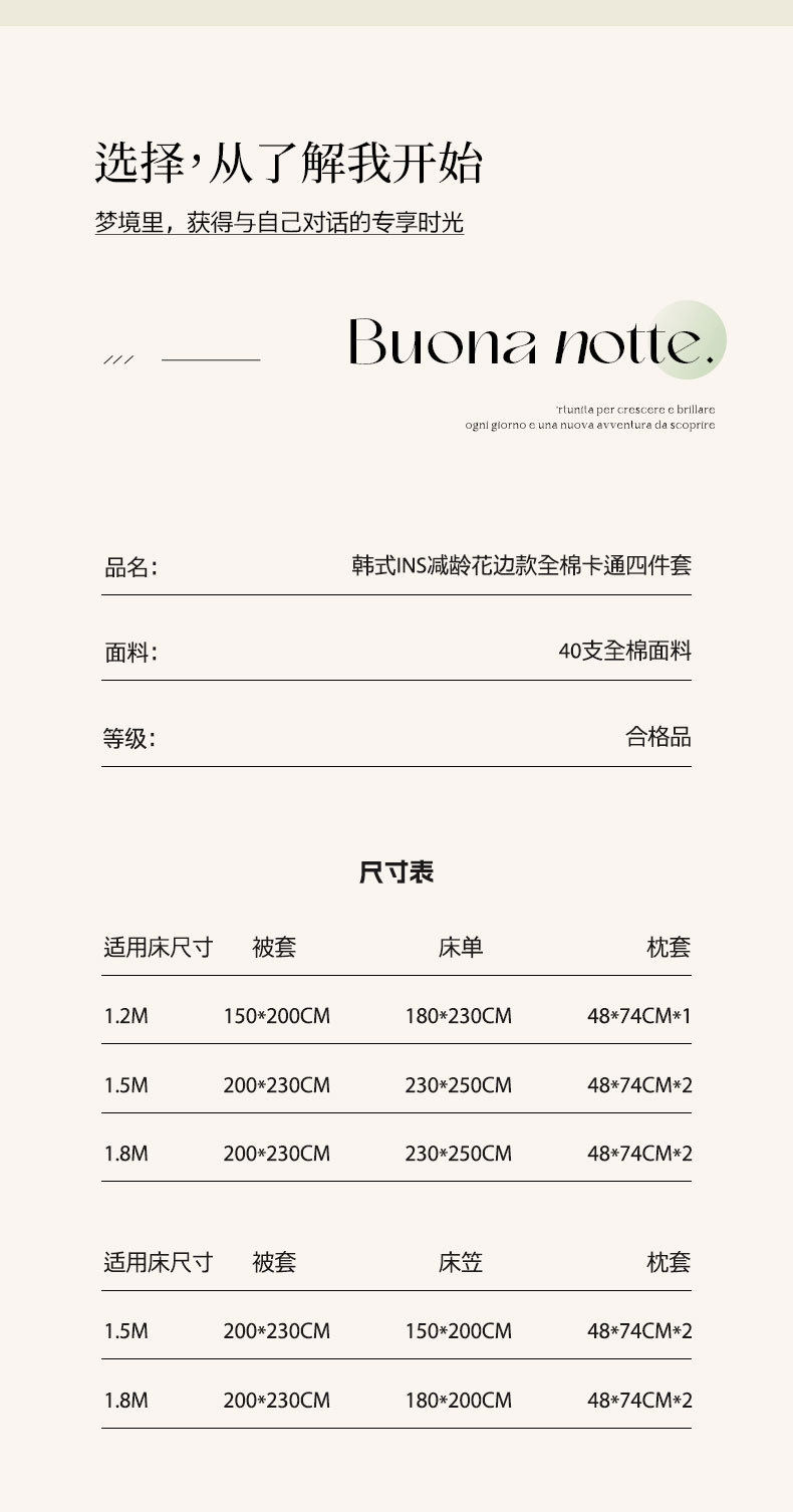 | Dimensions | 1.2m bed [bed sheet three-piece set] [suitable for quilt core 150*200cm]],1.5m bed [bed sheet four-piece set] [applicable 200*230cm quilt core]],1.8m bed [bed sheet four-piece set] [applicable 200*230cm quilt core]],1.5*2 m bed hat set [suitable for quilt core 200*230cm]],1.8*2 m bed hat set [suitable for quilt core 200*230cm]] |