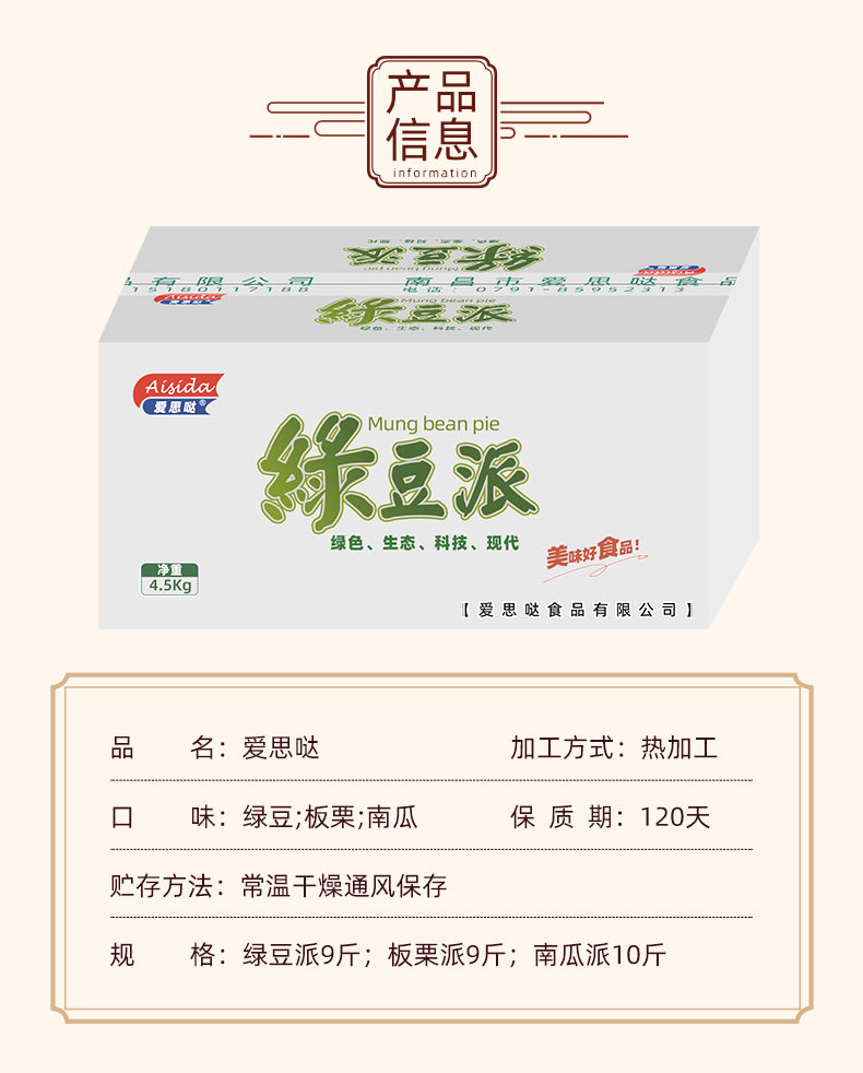 | Packaging specifications | Chestnut pie 9 Jin,Mung bean pie 9 Jin,Pumpkin pie 10 jin |