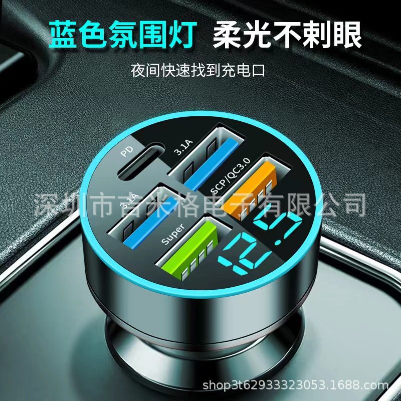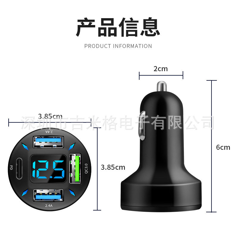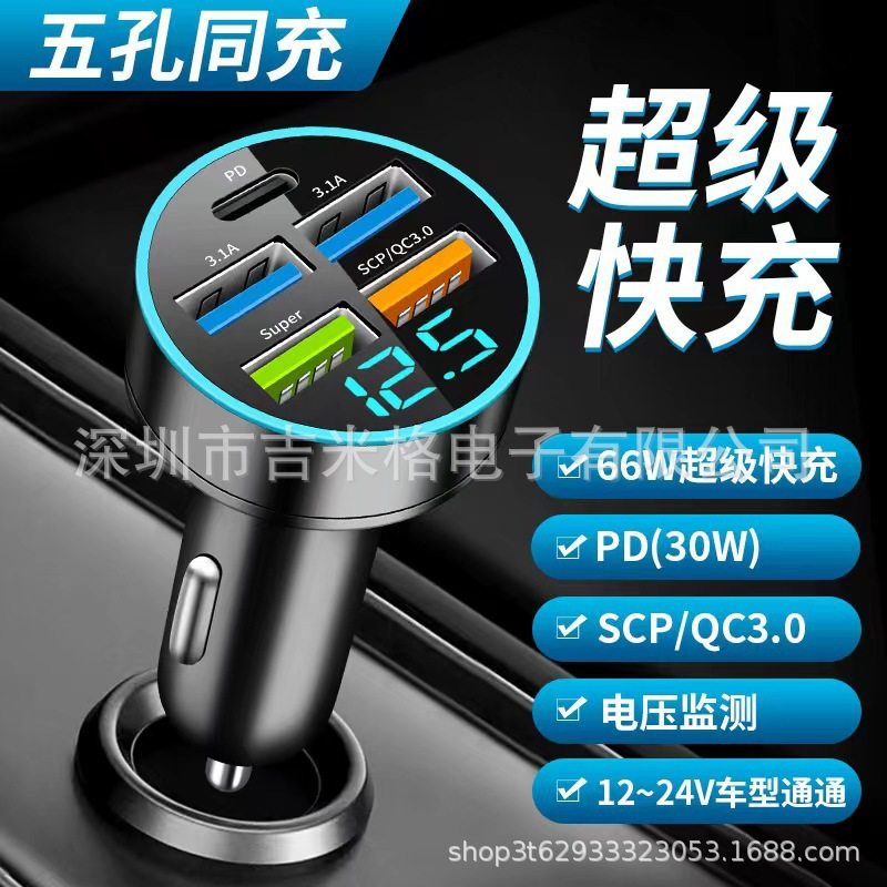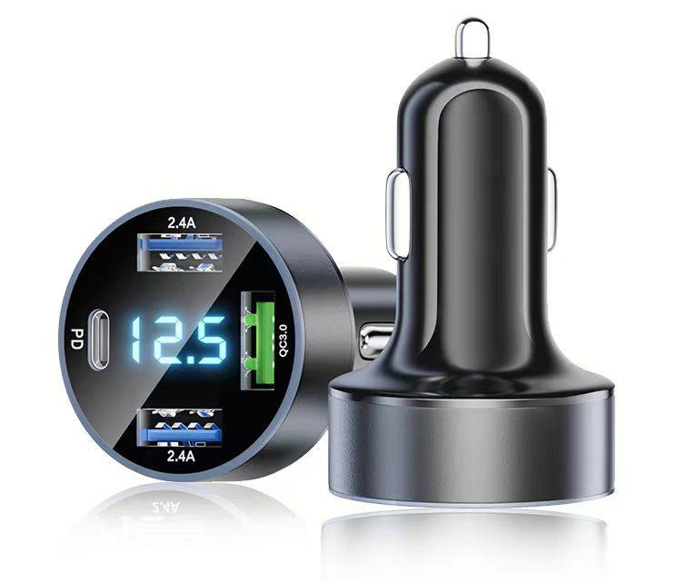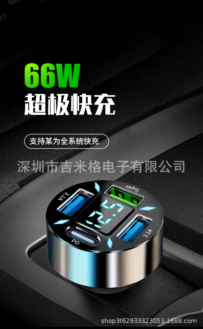 New digital display car charger 4usb 66W fast charge PD mobile phone charging head one drag four QC3.0 car charger