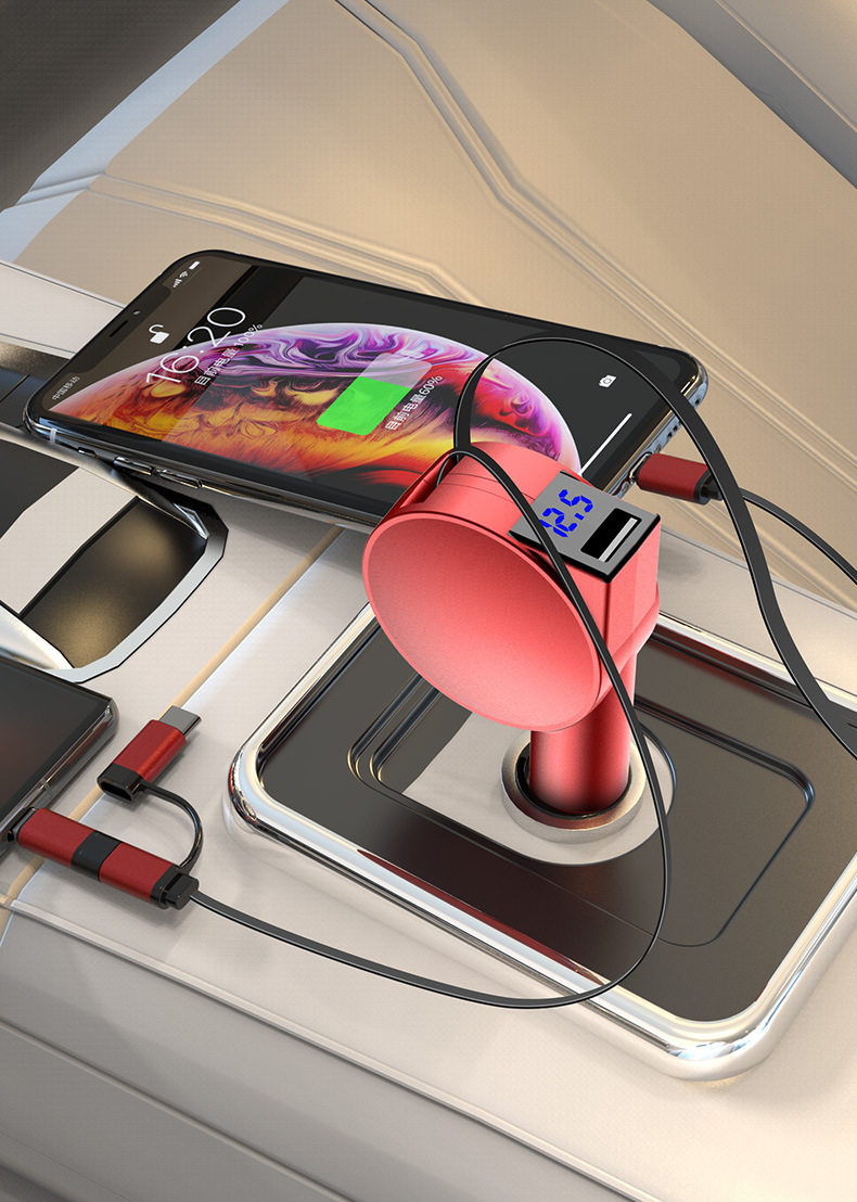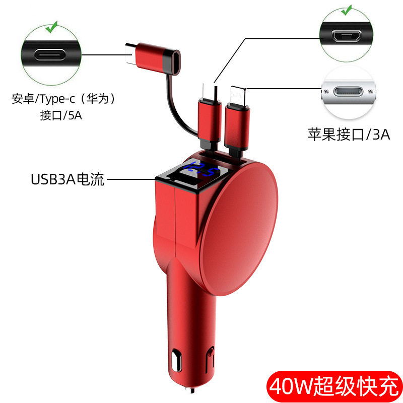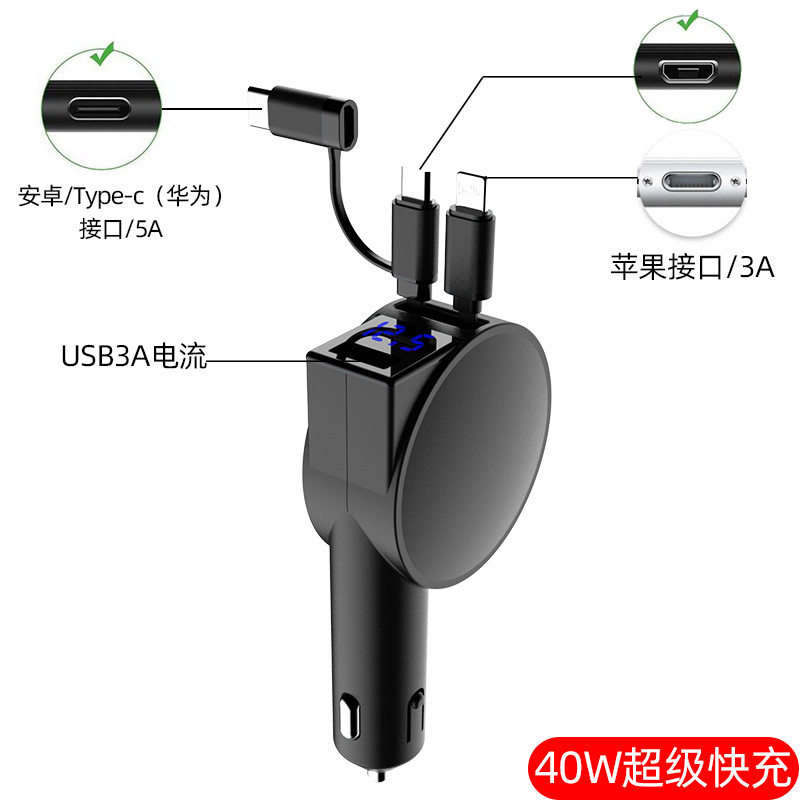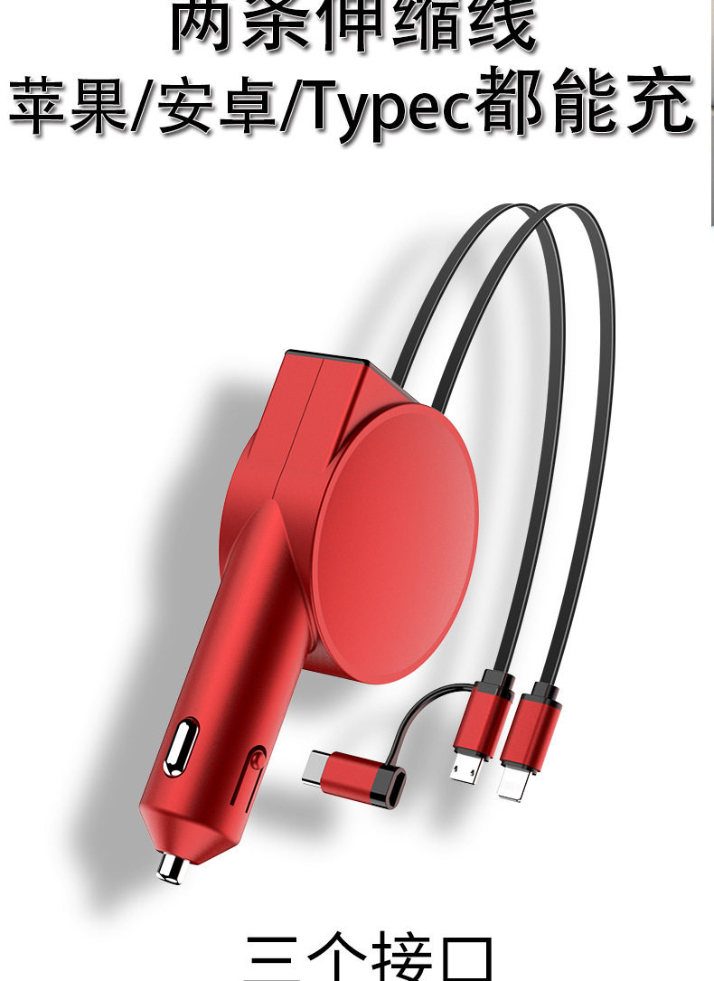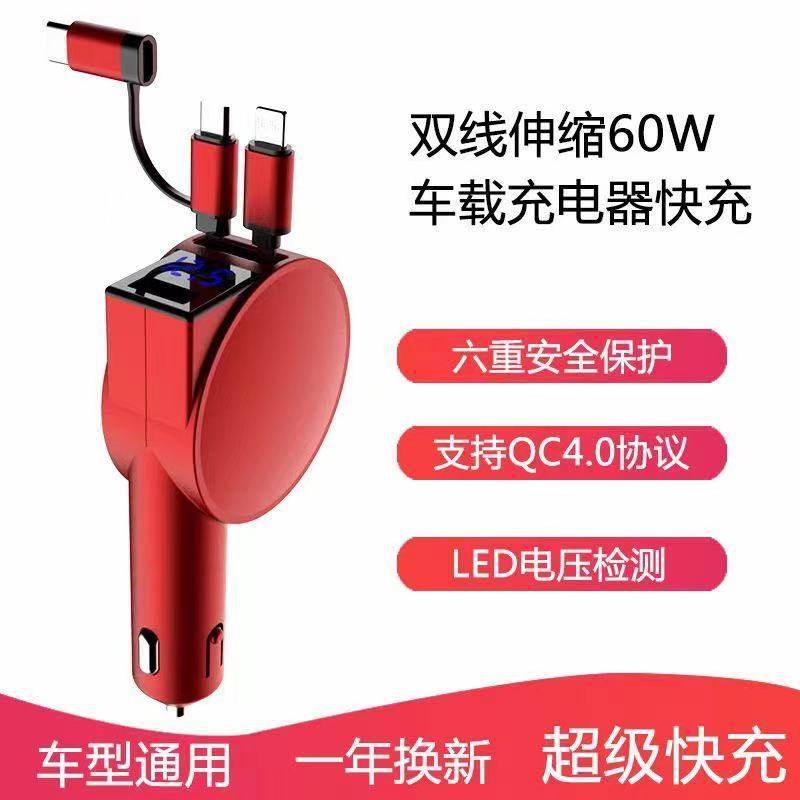 Three-In-One Dual-Wire Retractable Car Charger 60W Super Fast Charging Multi-Function USB Car Mobile Phone Charger