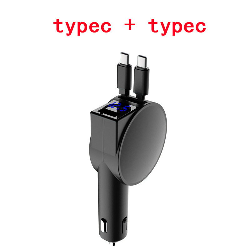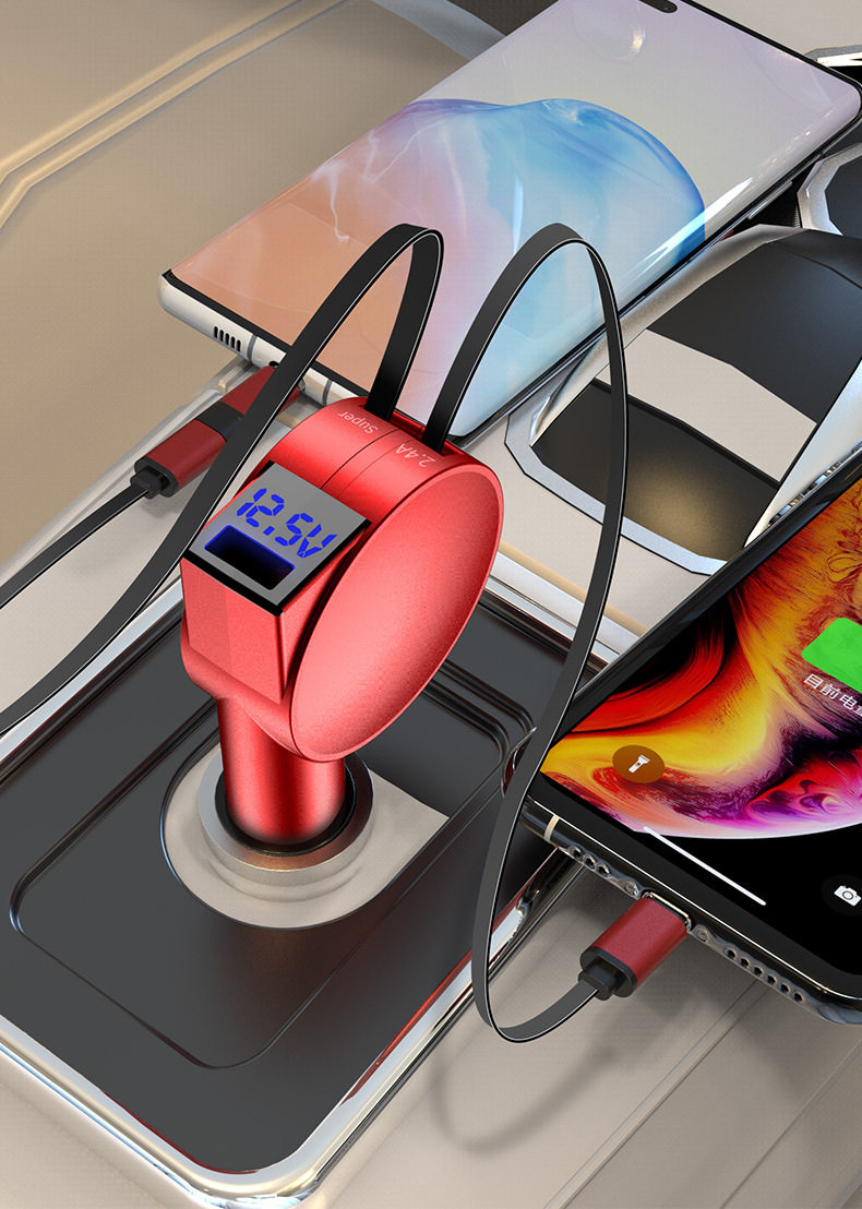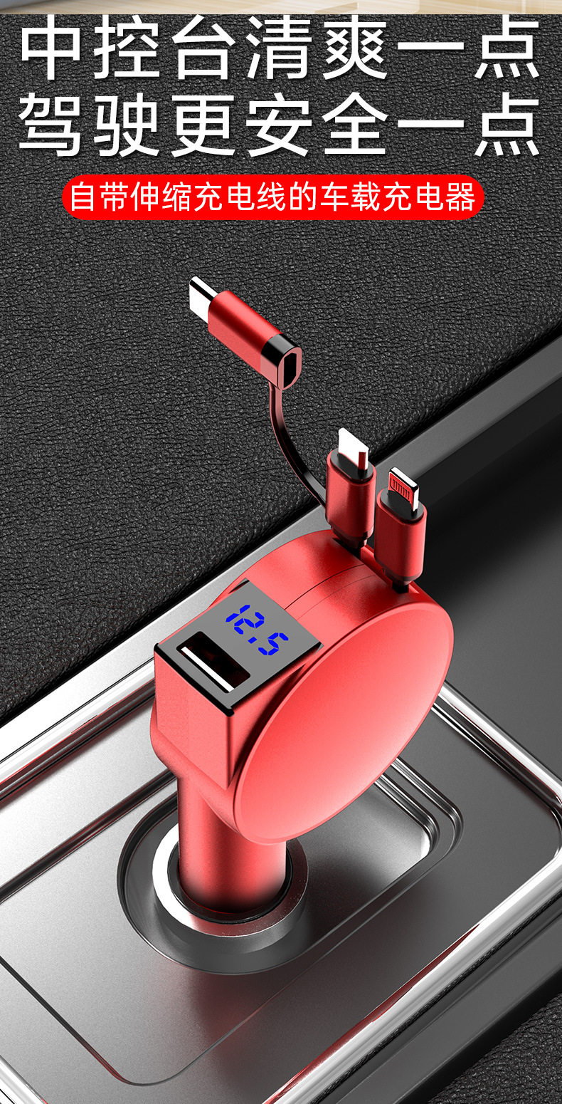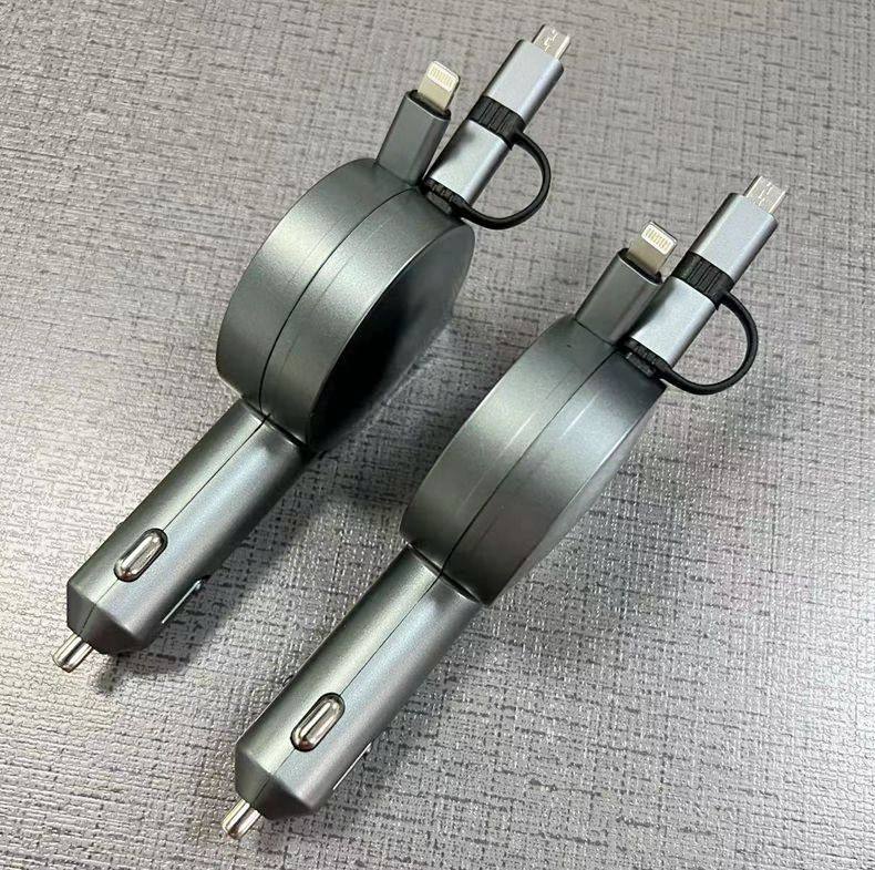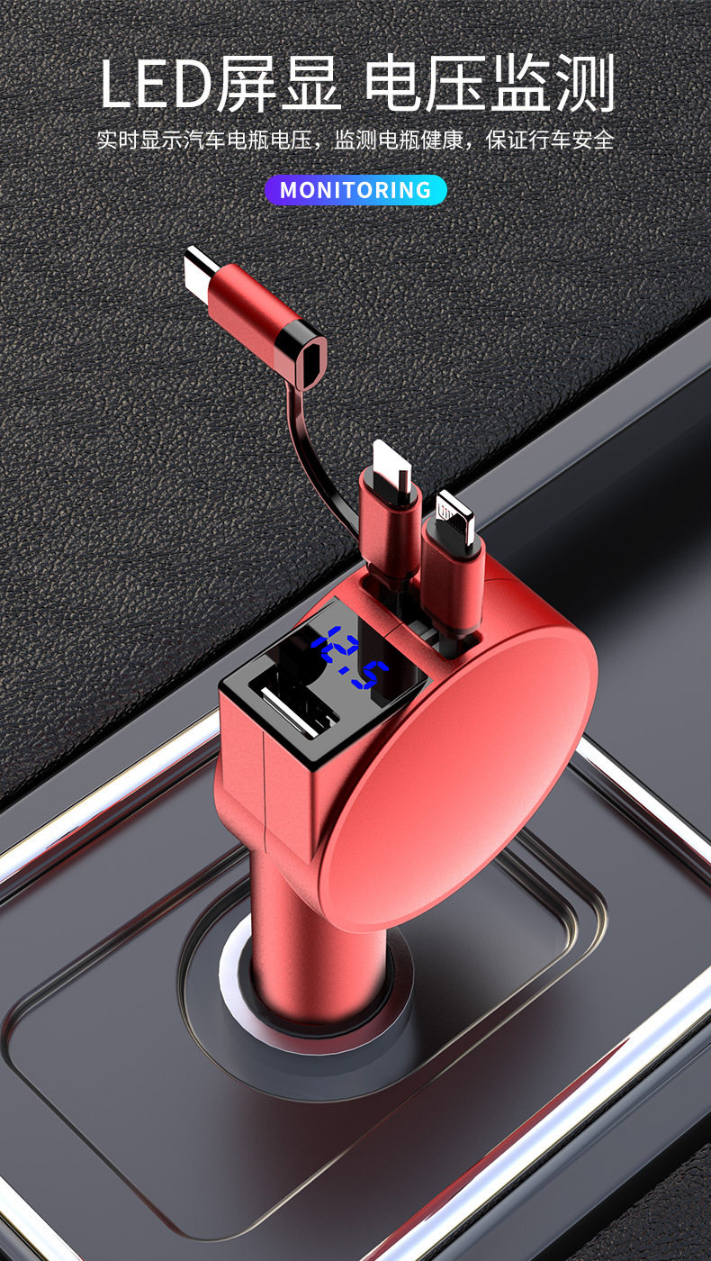 Three-In-One Dual-Wire Retractable Car Charger 60W Super Fast Charging Multi-Function USB Car Mobile Phone Charger