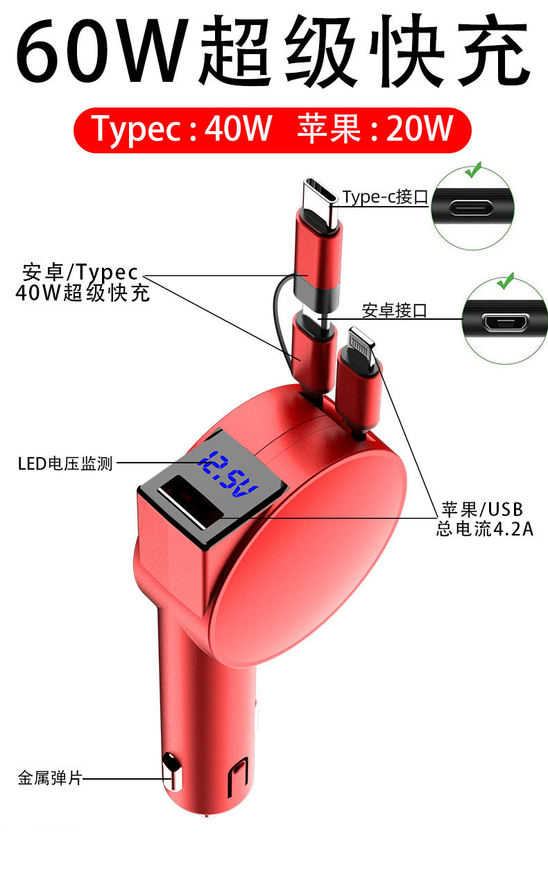 | Model | 8th generation super fast charge car charger Red [Apple + Android + typec]],8 generation super fast charge car charger black [Apple + Android + typec]],8 generation super fast charge car charger black [super fast charge TypeC + typec]],8th generation super fast charging car charger metal gray [Apple + Android + typec]] |