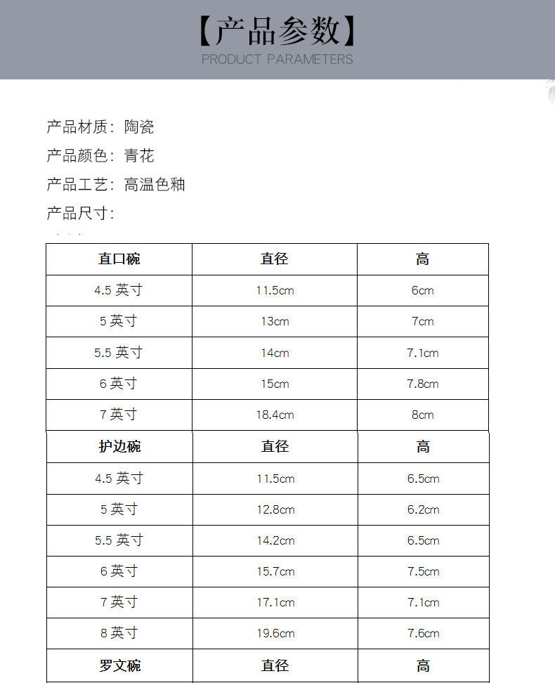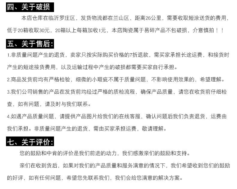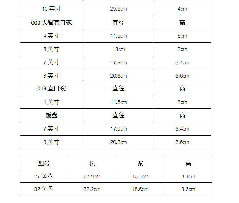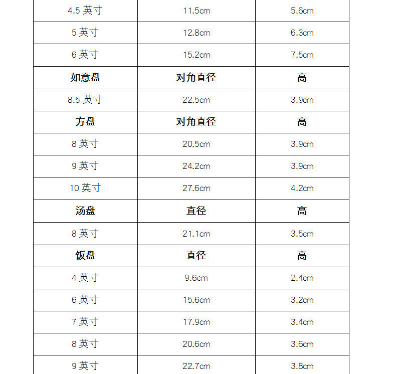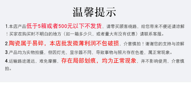 | Specification | Defective straight bowl 4.5inch about 11.5cm 120 pieces/box,Straight mouth bowl 4.5inch about 11.5cm 100 pieces/box,Defect straight bowl 5inch 80 pieces/box about 12.8cm,Straight mouth bowl 5inch 90 pieces/box about 12.8cm,Straight mouth bowl 5.5inch 80pcs/box,Straight mouth bowl 6inch 60pcs/box,Straight mouth bowl 7inch 48pcs/box,Edge protection bowl 4.5inch 120pcs/box,Edge bowl 6inch 60pcs/box,Edge bowl 7inch 48pcs/box,Edge bowl 8inch 30pcs/box,8.5inch ruyi plate, about 22.5*18.1*3.1cm, 60 pieces/box,8inch square plate, about 21*18*3cm, 50 pieces/carton,9inch square plate, about 23.8*20*3.8cm, 46 pieces/carton,10inch square plate, about (diagonally) 27*22.8*4.1cm, 40 pieces/carton,8inch soup plate about 20*3cm, 50 pieces per box,6inch rice tray, about 15.5cm, 100 pieces/box,7inch rice tray, about 17.8cm, 60 pieces/box,7inch diamond plate is about 17.5* 3.5cm , 60pcs in 1box,8inch rice tray, about 20cm, 50 pieces/box,8inch diamond plate is about 20* 3.7cm , 50pcs in 1box,9inch rice tray, about 22.8cm, 40 pieces/box,10.5inch fruit plate, about 25.5cm, 30 pieces/box,12inch rice tray, about 30cm, 20 pieces/box,27cm fish plate 27.9*16.1*3.1 30 pieces/box,32cm fish plate 32.2*18.6*3.6 20 pieces/box,37.5cm rectangular fish plate, about 20.8cm wide, 16 pieces/box,6inch bucket bowl, about 15cm, 80 pieces/box,7inch bucket bowl, about 17cm, 60 pieces/box,8inch bucket bowl, about 21*6cm, 50 pieces/box,Small 8inch bucket bowl about 19*5.1cm 50 pieces/box,9inch bucket bowl, about 22.5cm, 30 pieces/box,3.6 tribute bowl about 8.8*4.5cm 200 pieces/box,{100 pieces}the maximum diameter of the three-bend spoon is about 13.5cm,{50 pieces} the maximum diameter of the two-curved spoon is about 22.8cm,4.25 han disc, about 10.5cm, 260 pieces/box,8inch tanggu 20cm 30pcs/box,9inch tanggu about 23cm 20pcs/box,10inch tanggu about 26cm 20 pieces/box,Defects 10inch tanggu about 26cm 20 pcs/box,Defects 8inch rice tray, about 20cm, 50 pieces/box,Defects 7inch rice tray about 17.8cm 60 pieces/box,Jiangzhong cup about 100ml 7*5cm 200 pieces per box |
