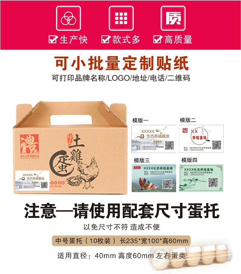| Specifications and models | [red egg packaging box]; 10-piece paper gift box,[red egg packaging box]; 20-piece paper gift box,[red egg packaging box]; 30-piece rope gift box,[red egg packaging box]; 40-piece rope gift box,[red egg packaging box]; 50-piece rope gift box,[red egg packaging box]; 60-piece rope gift box,[red egg packing box]; 3/ 3kg chicken box-no holes,[red egg packaging box]; 3/ 3kg chicken box-with holes,[red egg packaging box]; single egg tray,[red egg packaging box + egg tray]; 10 paper gift boxes,[red egg packaging box + egg tray]; 20-piece paper gift box,[red egg packaging box + egg tray]; 30-piece rope gift box,[red egg packaging box + egg tray]; 40-piece rope gift box,[red egg packaging box + egg tray]; 50-piece rope gift box,[red egg packaging box + egg tray]; 60-piece rope gift box,[type c egg packaging box]; 20-piece paper gift box,[type c egg packaging box]; 30-piece rope gift box,[type c egg packaging box]; 30-piece paper gift box,[type c egg packaging box]; 40-piece paper gift box,[type c egg packaging box]; 50-piece paper gift box,[c style egg packaging box + egg tray]; 20 pieces paper gift box,[c style egg packaging box + egg tray]; 30-piece rope gift box,[c style egg packaging box + egg tray]; 30 pieces paper gift box,[type c egg packaging box + egg tray]; 40-piece paper gift box,[type c egg packaging box + egg tray]; 50-piece paper gift box,[green egg packaging box]; 10-piece paper gift box,[green egg packaging box]; 20-piece paper gift box,[green egg packaging box + egg tray]; 10 paper gift boxes,[green egg packaging box + egg tray]; 20-piece paper gift box,[colorful egg packaging box]; 30-piece paper gift box,[colored egg packaging box]; 60-piece paper gift box,[colored egg packaging box + egg tray]; 30-piece paper gift box,[colored egg packaging box + egg tray]; 60-piece paper gift box |
