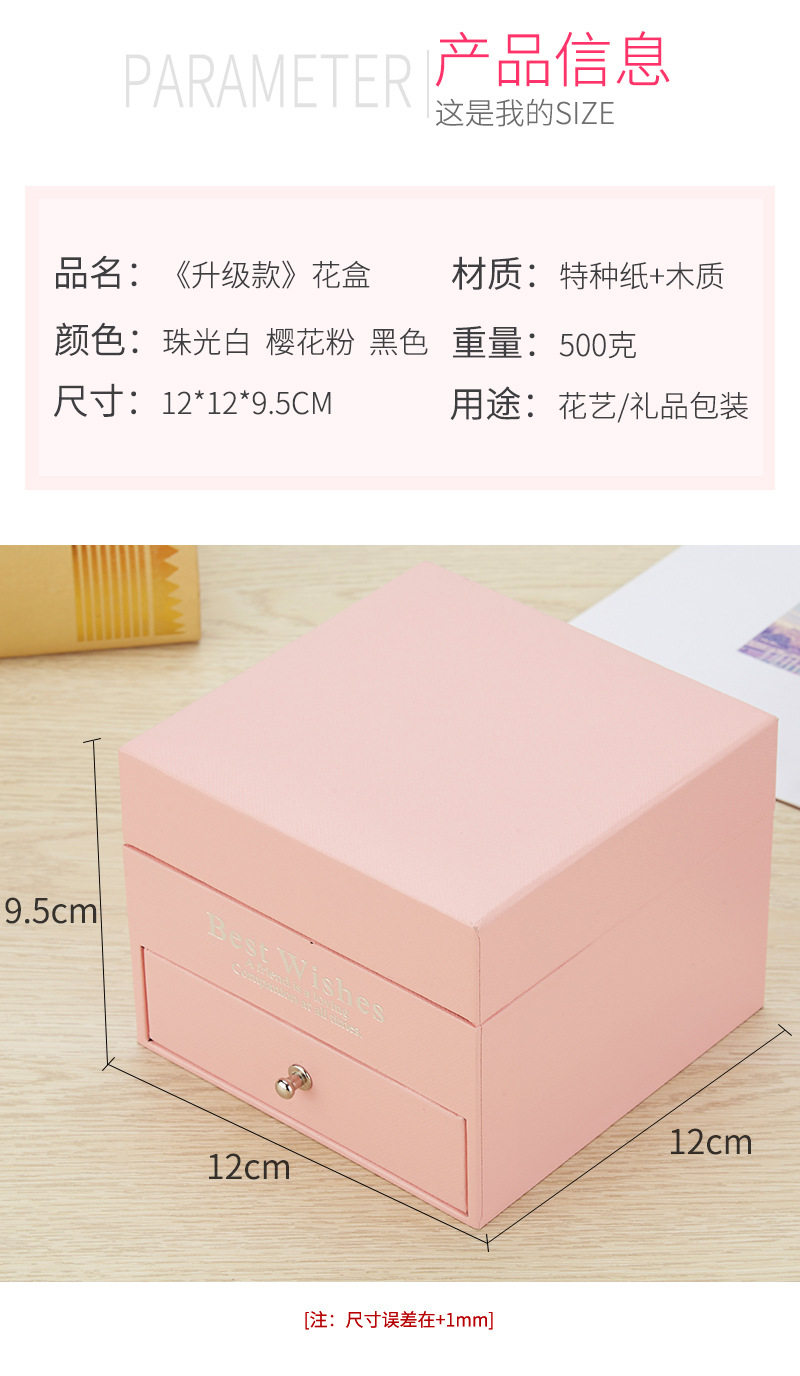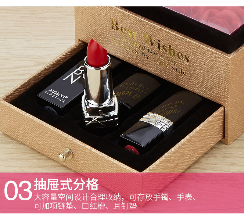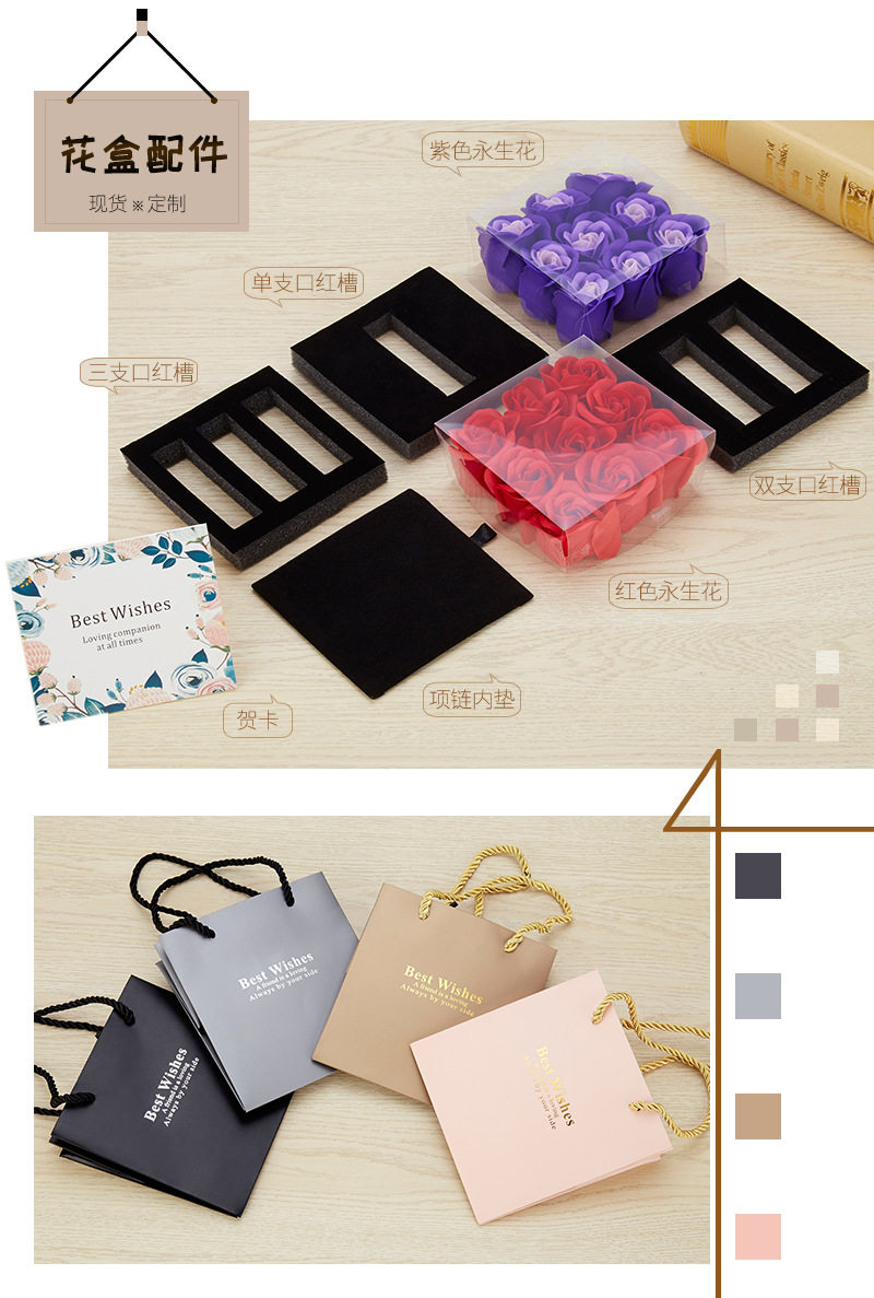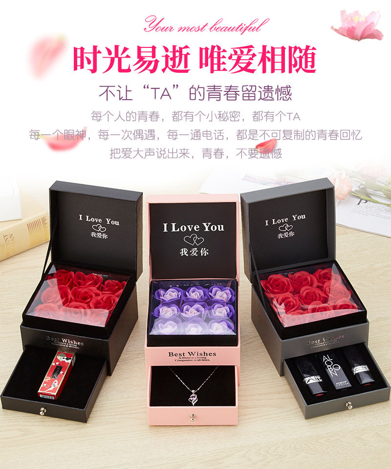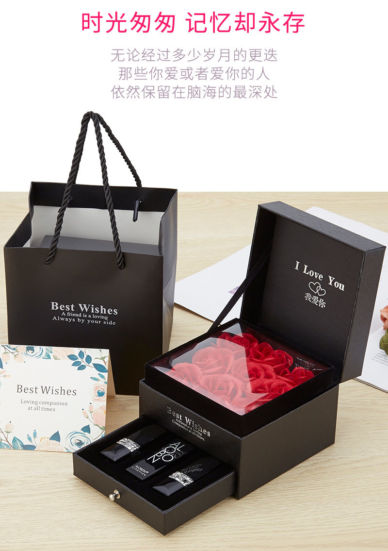 | Specification model | Empty box (excluding gift bag + flowers); necklace with double ring holes (excluding accessories),Empty box (excluding gift bag + flower); single lipstick slot (excluding lipstick),Gray i love you [11*11*9]; necklace with double ring holes (excluding accessories),Gray i love you model [11*11*9]; single lipstick slot (lipstick not included),Gray wordless model [11*11*9]; necklace with double ring holes (excluding accessories),Gray wordless model [11*11*9]; single lipstick slot (lipstick not included) |