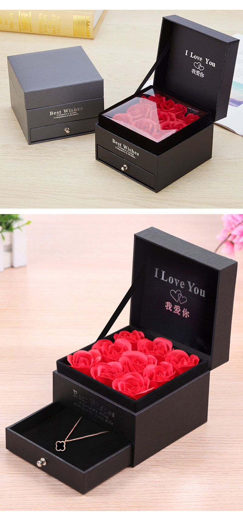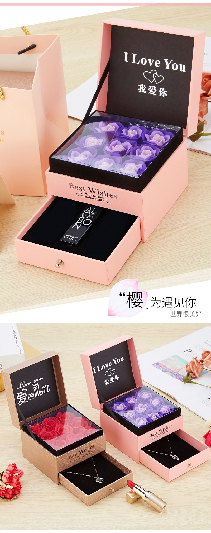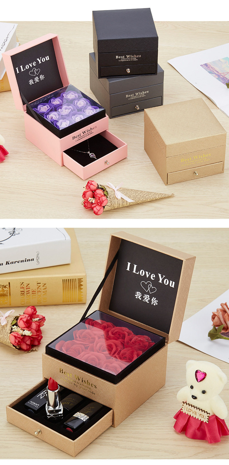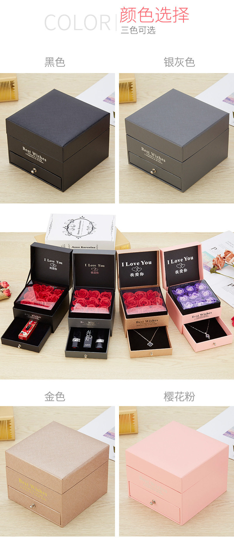 | Specification model | Empty box (excluding gift bag + flowers); necklace with double ring holes (excluding accessories),Empty box (excluding gift bag + flower); single lipstick slot (excluding lipstick),Gray i love you [11*11*9]; necklace with double ring holes (excluding accessories),Gray i love you model [11*11*9]; single lipstick slot (lipstick not included),Gray wordless model [11*11*9]; necklace with double ring holes (excluding accessories),Gray wordless model [11*11*9]; single lipstick slot (lipstick not included) |