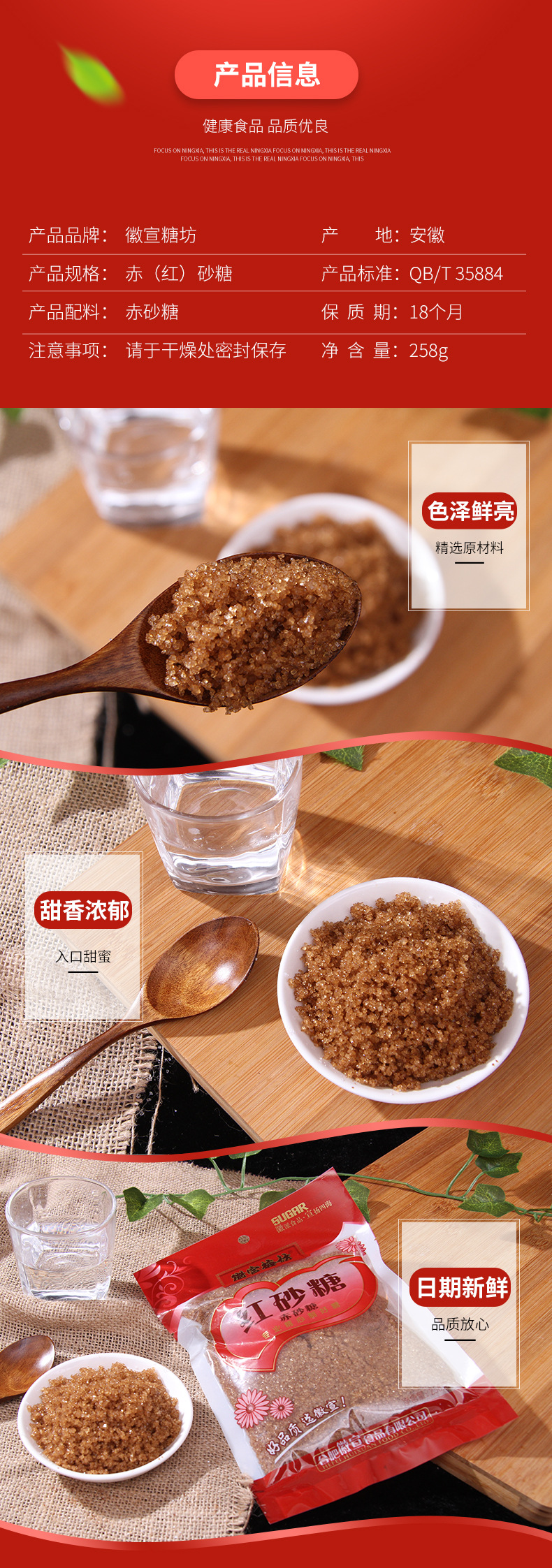 | Packaging specifications | Red sugar 258g bag |