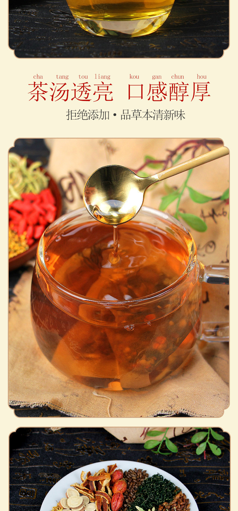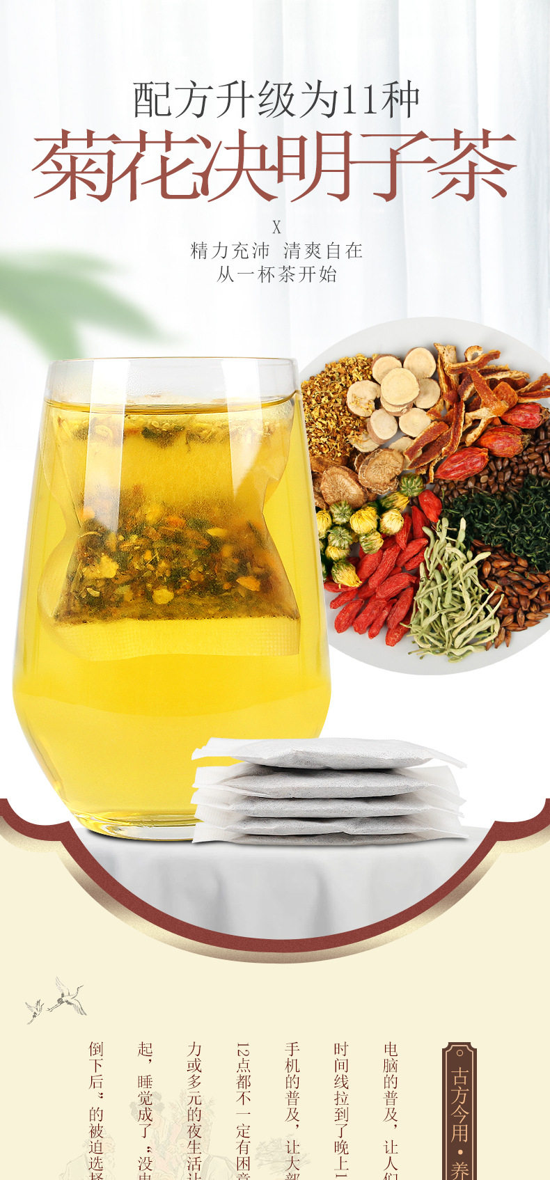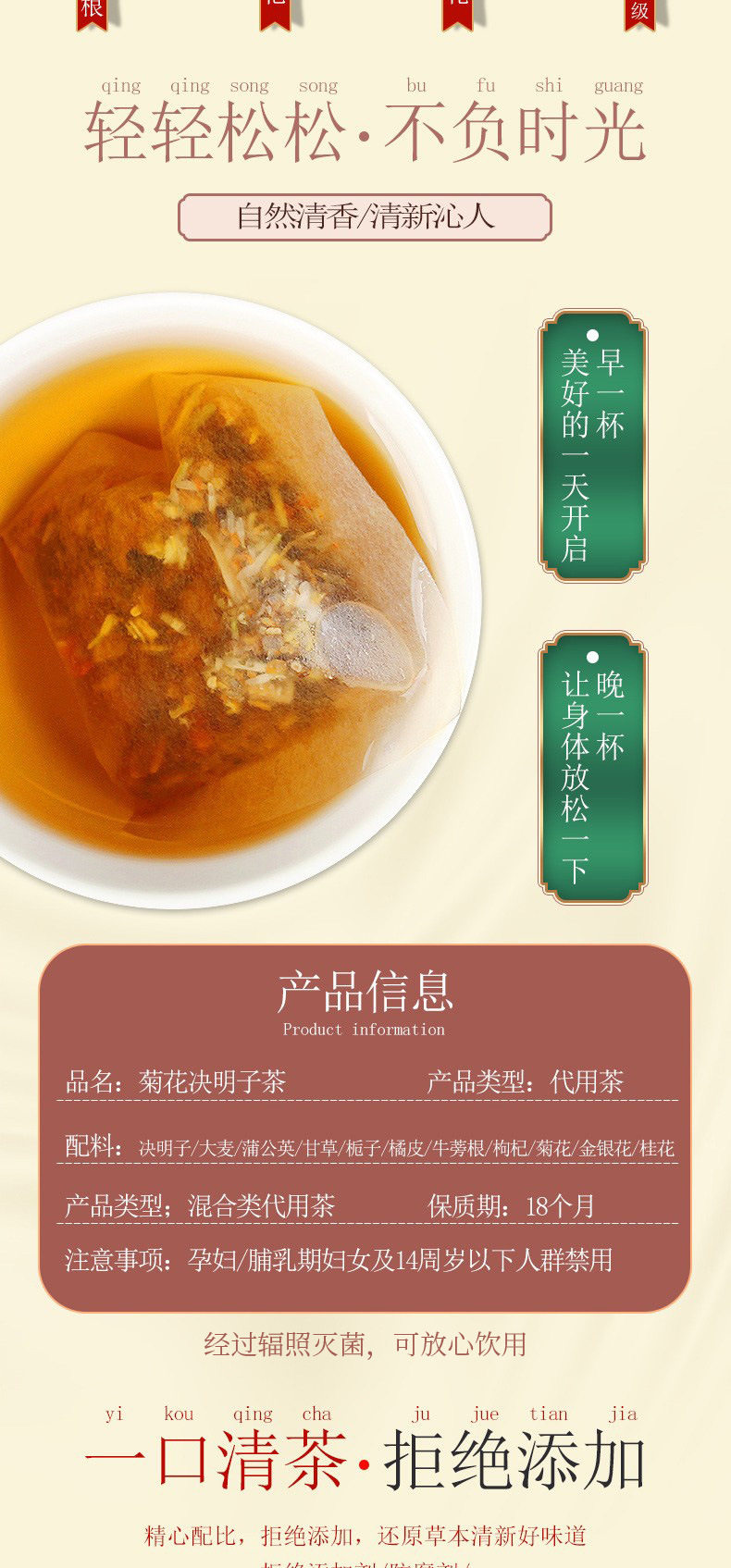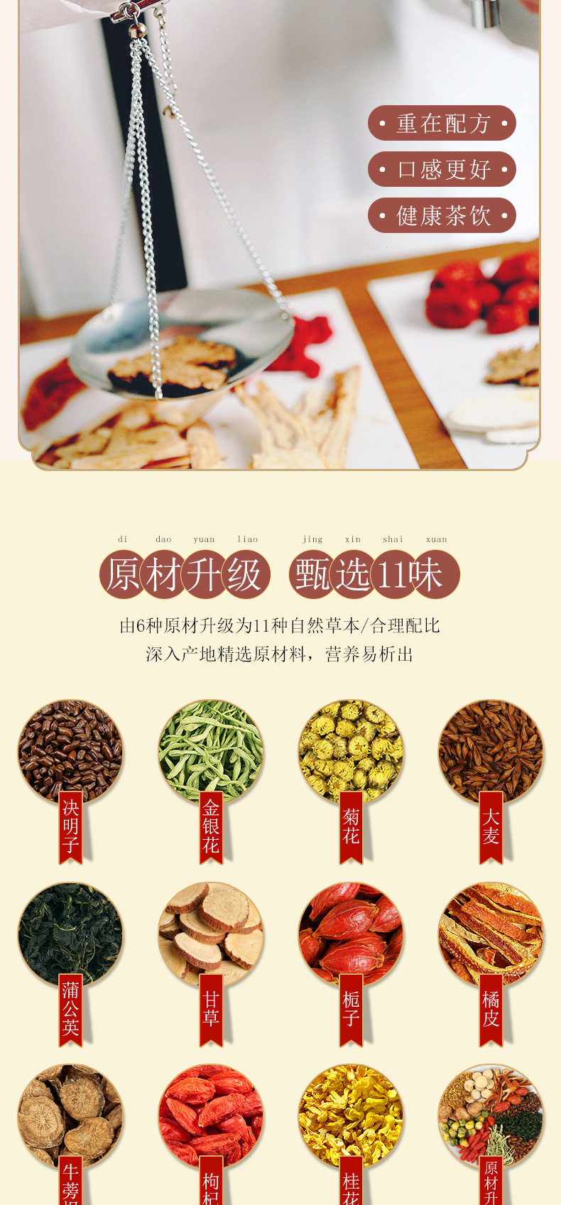 | Raw materials and ingredients | Cassia seeds, barley, dandelions, licorice, gardenia, orange peel, burdock root, wolfberry, chrysanthemum, honeysuckle, osmanthus |