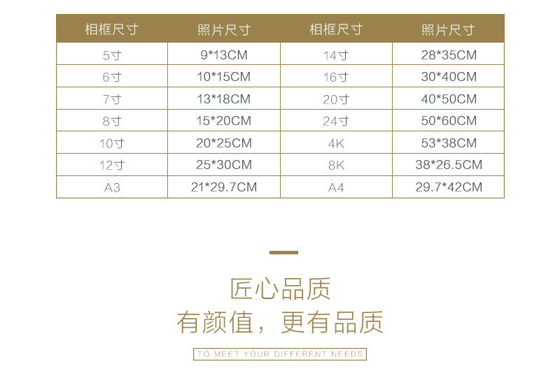 | Inner frame size | 5inch (9*12.8cm) table setting,6inch (10.1*15.1cm) table setting,7inch (12.8*17.8cm) table and wall hanging,8 inch (15*20cm) pendulum wall,10inch (20.2*25.3cm) table and wall hanging,A4 (21*29.7cm) table and wall hanging,12inch (25*30cm) wall hanging,16inch (30*40cm) wall hanging,A3 (29.7*42cm) wall hanging |