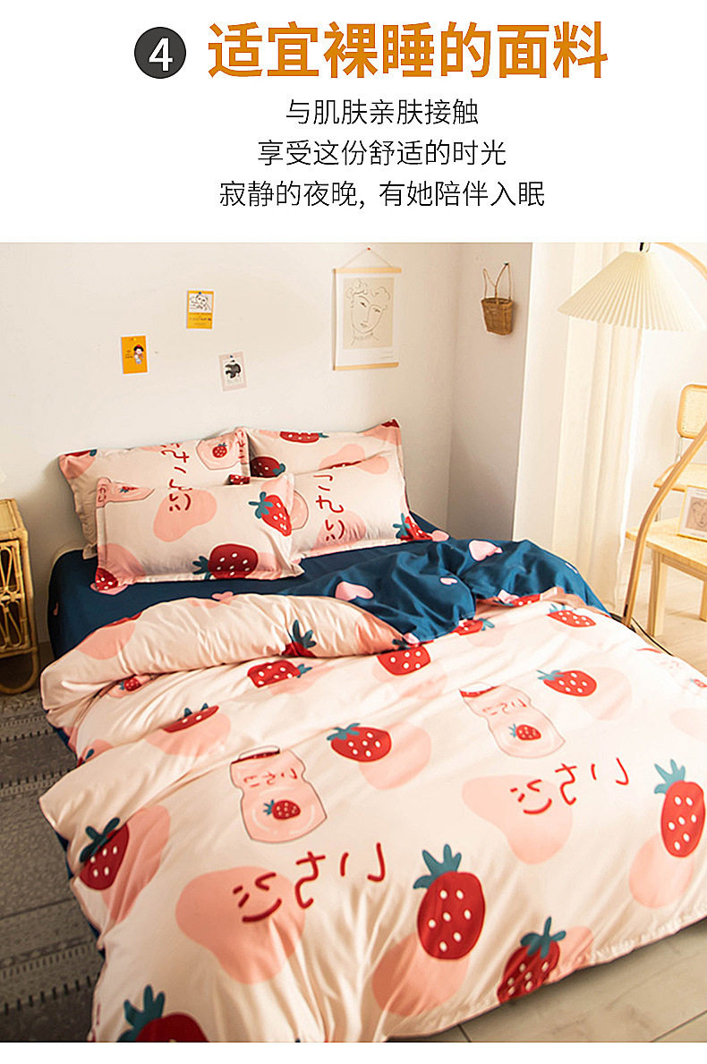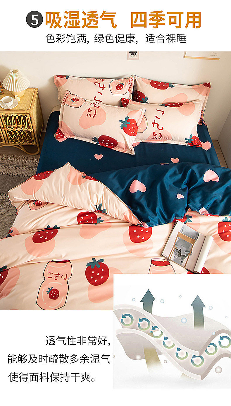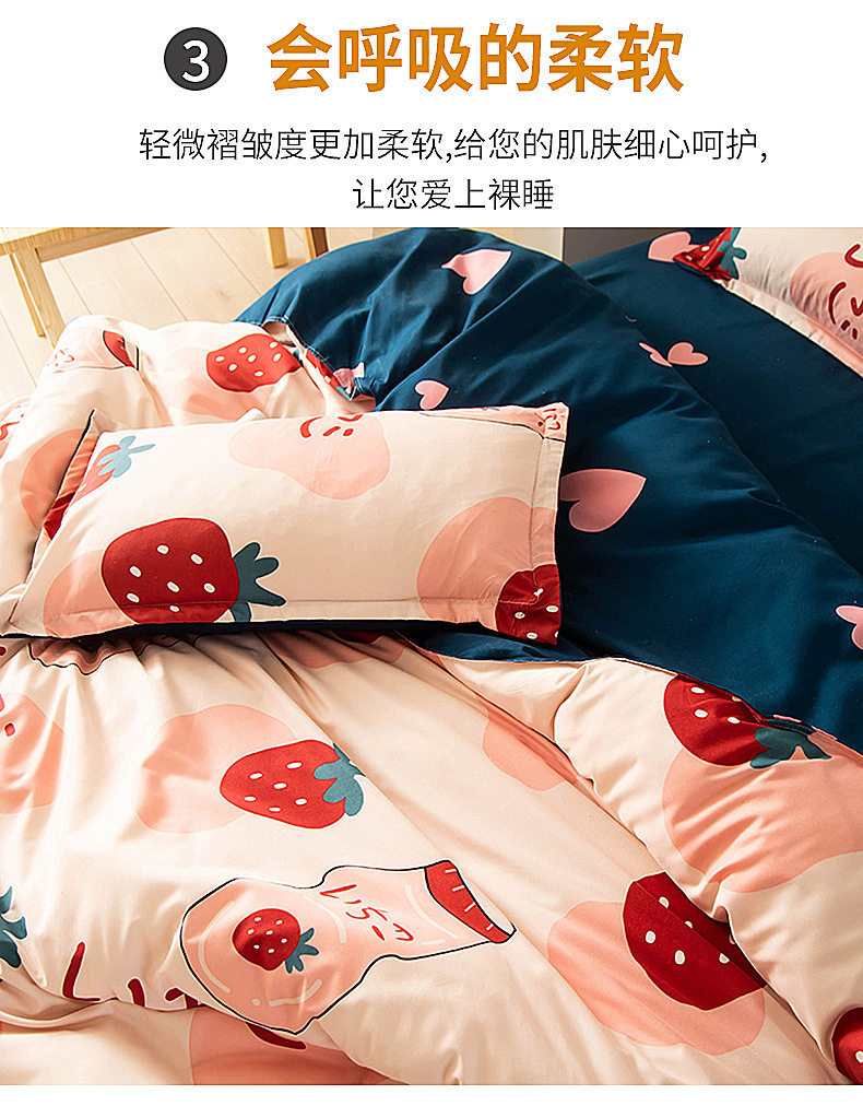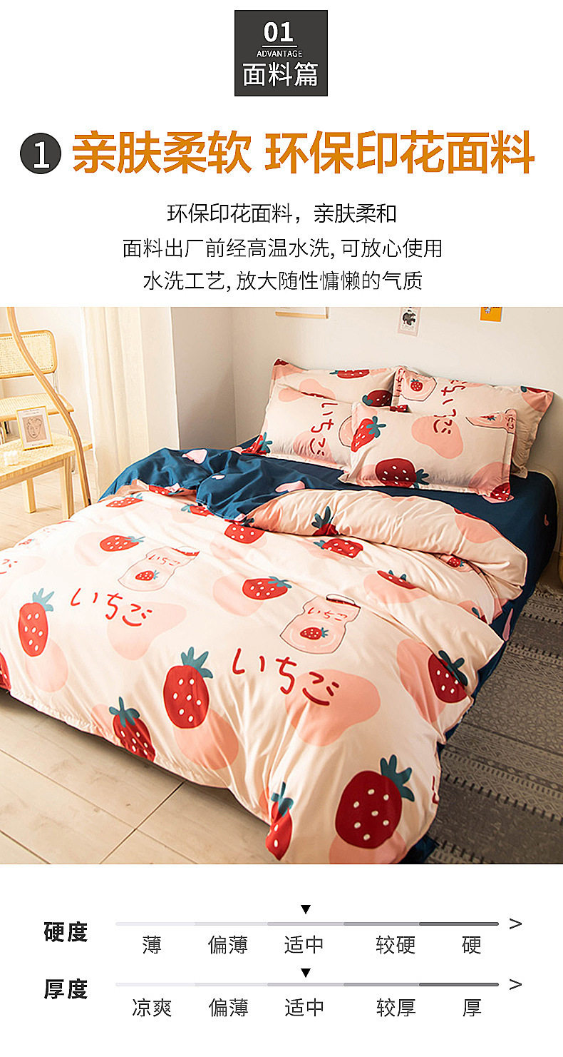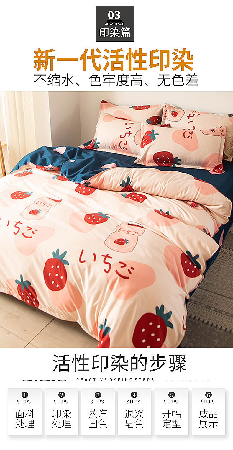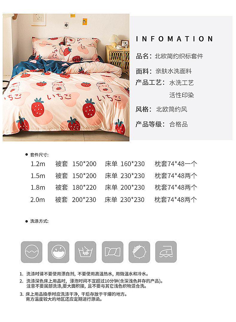 | Dimensions | 1.2m bed [quilt cover 150x200cm/sheet 150x230cm] three-piece set,1.5m bed [quilt cover 150x200cm/sheet 200x230cm] four-piece set,1.8m bed [quilt cover 180x220cm/sheet 230x230cm] four-piece set,2.0m bed [quilt cover 200x230cm/sheet 230x230cm] four-piece set,2.2m bed [quilt cover 220x240cm/sheet 230x250cm] four-piece set |