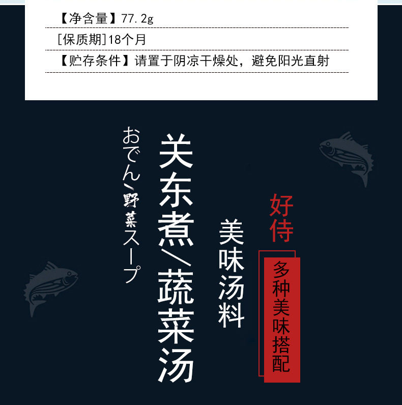 | Raw materials and ingredients | Edible salt, white sugar, soy sauce, dried bonito, yeast powder, kelp powder, vegetable oil, etc. |