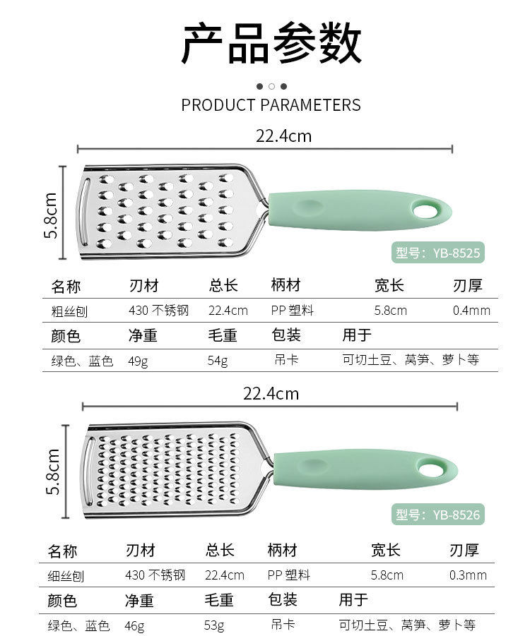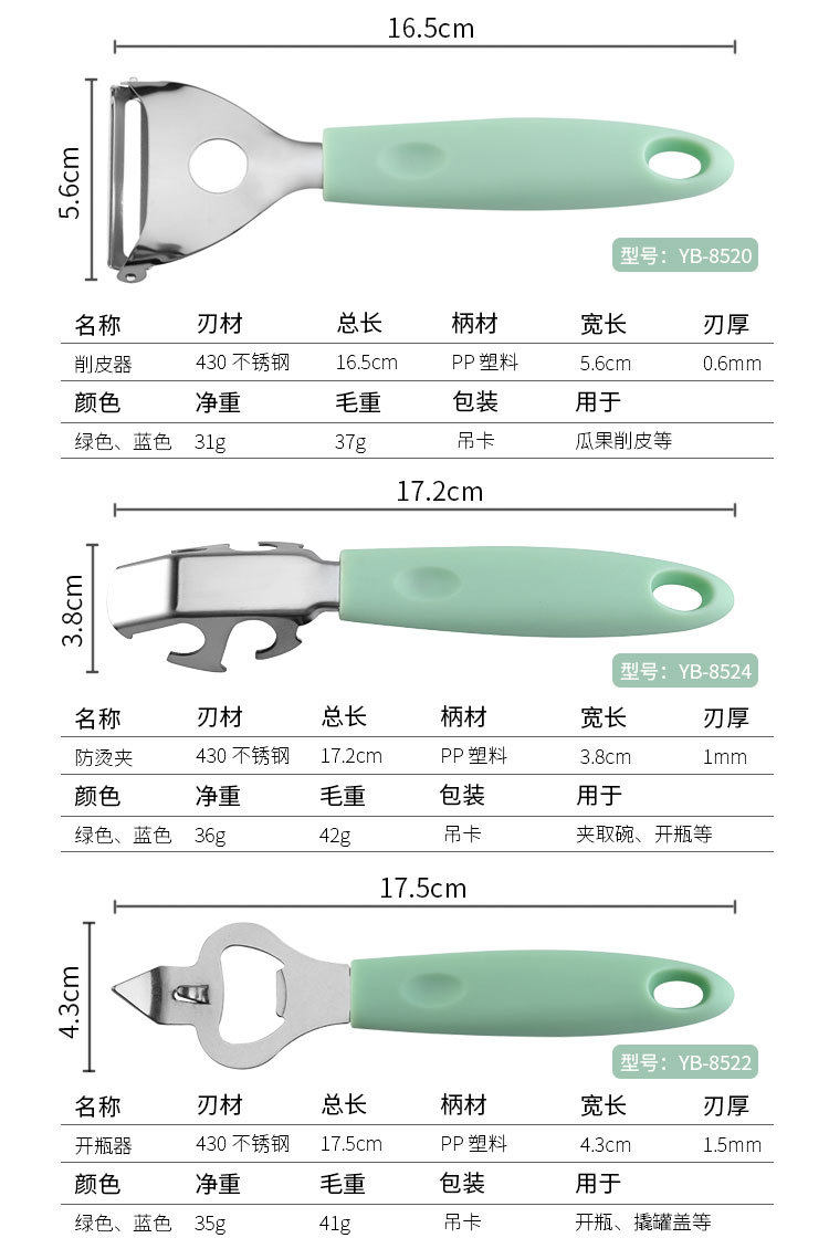 | Specifications | YB8521 Multi-purpose Planer Green,YB8521 Multi-purpose Planer Blue,YB8524 bowl dish clip Green,YB8524 bowl dish clip Blue,YB8520 melon and fruit planed Green,YB8520 melon and fruit Planer Blue,YB8525 radish Planer Green,YB8525 radish planer blue,YB8523 Egg Beater Green,YB8523 egg beater Blue,YB8526 ginger shave Green,YB8526 ginger shavings Blue,YB8522 bottle opener Green,YB8522 Bottle Opener Blue |