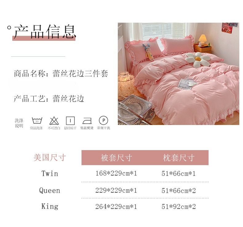 | Dimensions | Two-piece quilt cover 168*229cm pillowcase 51*66cm,Three-piece quilt cover 229*229cm pillowcase 51*66cm * 2,Three-piece quilt cover 264*229cm pillowcase 51*92*2 |