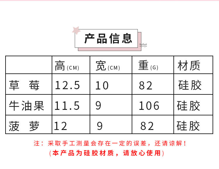 | Color | Strawberry,Avocado,Pineapple,Pikachu,Yugui Dog,Cartoon Pikachu,Lina belle,Melody,Ballet Rabbit,Yellow Rabbit |