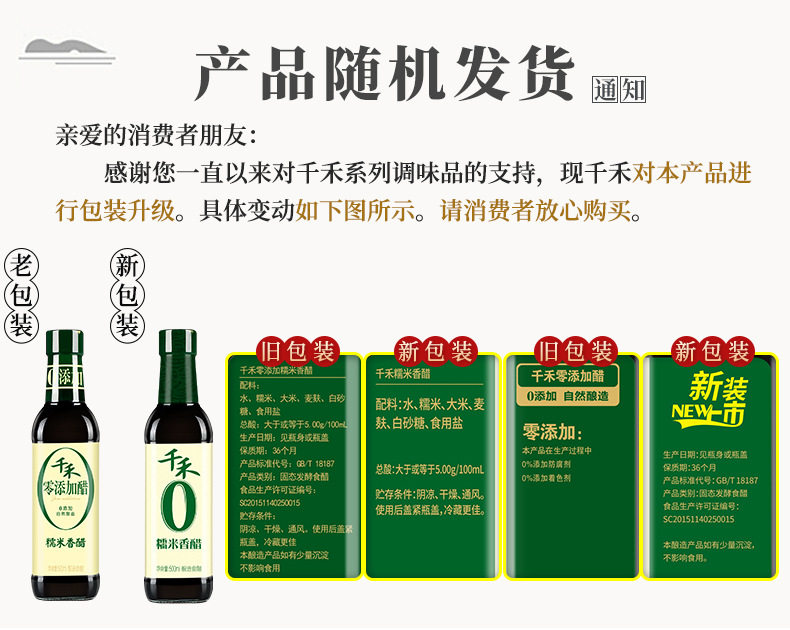 | Packaging specifications | Qianhe glutinous rice vinegar 500ml |