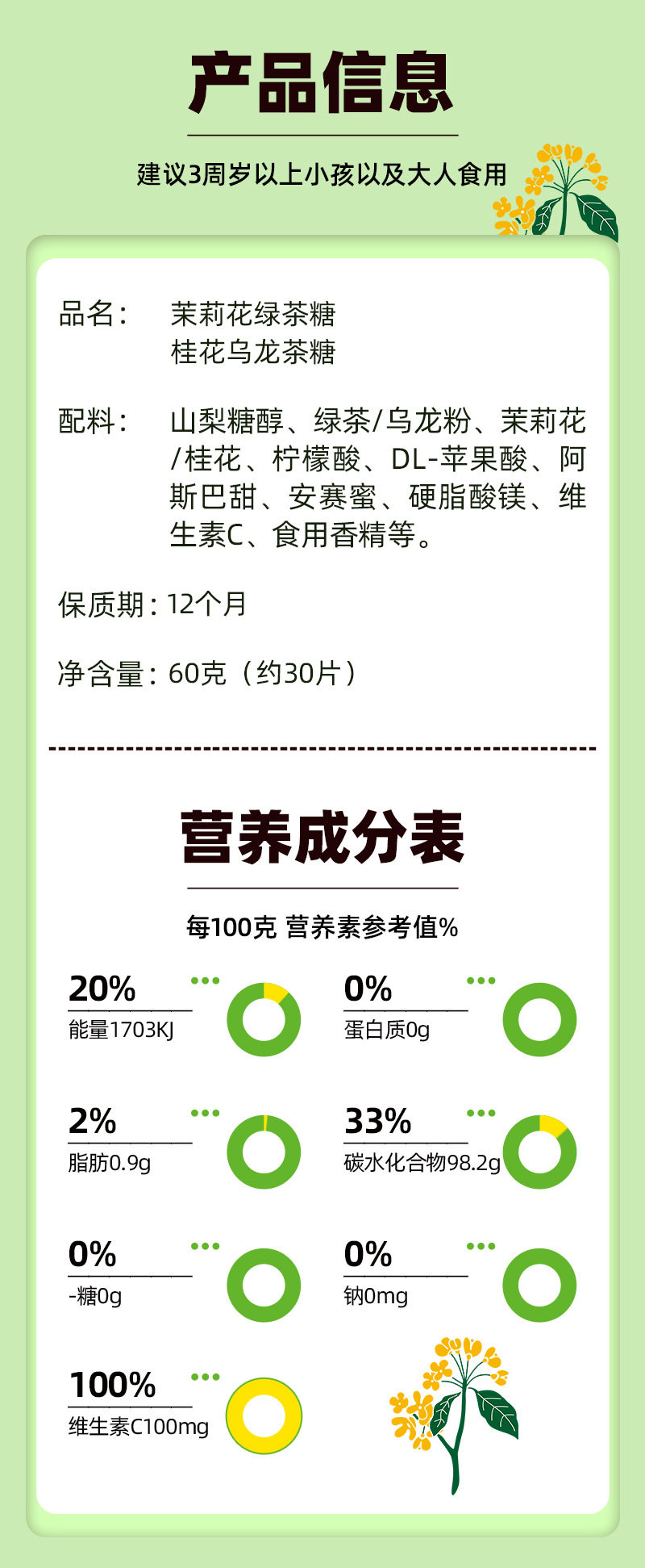 | Packaging specifications | 60g prebiotic bears (about 10 sticks),60g prebiotic calf (about 10 sticks),60g prebiotic duck (about 10 sticks),60 lactic acid bacteria old yogurt sticks (about 10 sticks),60g vitamin c hawthorn sticks (about 10 sticks),80g3d building block milk tablets,60g sugar-free green plum lollipops (about 10 sticks),60g sugar-free tangerine peel lollipops (about 10 sticks),60g sugar-free lime lollipops (about 10 sticks),80g tangerine peel lozenges (about 30 pieces),80g sour plum lozenges (about 30 pieces),60g jasmine green tea (about 30 pieces),60g osmanthus oolong tea (about 30 pieces),60g sugar-free green plum lozenges (about 25 pieces),60g sugar-free tangerine peel lozenges (about 25 pieces),60g sugar-free bergamot lozenges (about 25 pieces),20g tangerine and green plum chewable tablets (about 25 pieces),20g tangerine peel and luo han guo chewable tablets (about 25 pieces),20g blueberry and black wolfberry chewable tablets (about 25 pieces),20g bergamot lemon chewable tablets (about 25 pieces),20g sugar-free sour lemon candy (about 30 pieces),20g sugar-free sour green plum candy (about 30 pieces),20g sugar-free salty lemon candies (about 30 pieces),20g sugar-free mint candies (about 30 pieces),16g sugar-free probiotic black coffee sugar (about 25 pieces),16g sugar-free probiotic jasmine green tea sugar (about 25 pieces) |