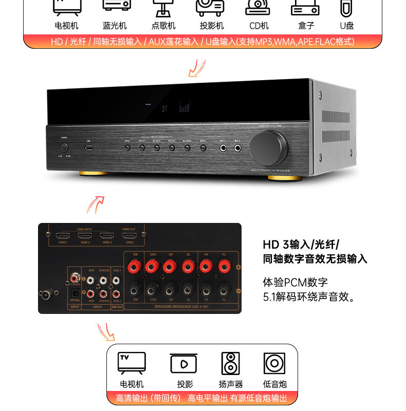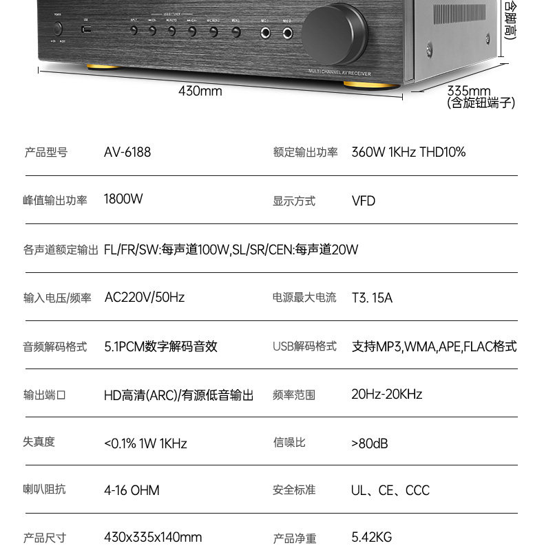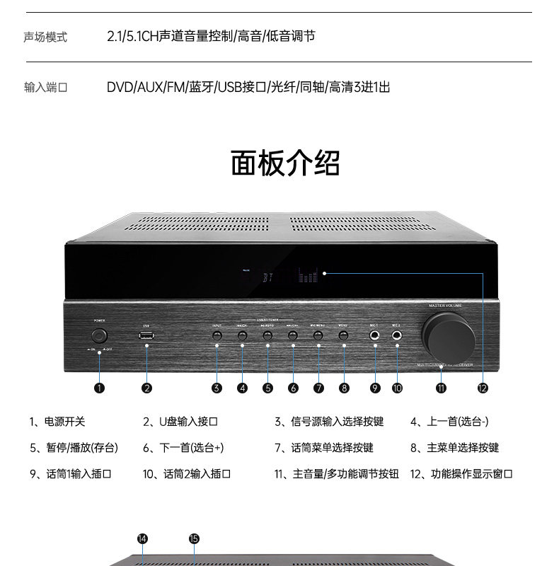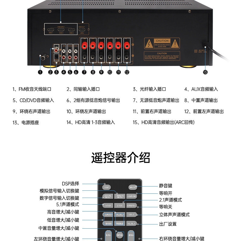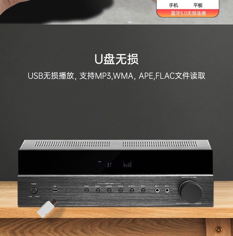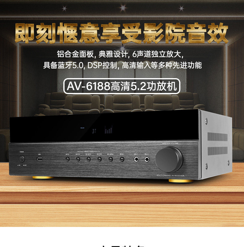 Haoyun Manufacturer Av6188 Home Karaoke High-Power Av Amplifier 5.1 Channel Wireless Bluetooth Ktv