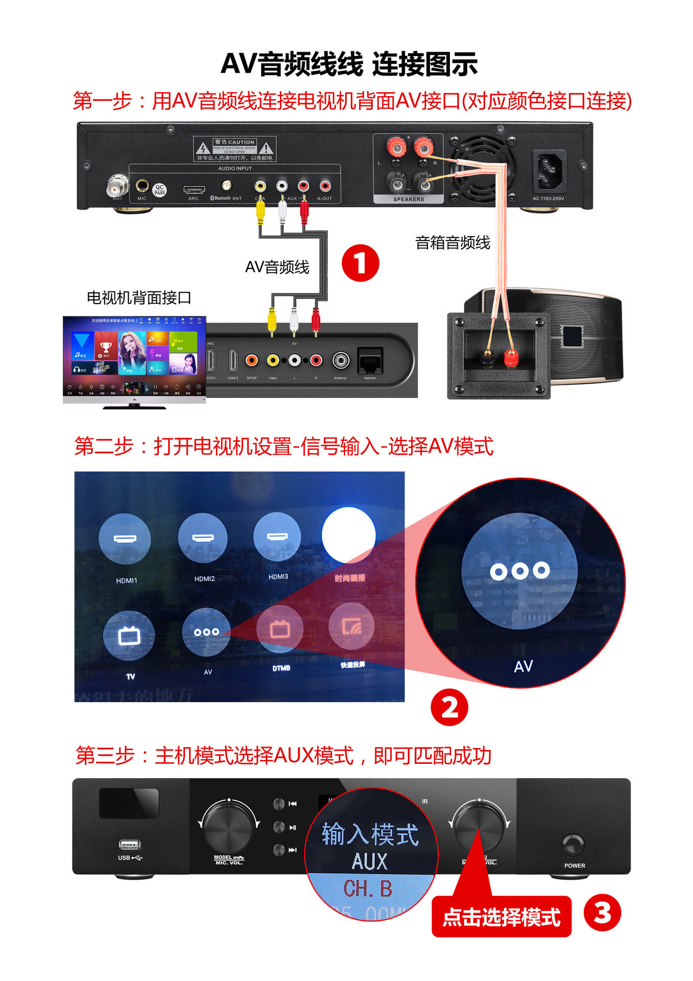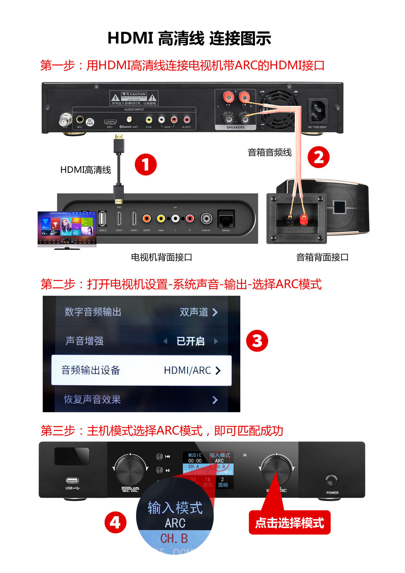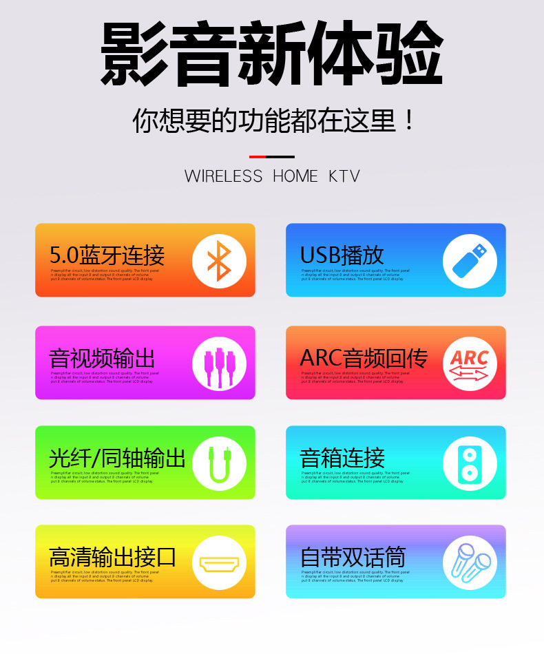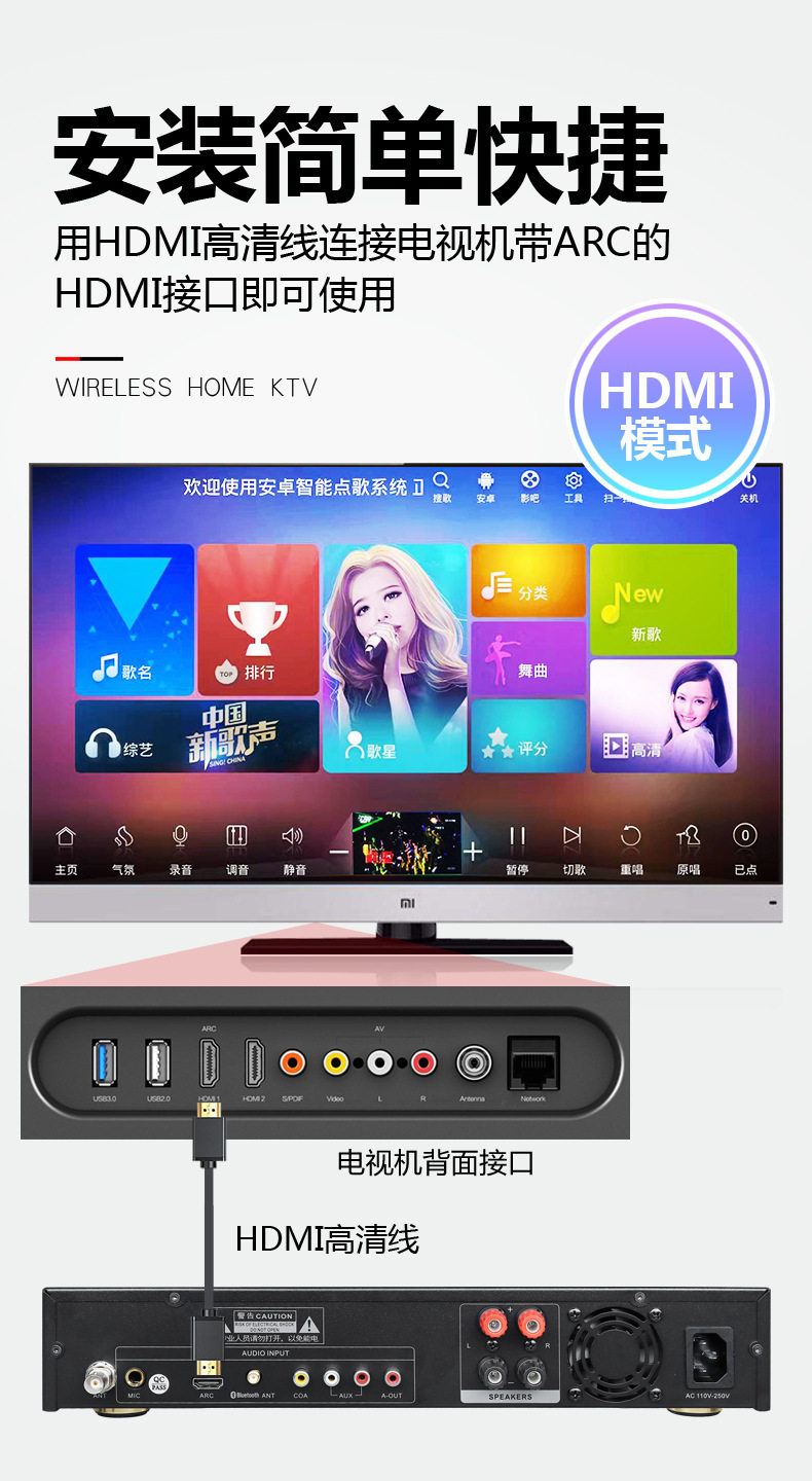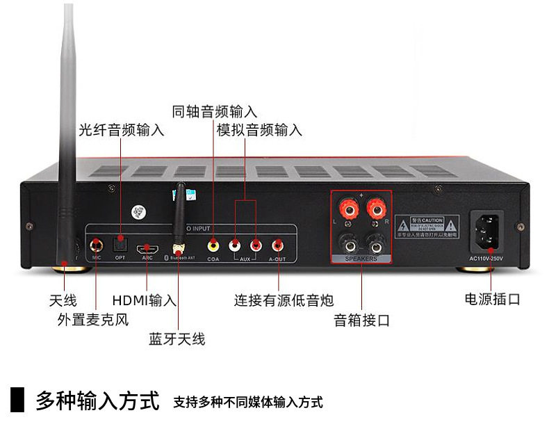 | Interface type | Coaxial audio input, optical fiber audio input, analog audio input, hdmi input, external microphone input, active subwoofer output, speaker output |