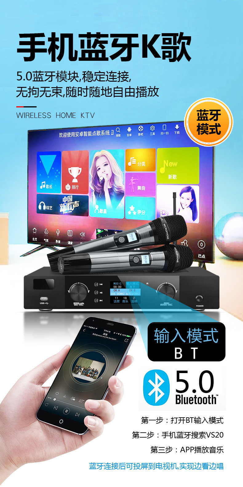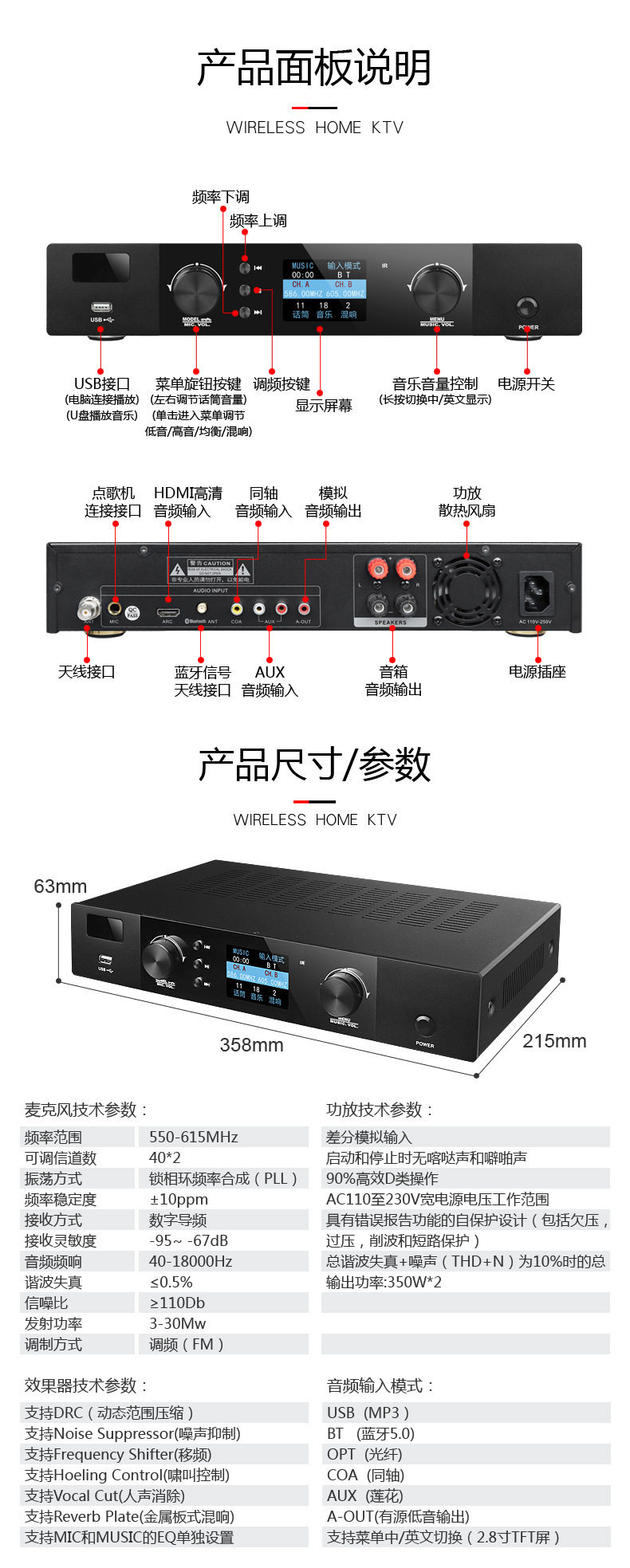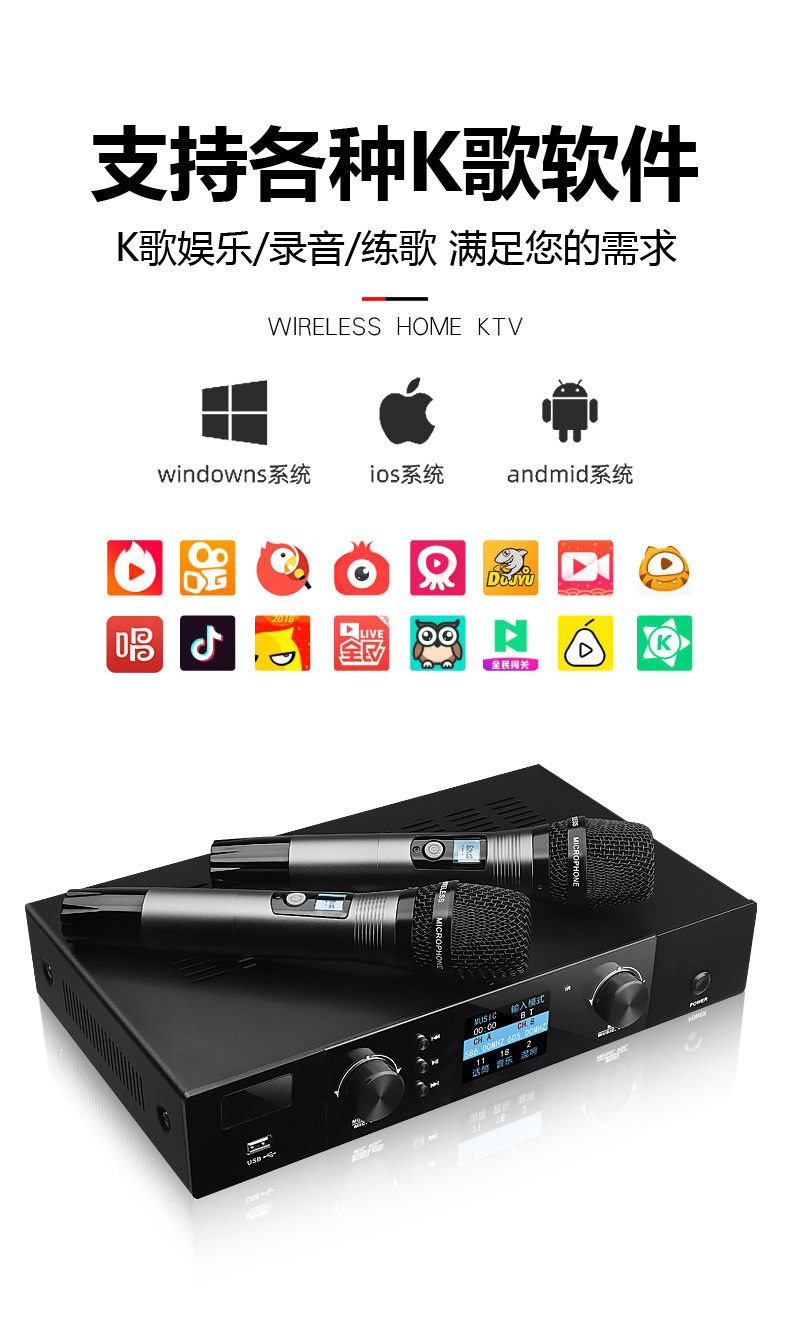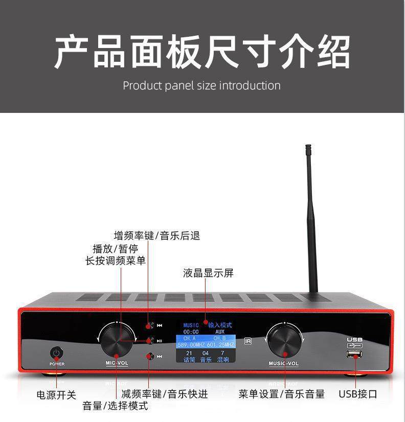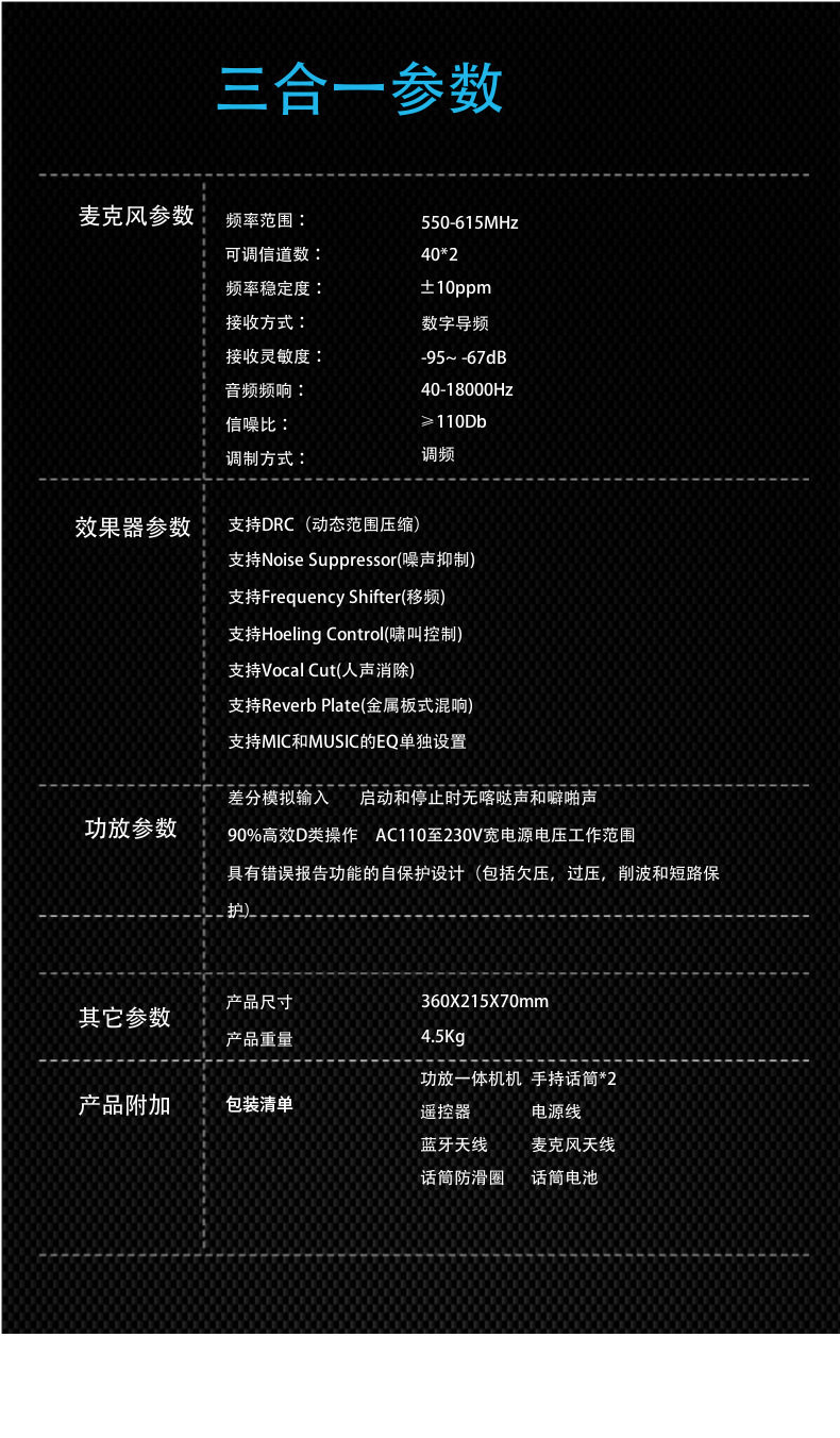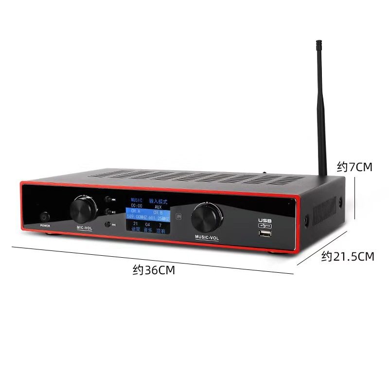 | Packing list | Amplifier all-in-one machine*1, microphone*2, remote control*1, power cord*1, bluetooth antenna*1, microphone antenna*2, microphone anti-slip ring*1, battery |