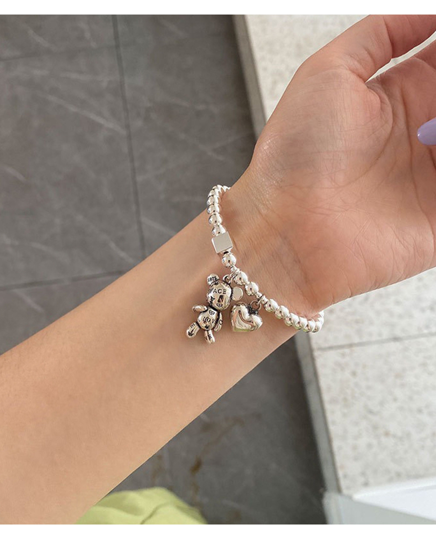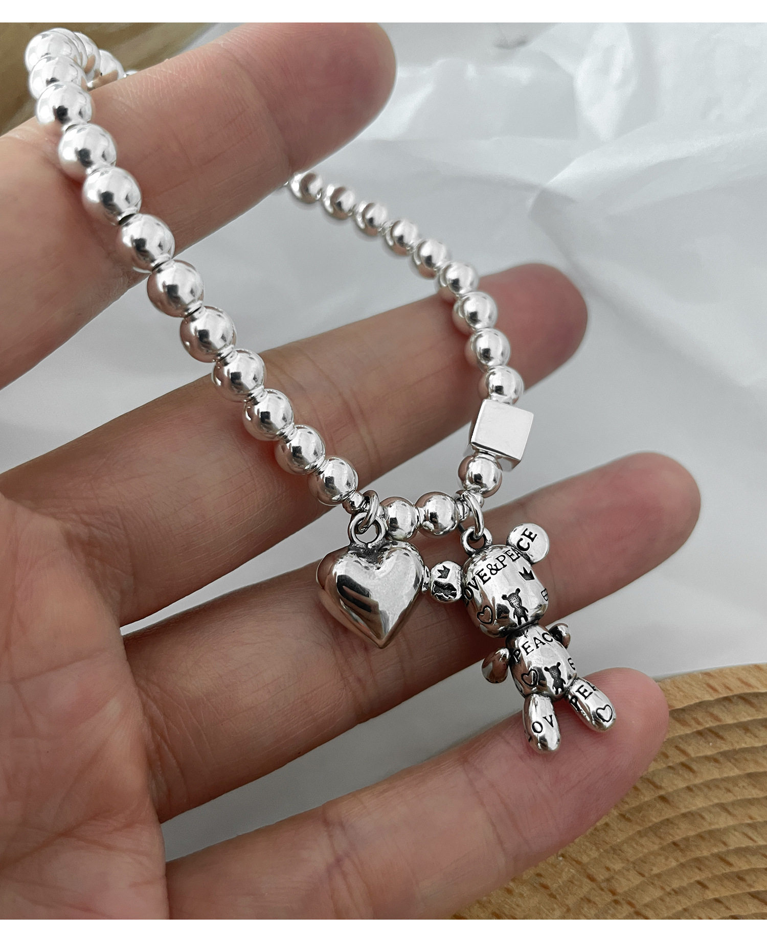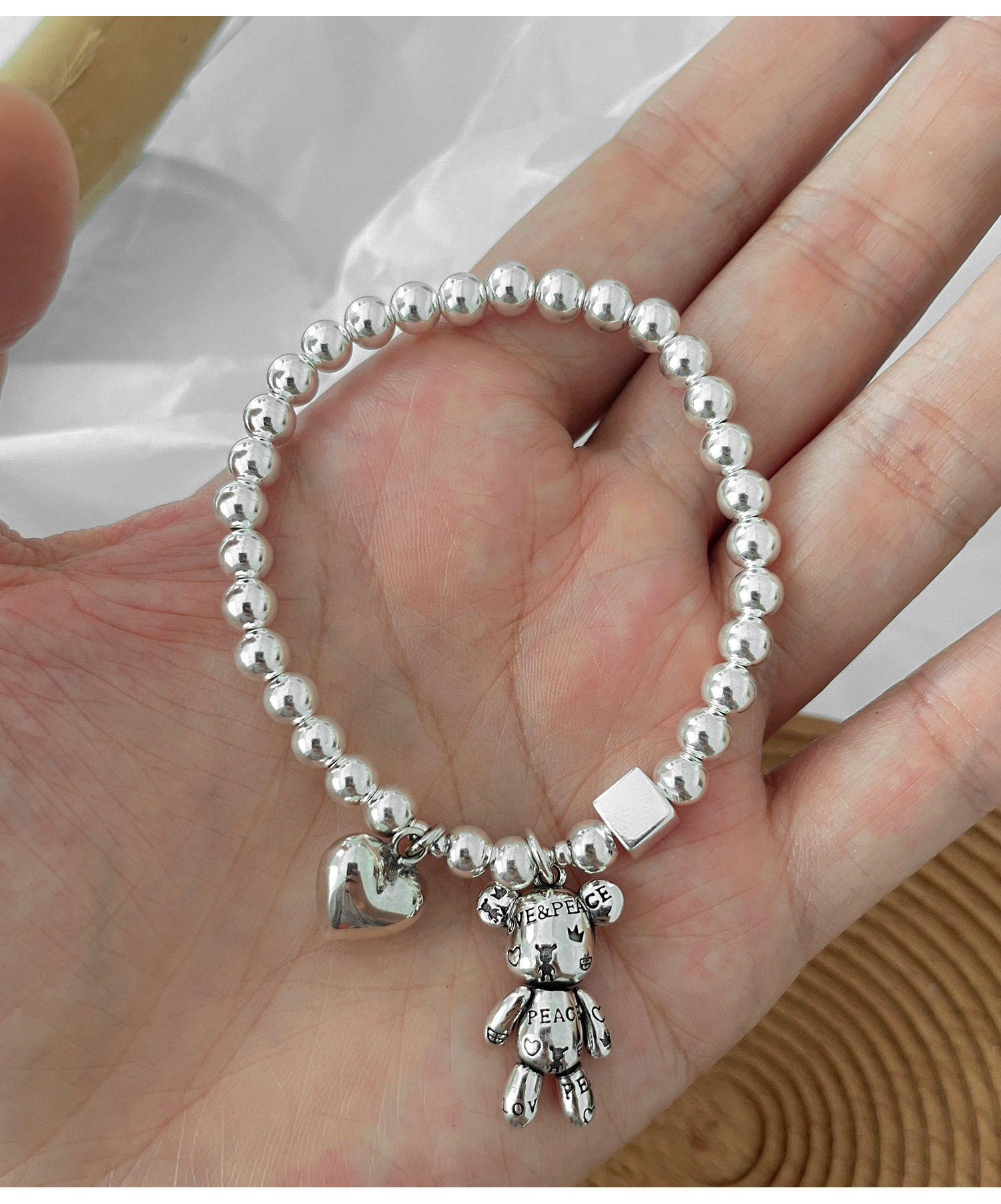 Korean Style S925 Silver-Plated Bear Bracelet for Women, Vintage Fashion Heavy-Duty Heart Bracelet, Round Bead Square Creative Jewelry Trend