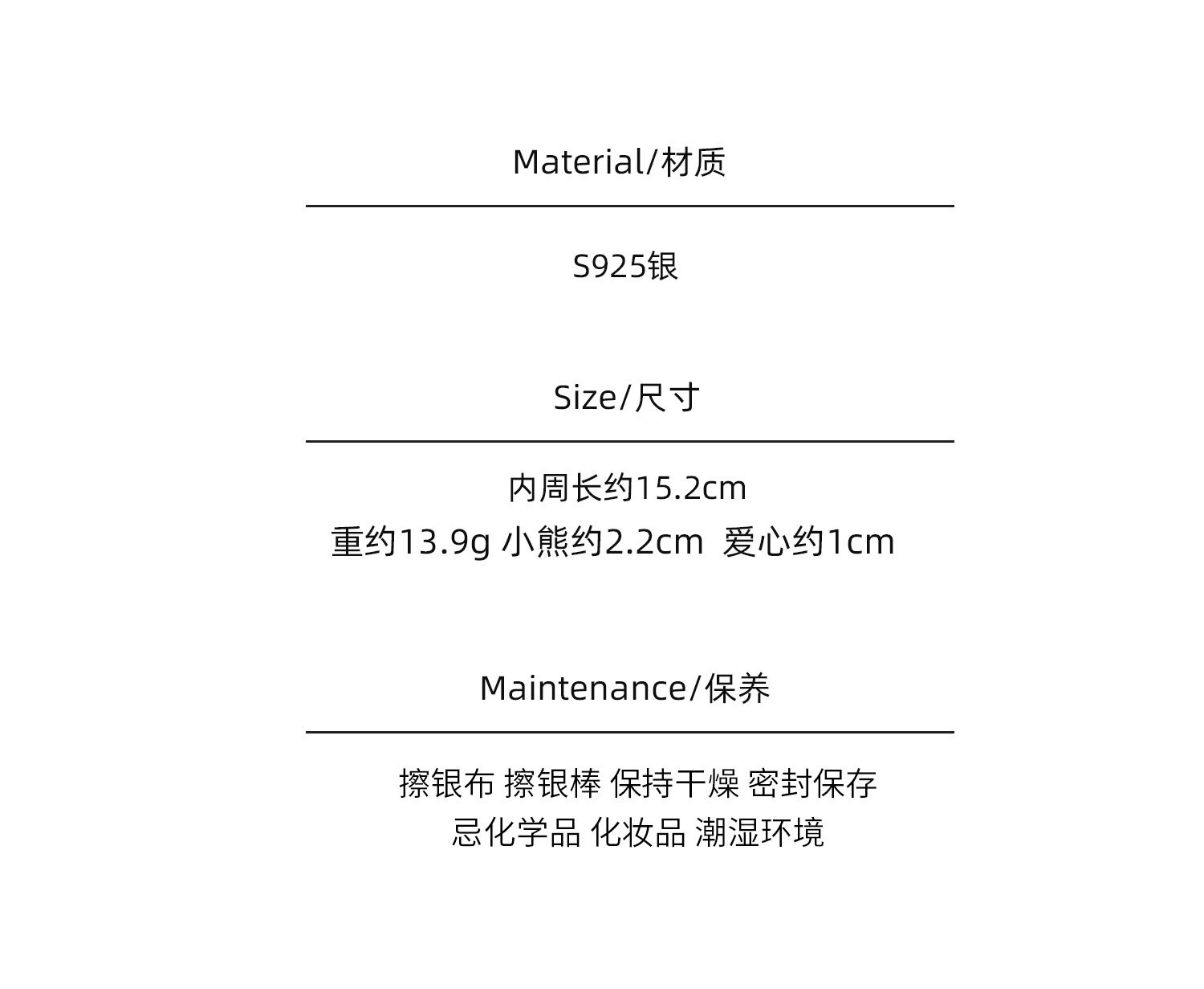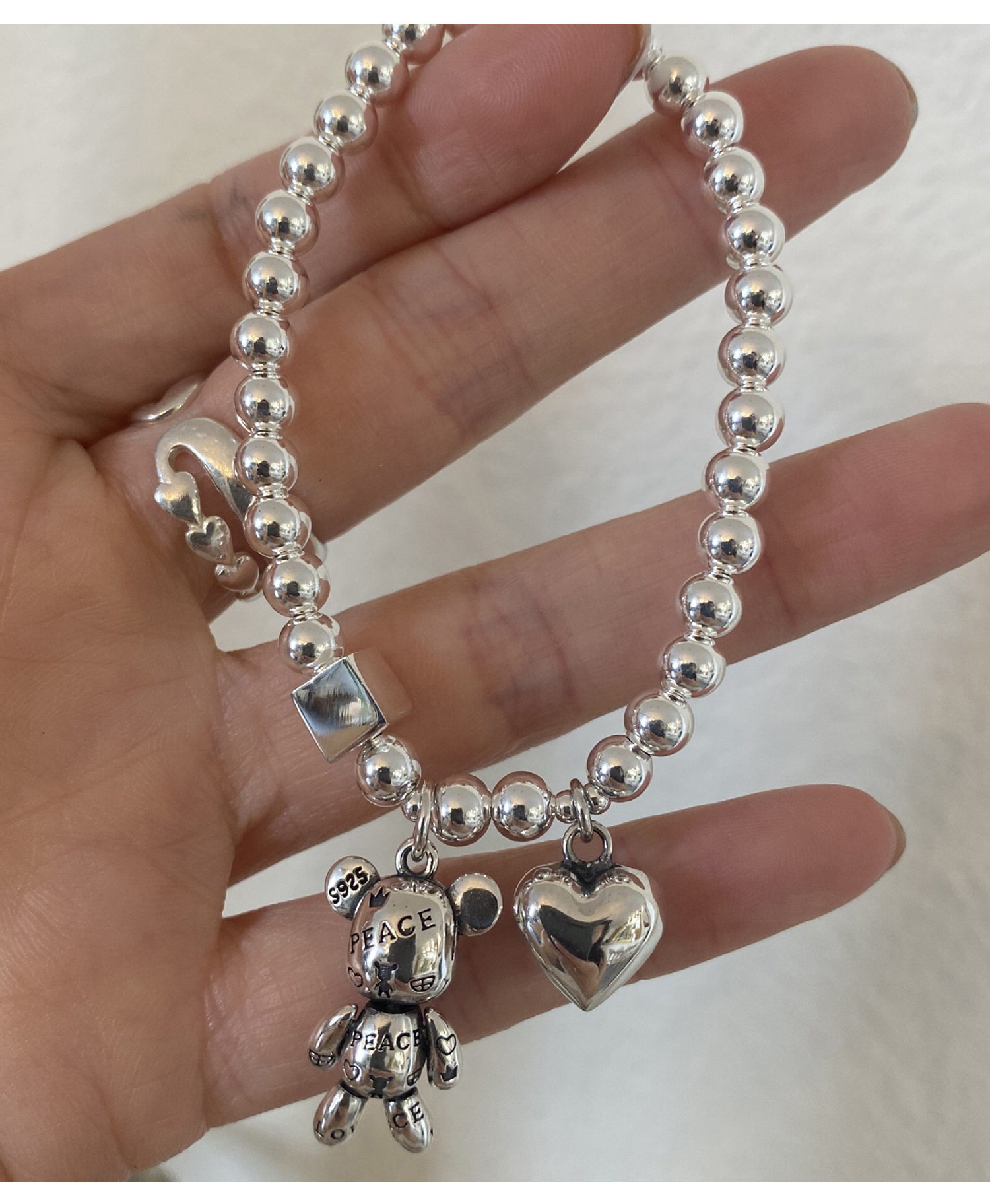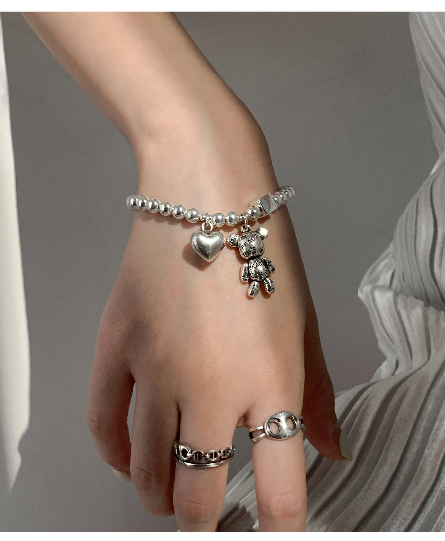 Korean Style S925 Silver-Plated Bear Bracelet for Women, Vintage Fashion Heavy-Duty Heart Bracelet, Round Bead Square Creative Jewelry Trend