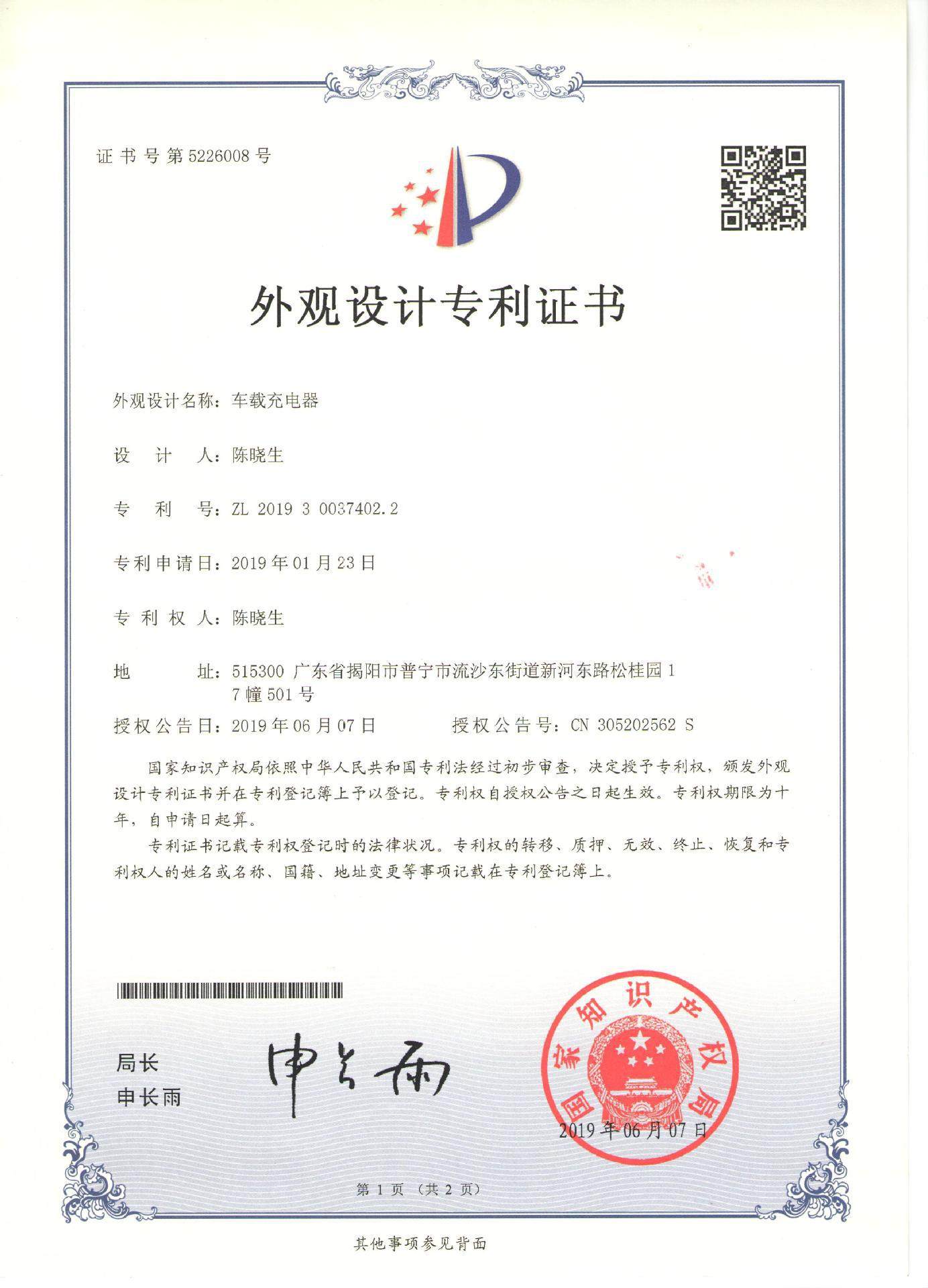 | Patent No. | ZL20190227780.7 |