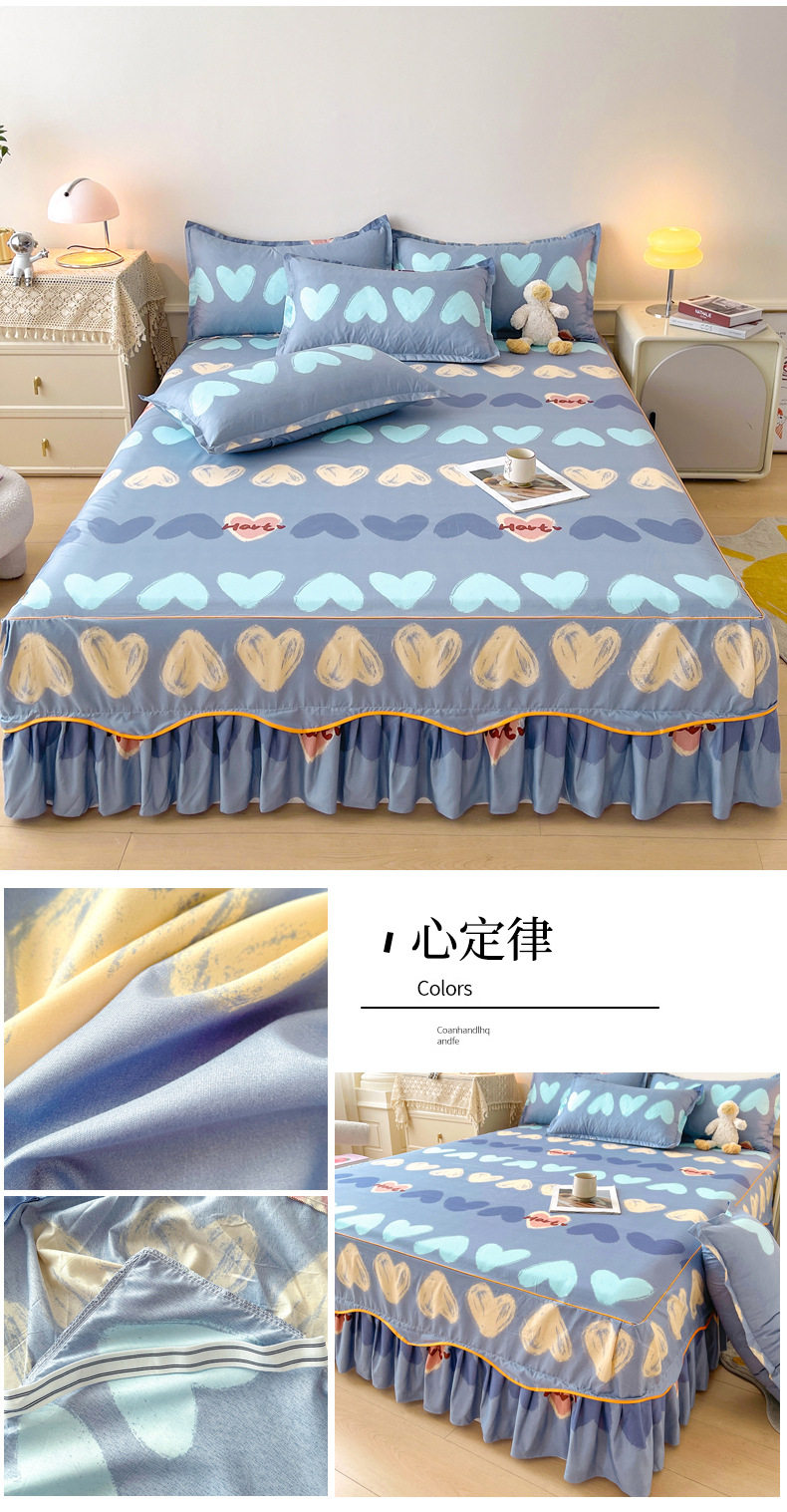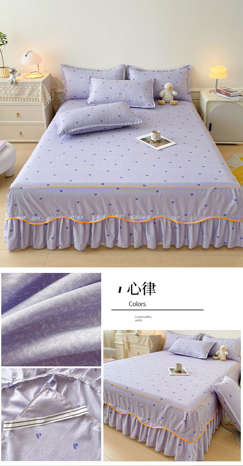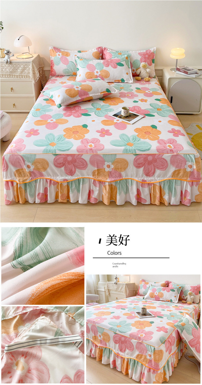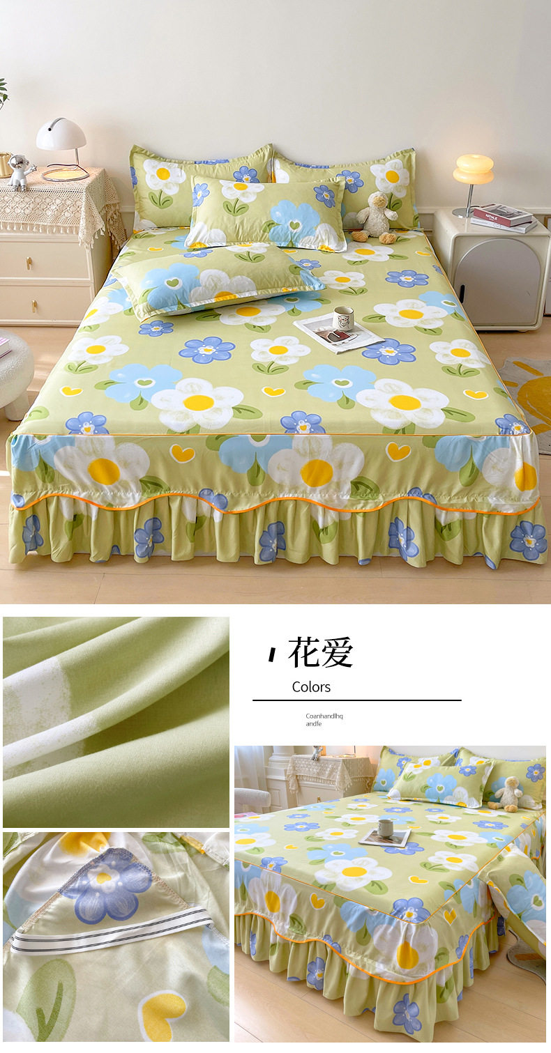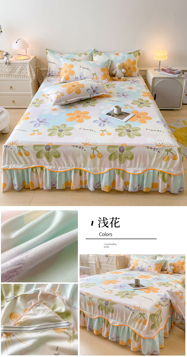 | Dimensions | 1.5 four-piece set [bed skirt 150*200cm, quilt cover 180*200, pillowcase 48*74*2]],1.8 four-piece set [bed skirt 180*200, quilt cover 200*230, pillowcase 48*74cm * 2]],1.8*2.2 four-piece set [bed skirt 180*220, quilt cover 200*230, pillowcase 48*74cm * 2]],2 m four-piece set [bed skirt 200*220cm, quilt 200*230cm, pillowcase 48*74cm * 2]],Single bed skirt 120*200cm,Single bed skirt 150*200cm,Single bed skirt 180*200cm,Single bed skirt 180*220cm,Single bed skirt 200*220cm,Pillowcase two 48*74 |