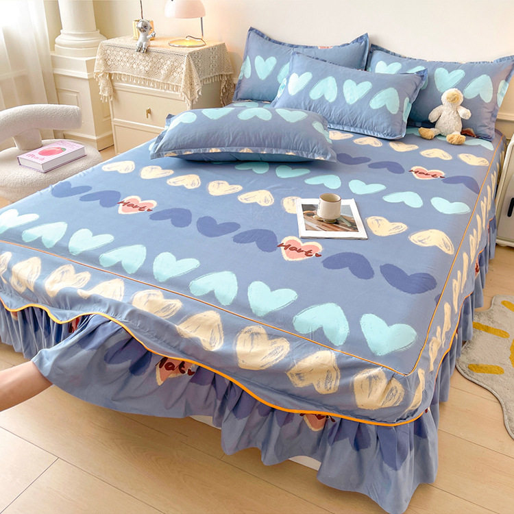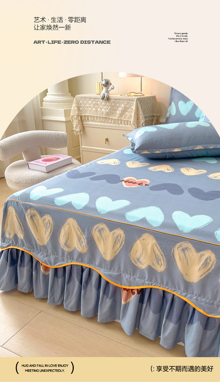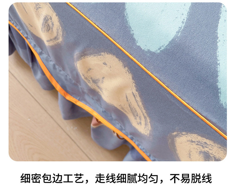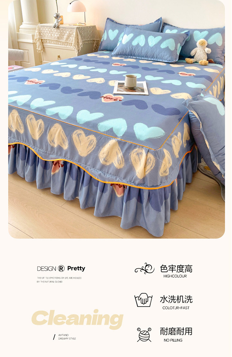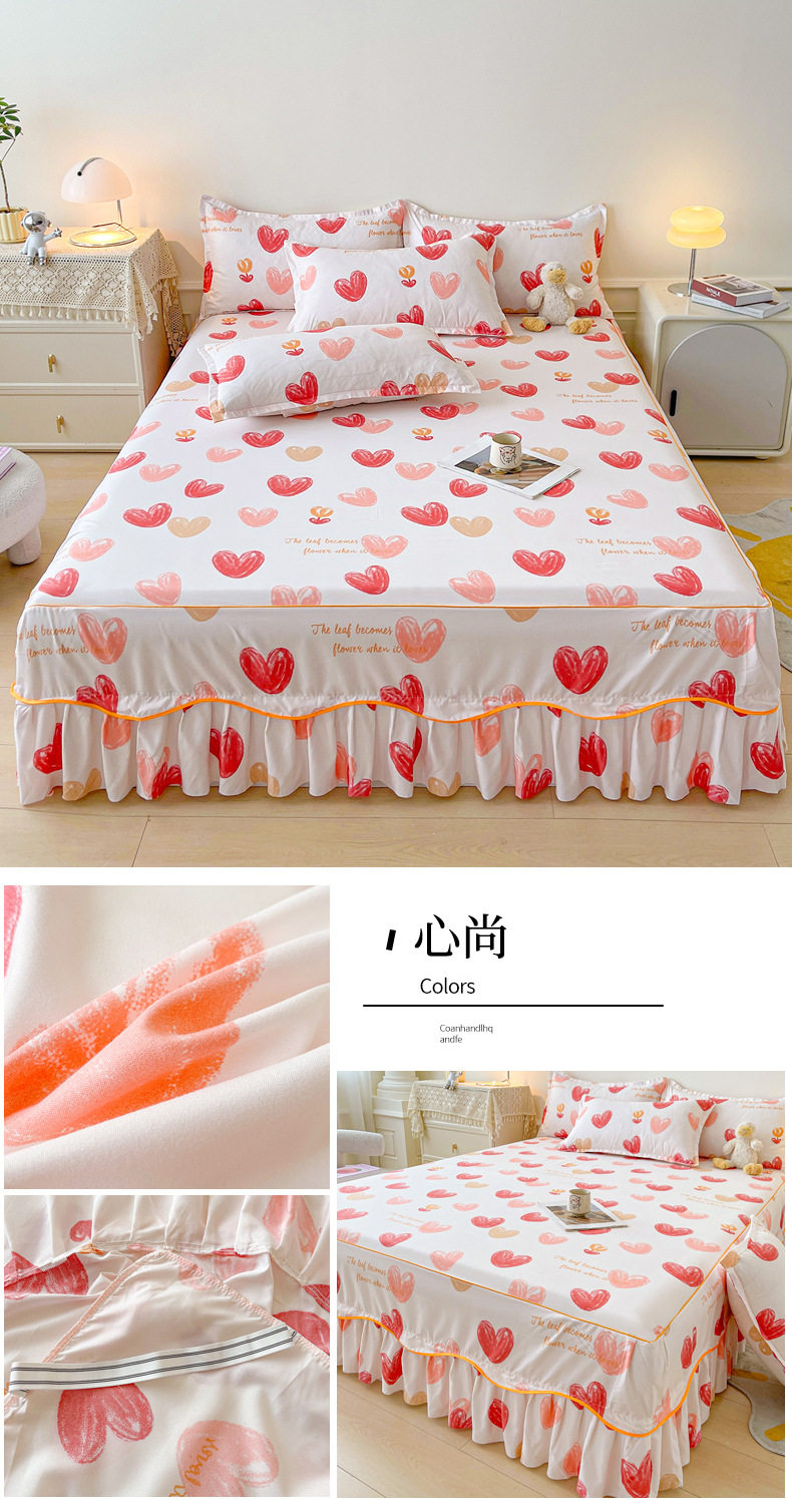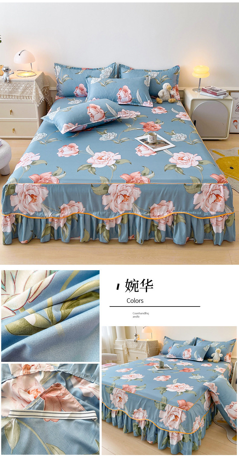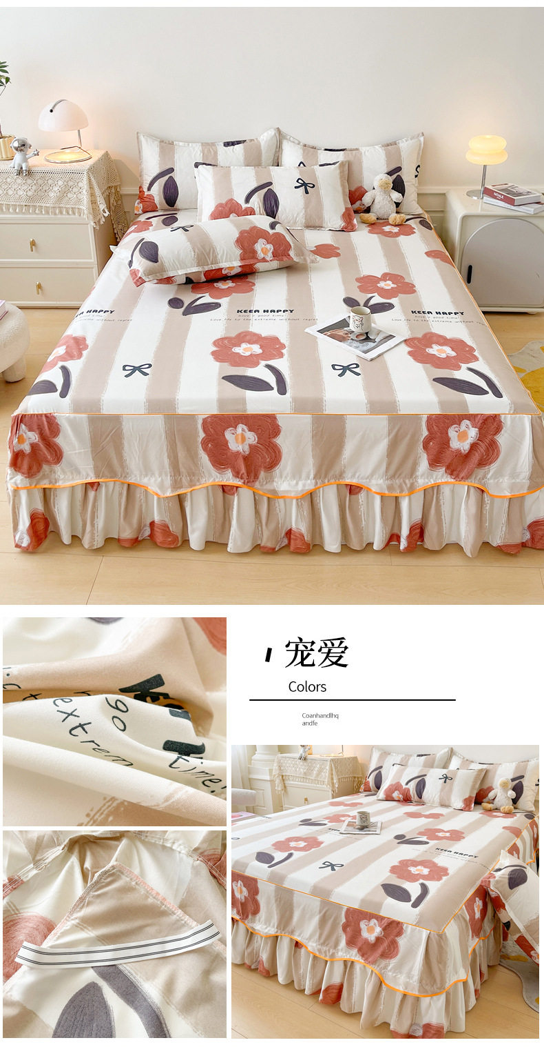 | Dimensions | 1.5 four-piece set [bed skirt 150*200cm, quilt cover 180*200, pillowcase 48*74*2]],1.8 four-piece set [bed skirt 180*200, quilt cover 200*230, pillowcase 48*74cm * 2]],1.8*2.2 four-piece set [bed skirt 180*220, quilt cover 200*230, pillowcase 48*74cm * 2]],2 m four-piece set [bed skirt 200*220cm, quilt 200*230cm, pillowcase 48*74cm * 2]],Single bed skirt 120*200cm,Single bed skirt 150*200cm,Single bed skirt 180*200cm,Single bed skirt 180*220cm,Single bed skirt 200*220cm,Pillowcase two 48*74 |
