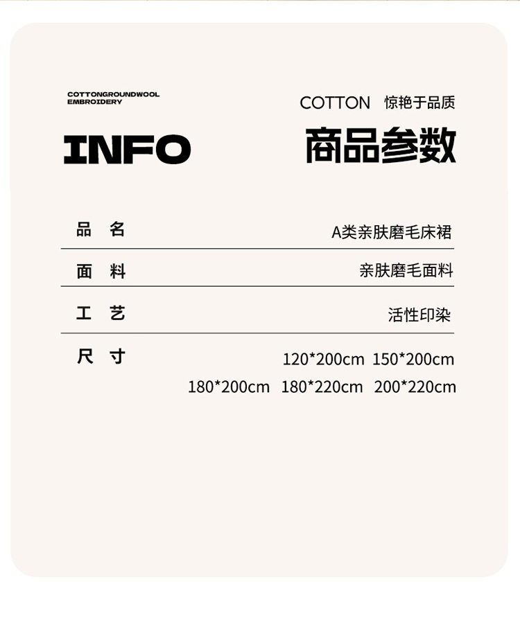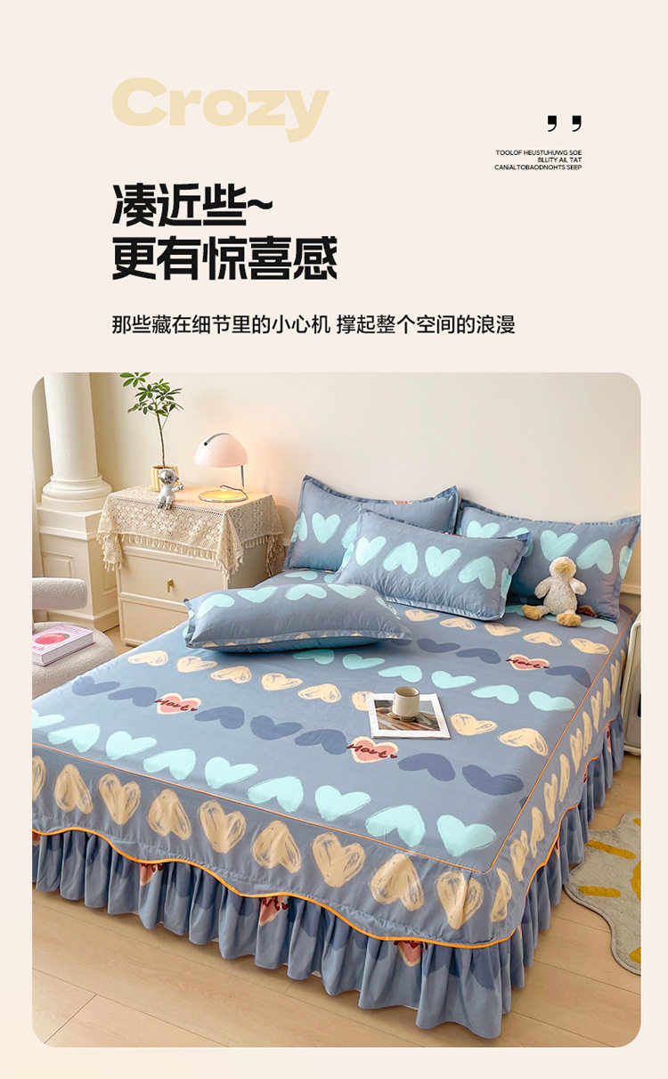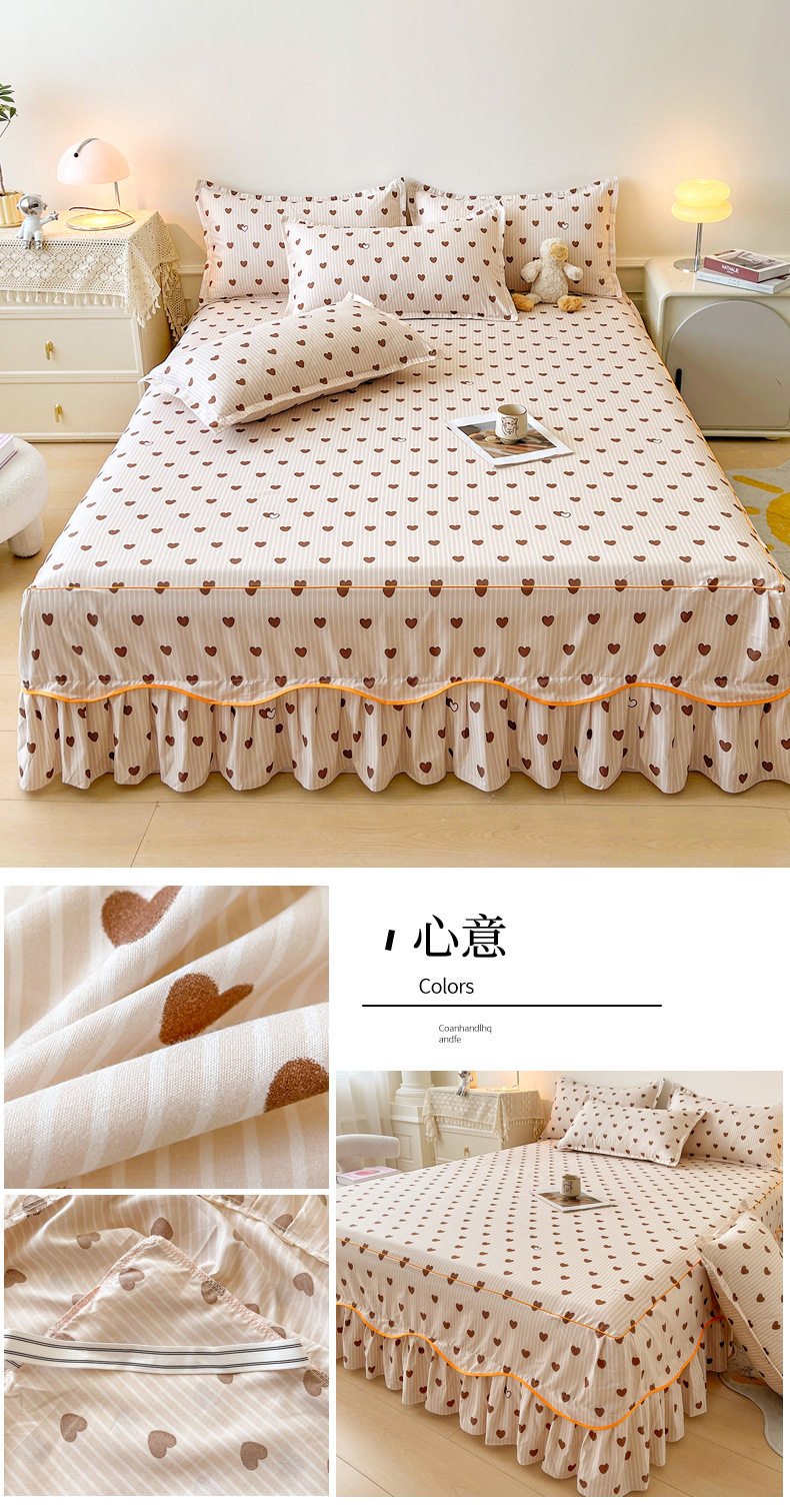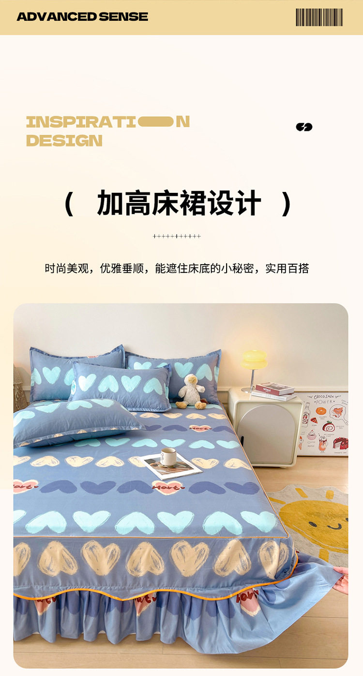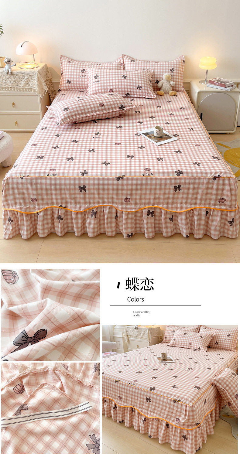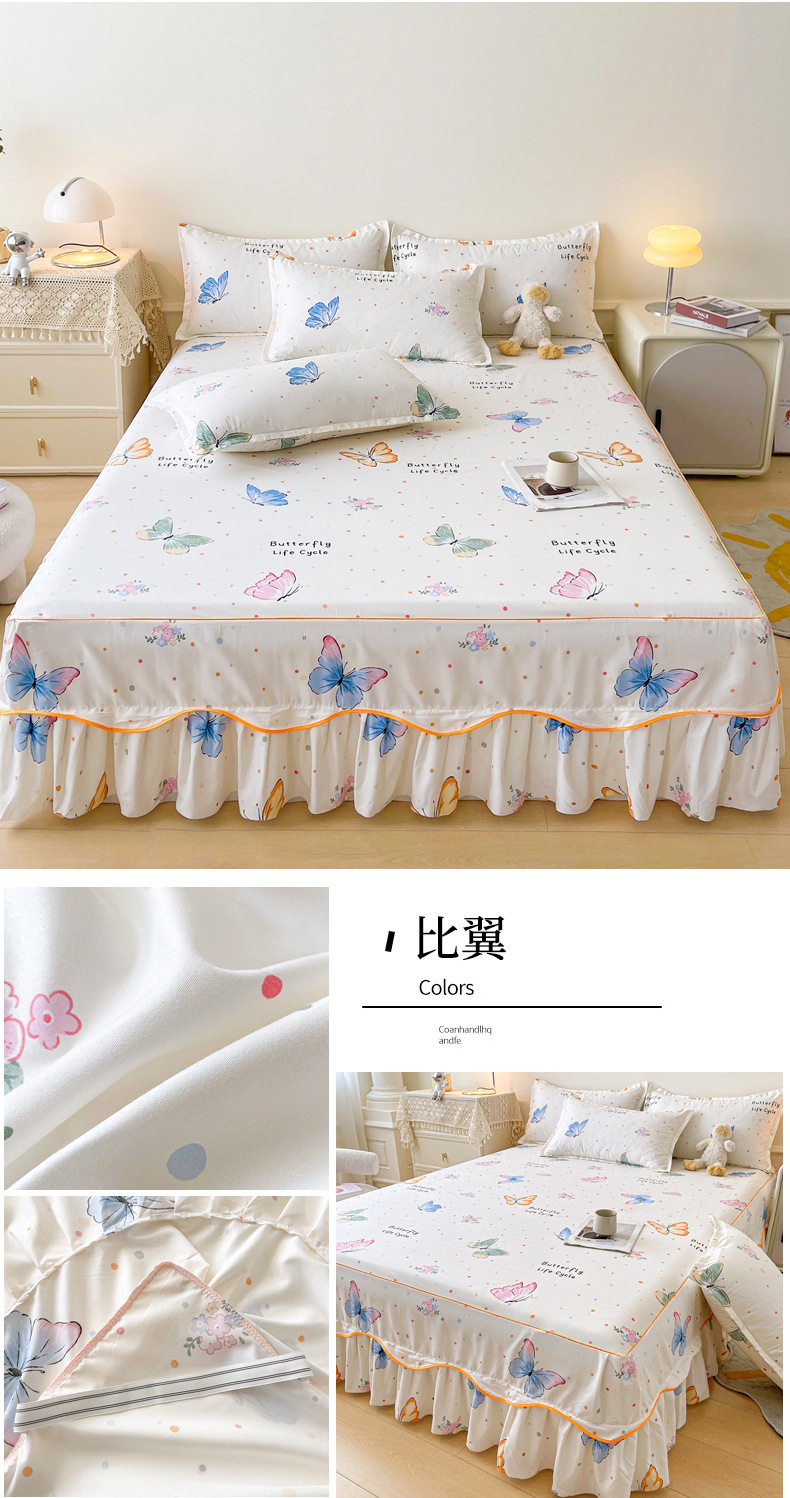 | Dimensions | 1.5 four-piece set [bed skirt 150*200cm, quilt cover 180*200, pillowcase 48*74*2]],1.8 four-piece set [bed skirt 180*200, quilt cover 200*230, pillowcase 48*74cm * 2]],1.8*2.2 four-piece set [bed skirt 180*220, quilt cover 200*230, pillowcase 48*74cm * 2]],2 m four-piece set [bed skirt 200*220cm, quilt 200*230cm, pillowcase 48*74cm * 2]],Single bed skirt 120*200cm,Single bed skirt 150*200cm,Single bed skirt 180*200cm,Single bed skirt 180*220cm,Single bed skirt 200*220cm,Pillowcase two 48*74 |