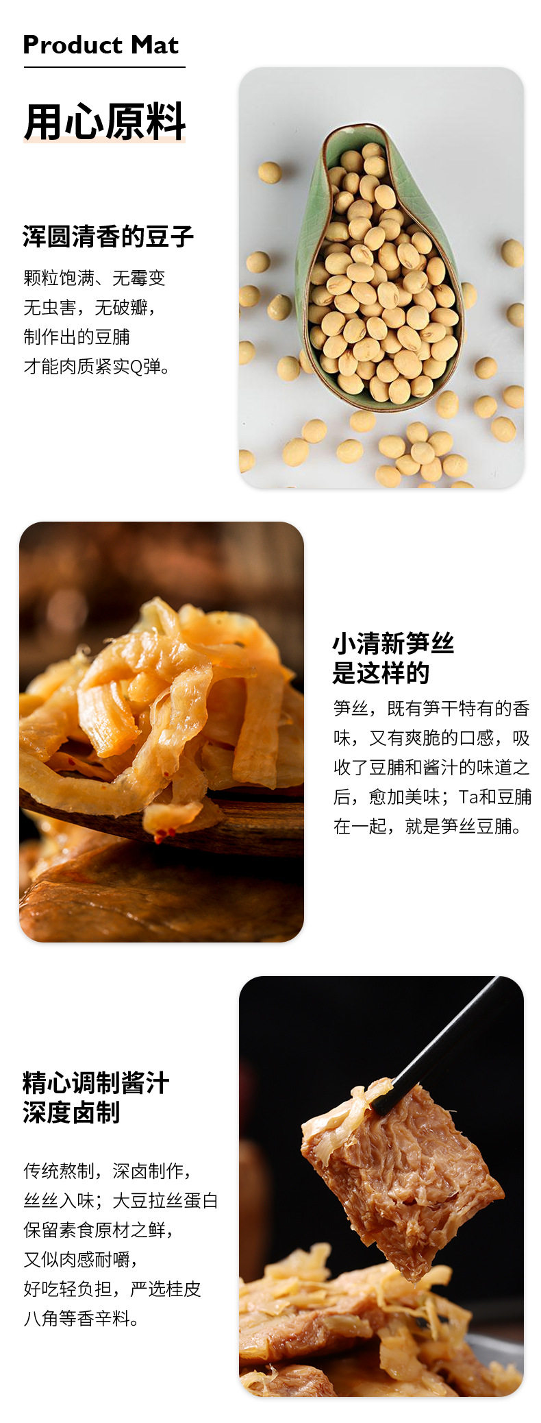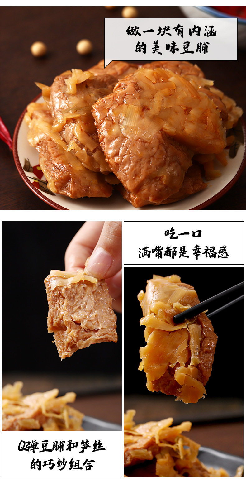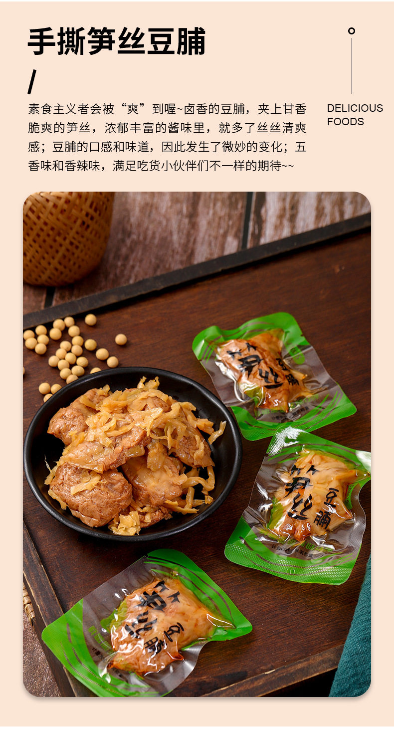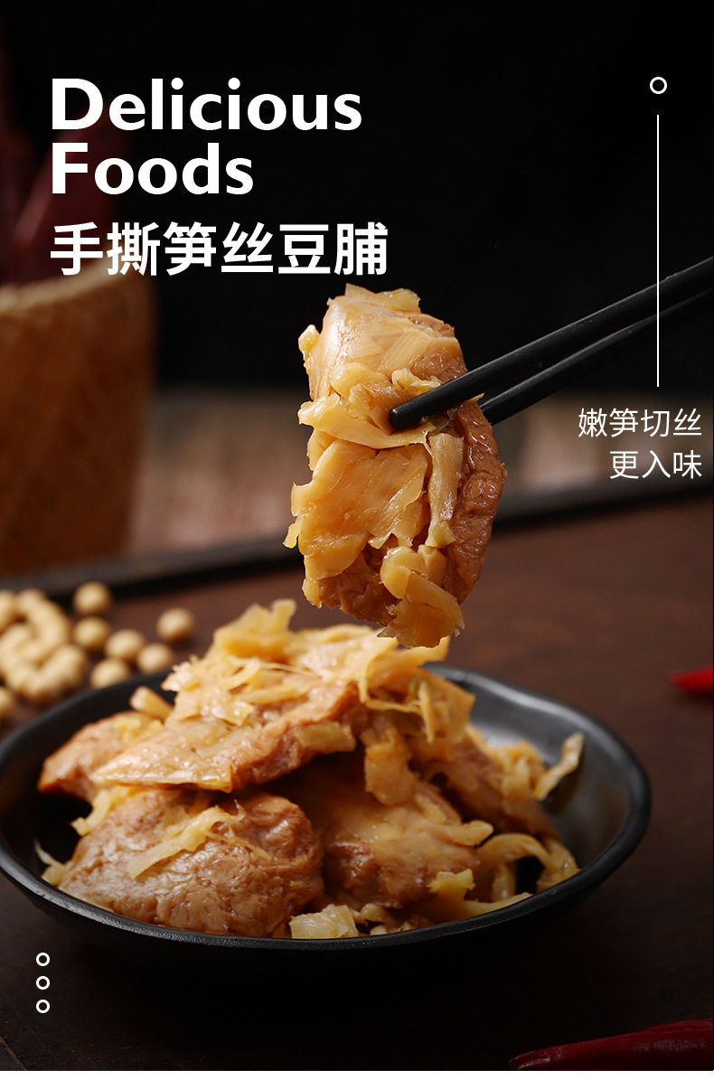 | Packaging specifications | Five-scented hand-shredded dried tofu with shredded bamboo shoots 250g,Spicy hand-shredded dried tofu with shredded bamboo shoots 250g |